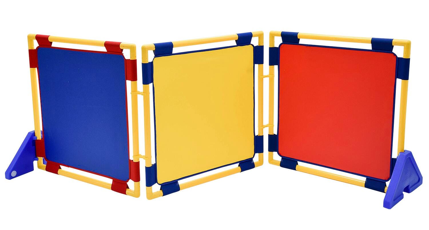 Set of 3 primary colored room dividers serve a variety of purposes such as creating a quiet space for rest time or separating activities. Panels easily attach with included double claw clips. The hygienic, easy to clean surface is stretched over durable plastic pipe and fittings. Panels easily fold for convenient storage when not in use. Set includes set of Cantilever Legs for stability. Panel Dimensions: 30-1/2 W x 1-1/4 D x 30-1/2 H inches.