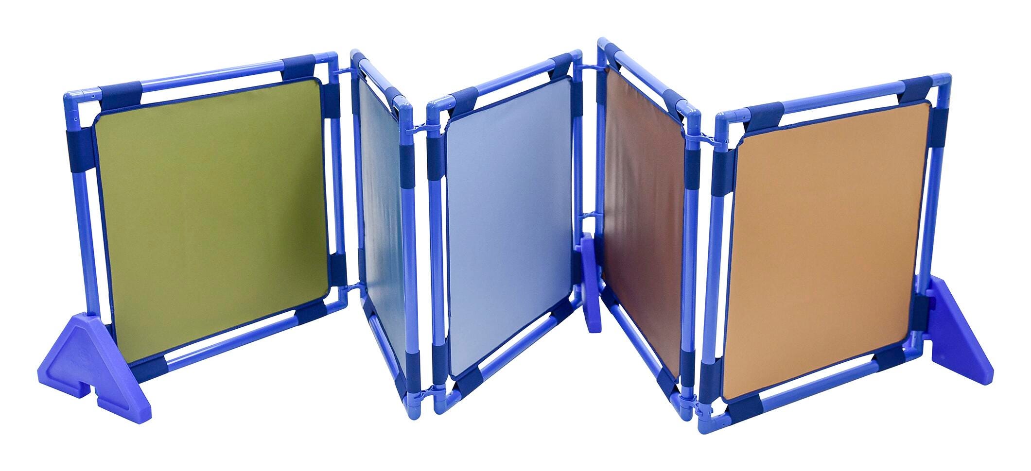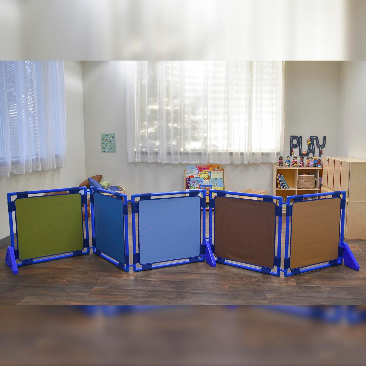 Create a designated space for relaxing and fun in your early learning space, then shift with ease to fit your dynamic space with these lightweight room dividers. This 5-panel set includes a variety of cozy earth-tone colors. The hygienic, easy-to-clean material surface is stretched over durable polystyrene pipe and fittings. Double claws create flexible hinges to link panels together and allow for foldable storage. Double Claw attachments and set of PlayPanel Legs included to provide stability. Panels measure 30-1/2 W x 1-1/4 D x 47-1/2 H inches.