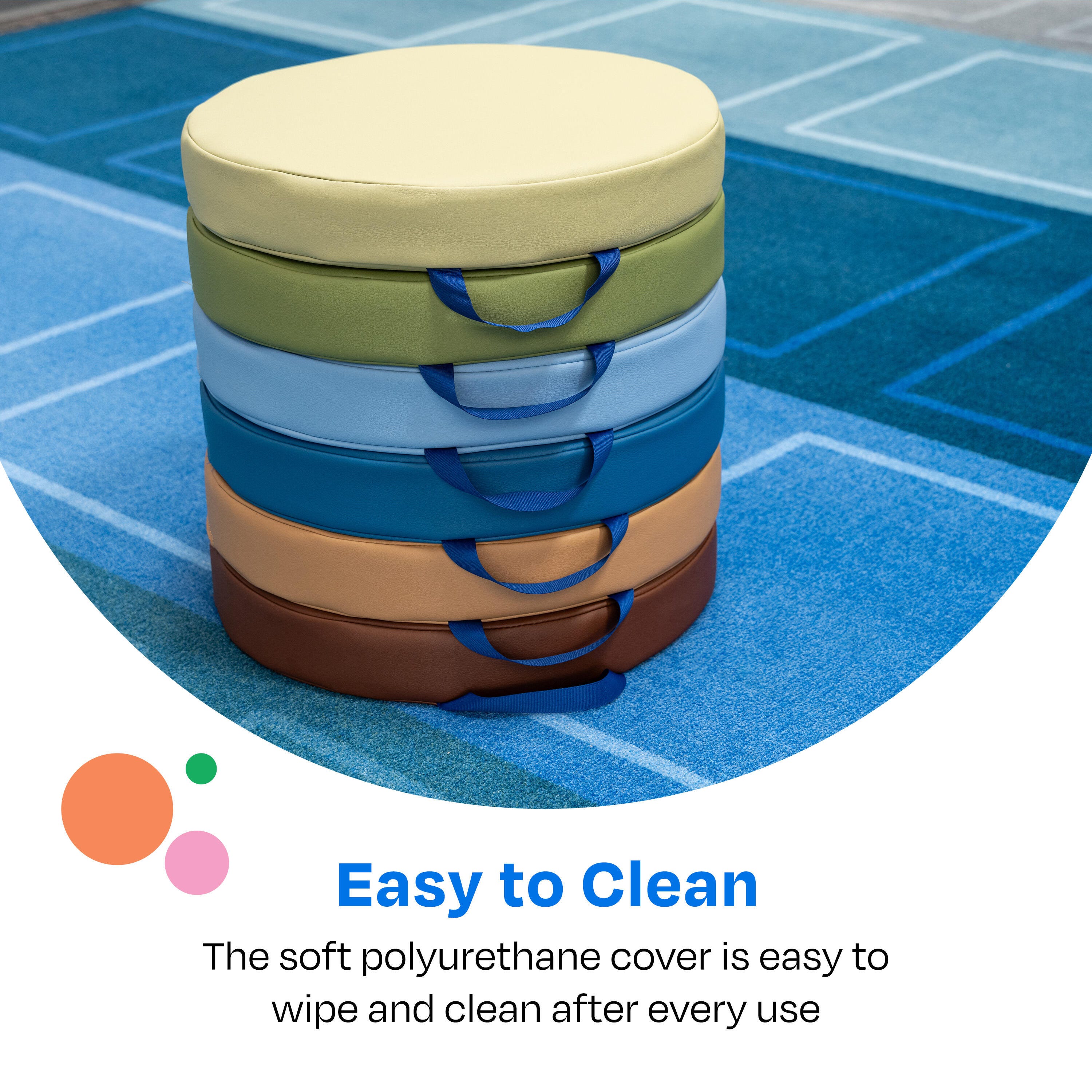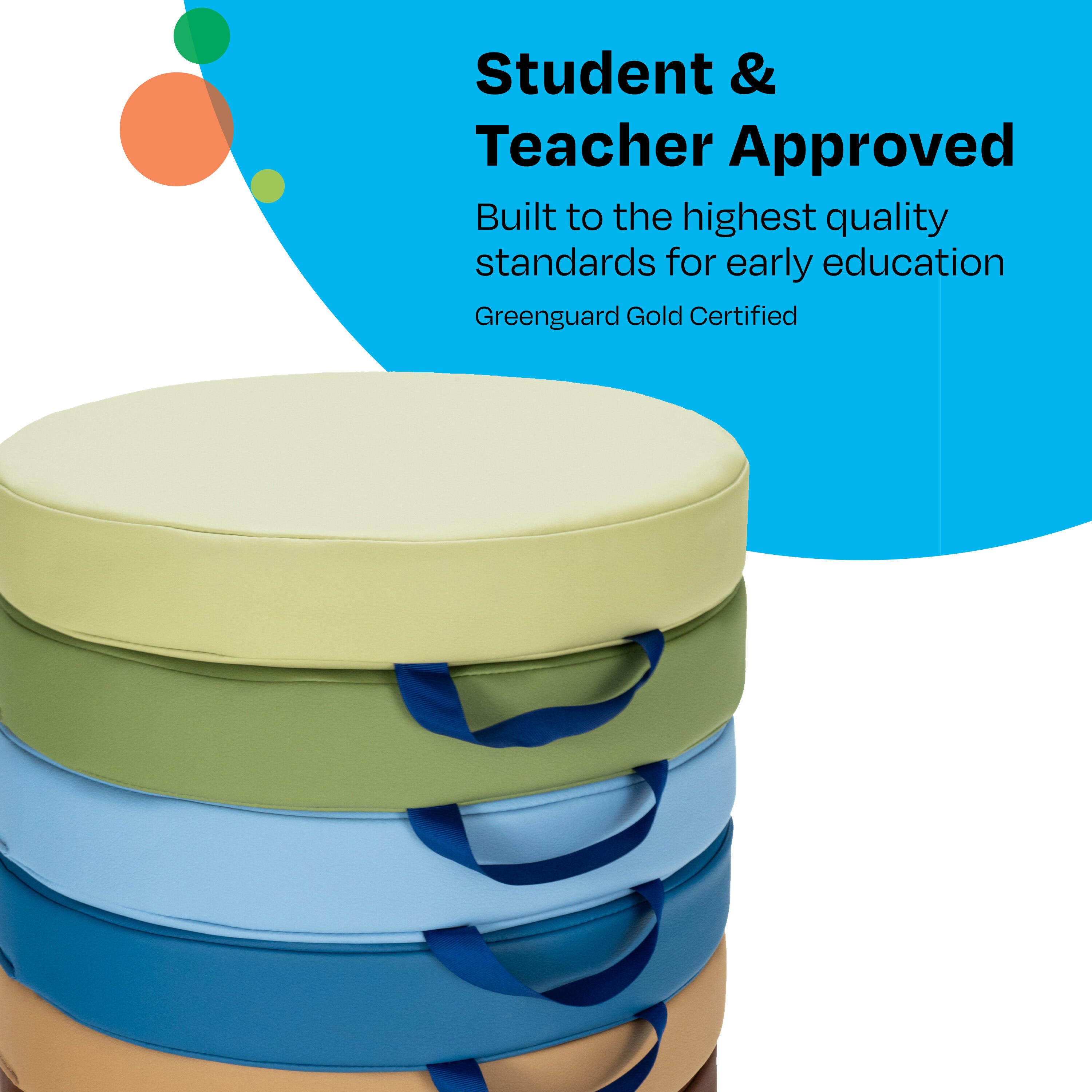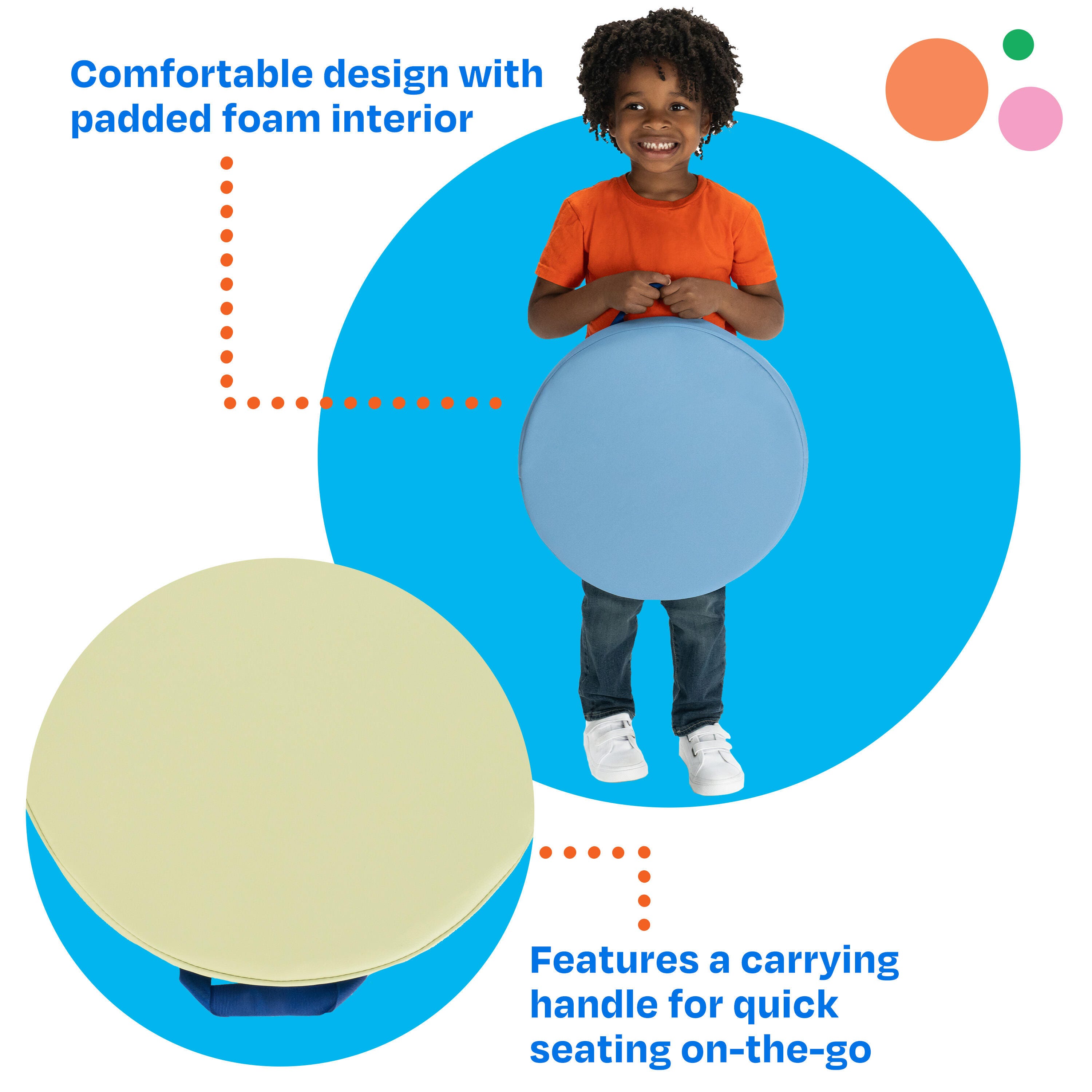 This Childcraft® Round Cushions pack features 6 floor cushions for classroom and indoor/outdoor use. The round seat cushions are soft and durable, giving students a comfy spot to sit anytime and anywhere. Whether playing, learning, or reading, take a cushion on the go. An attached carrying handle provides easy transportation and handling when moving from one spot to another. Use the comfy cushions indoors or outdoors as needed, and put them away when no longer in use. They’re easy to wipe clean to promote long-lasting use and hygiene. The Greenguard Gold Certification ensures furniture items are low emitting and meet or exceed the industry standards for classroom use.Features