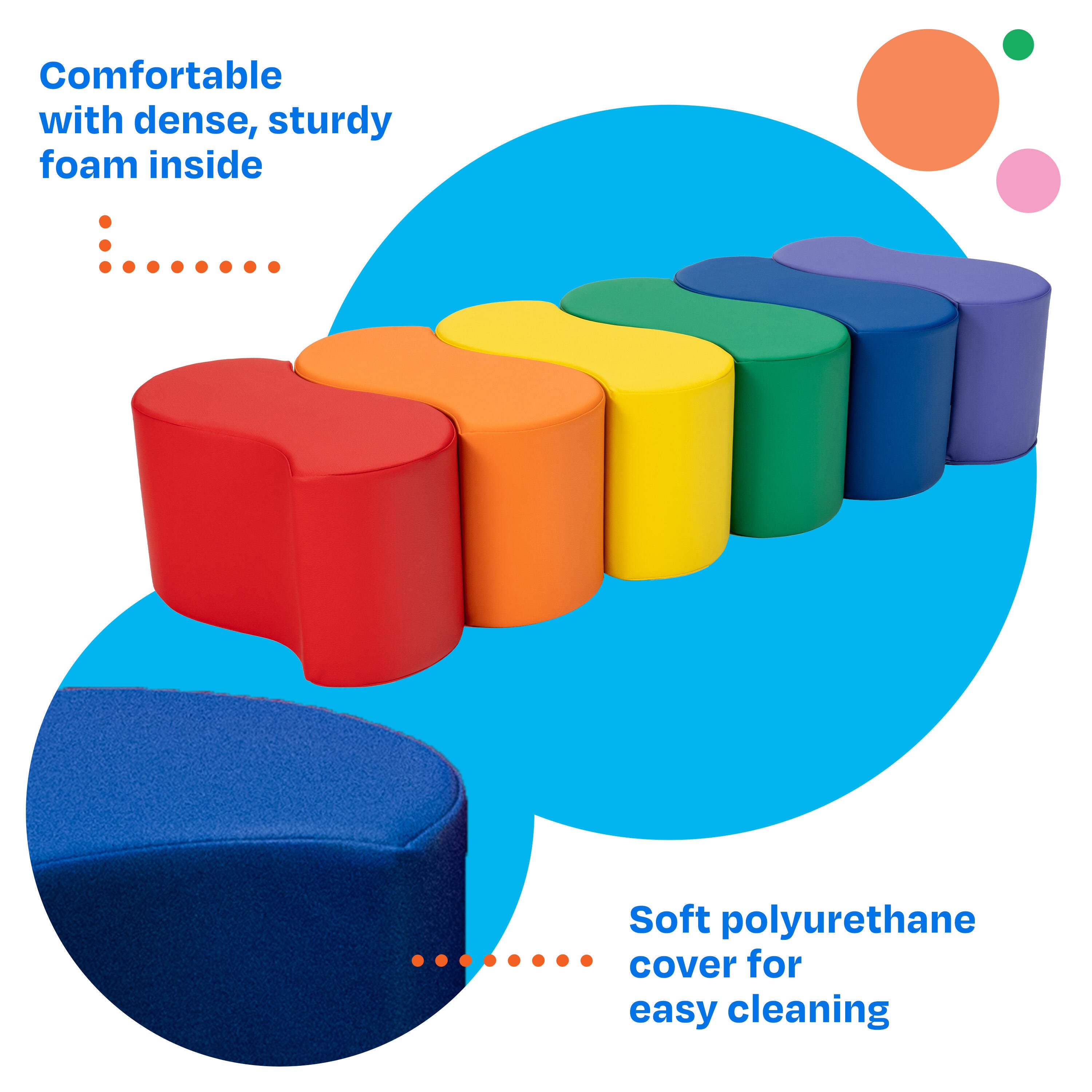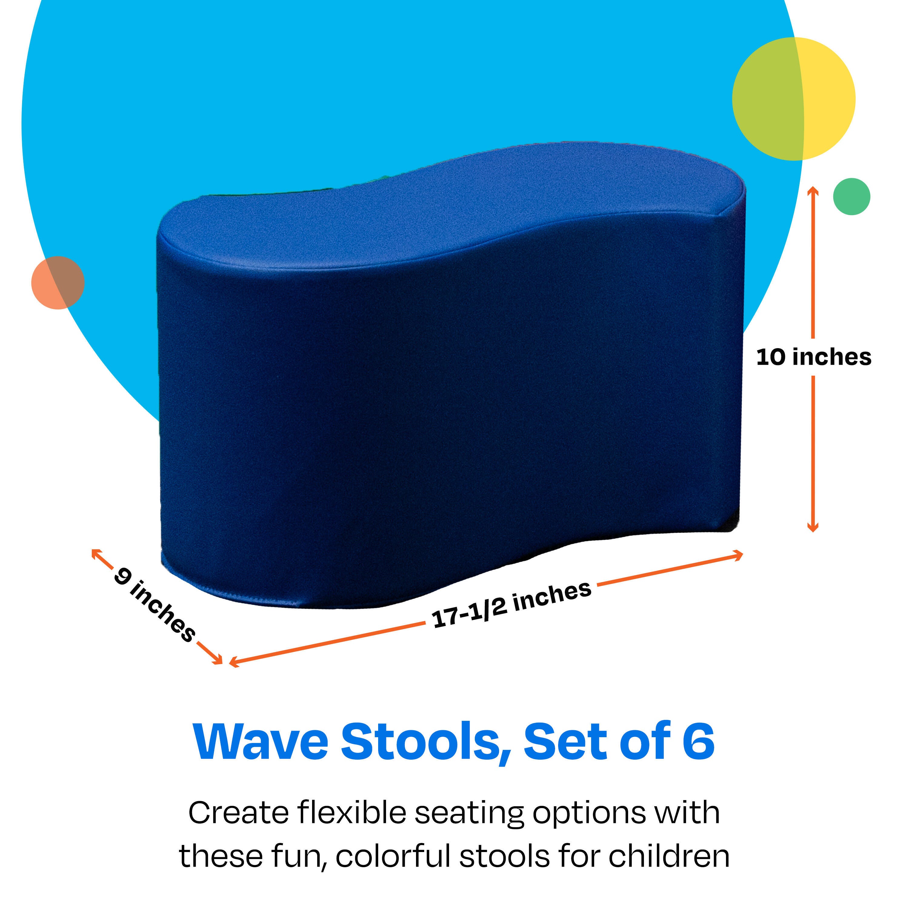 The Childcraft® Wave Stool Set provides a comfortable and playful seating solution for classrooms, libraries, play spaces, and reading nooks. Constructed with high-density foam and a soft yet durable polyurethane cover, these cushioned seats offer both comfort and stability. The curved wave design allows for multiple seating configurations, making them ideal for group learning, circle time, or independent reading. Their lightweight structure enables easy movement and quick reconfiguration to suit any classroom setting. Each children’s stool measures 9 W x 17-1/2 D x 10 H inches and is perfectly sized for young learners. The set includes 6 stools in vibrant primary colors (red, orange, yellow, green, blue, and purple).Features