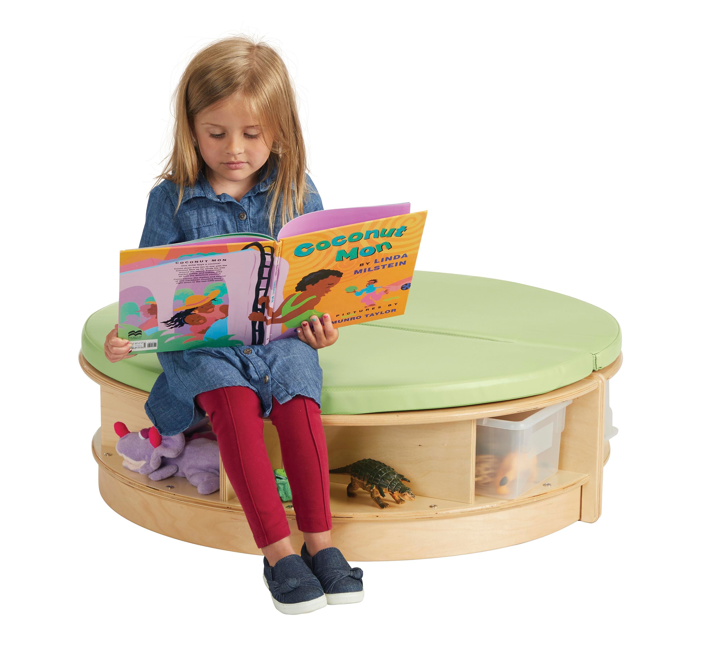 Create a circle of seating for reading or listening. Includes four clear cubbie-trays. Comfortable key lime cushions provide a pop of color and are easy to clean.