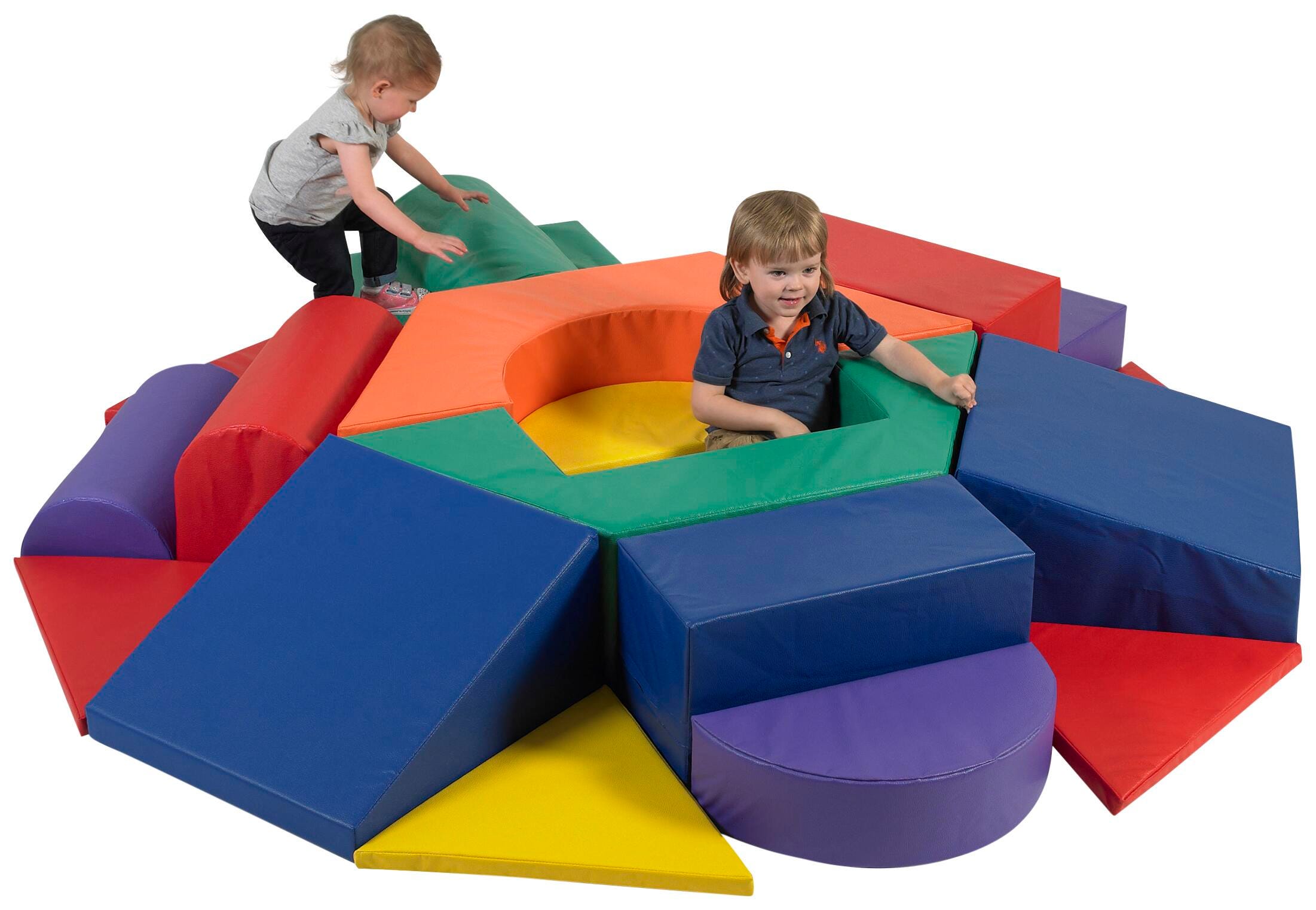 Encourage active play, exploration, and early gross motor development with the Children’s Factory Baby Nuts and Bolts Climber. Designed for toddlers and preschoolers, this oversized soft play structure sparks imagination while providing a safe, cushioned environment for climbing, crawling, sliding, and balancing. Its vibrant colors and modular design promote interactive play, helping children build confidence, coordination, and spatial awareness. The climber includes nineteen individual pieces with hook and loop fasteners to form a center-of-the-room climber that stimulates imagination. Pieces can be taken apart to make different configurations. Bright colored shapes include steps, ramps, bumps, semi-circles, equilateral triangles and a hidey hole. Measures 85 L x 87 W x 12 H inches. Ages: 8 months to 3 years.