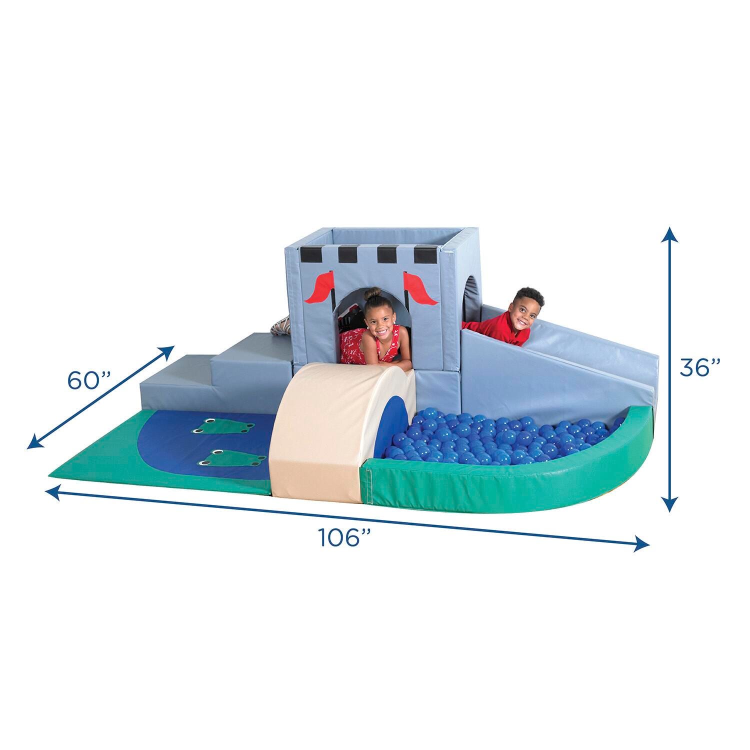 Excitement runs high while young ones climb up the stairs to defend their castle. Little knights can continue exploring this kingdom by exiting down the ramp with rounded sides, or climb over the 18-inch high solid dense foam bridge to the moat. Two alligators are lurking in the moat mat. Opposite the moat is a 41 L x 31 W inches ball refuge holding 60 balls. THE CLIMBER MUST BE PLACED AGAINST A WALL FOR SAFE PLAY. Moat mat measures 45 L x 36 W x 1 H inches thick. Ramp measures 36 L x 23 W inches. Play floor measures 106 L x 60 W x 17-1/2 H inches play floor height, with a 36-inch overall height. Perfect for ages 2 to 5.Features
