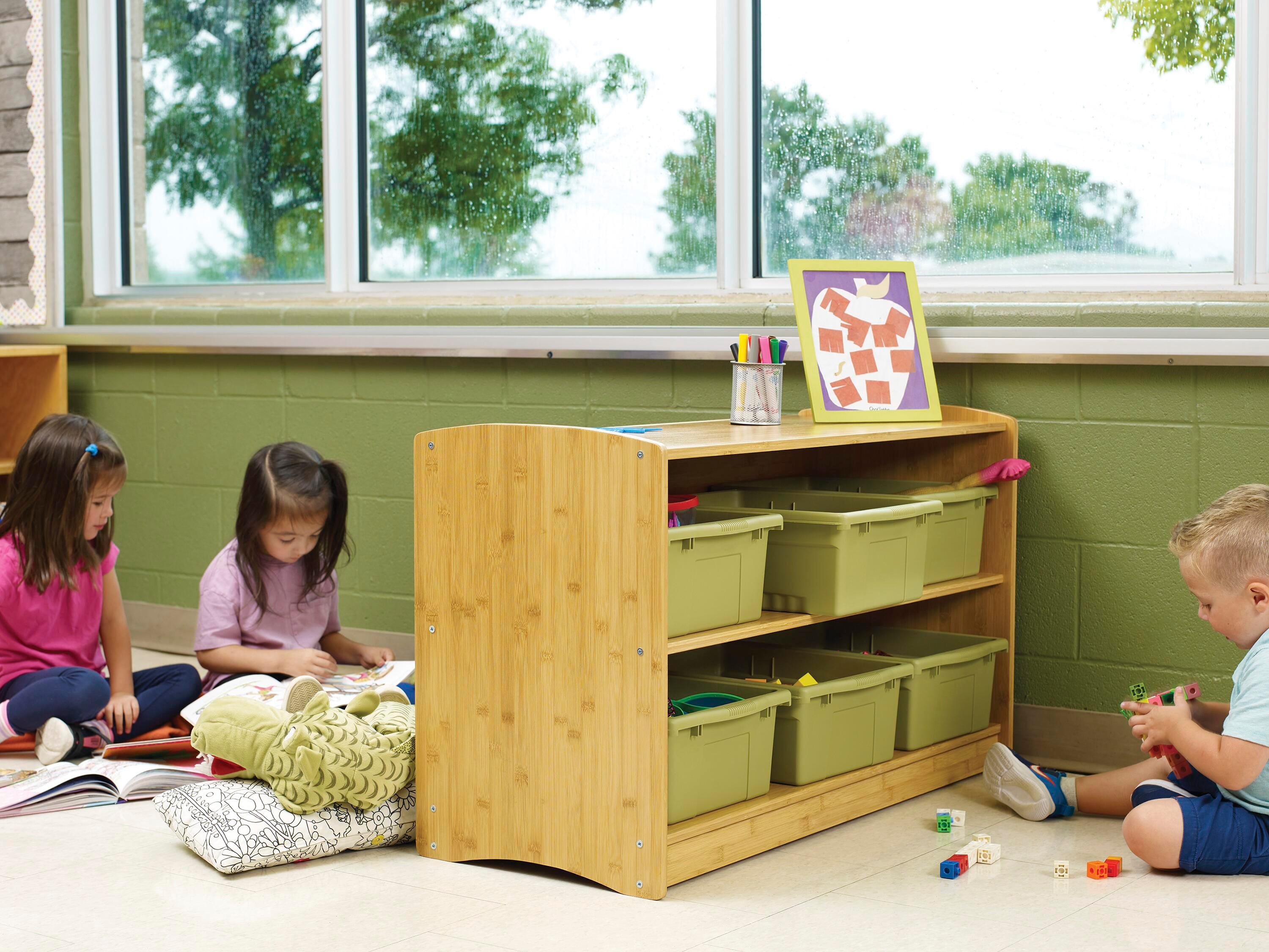 The Bamboo Book Shelf has a natural aesthetic suited for neutral and early childhood environments. With three shelves for storage and optional six-tub configurations, this Bamboo Book Shelf is at the ideal height for ECE students and educators to access learning materials, books and other supplies. Bamboo is a renewable resource that grows quickly and sequesters carbon, unlike steel which produces carbon. For every bamboo product purchased, Copernicus will make a donation to conserve natural panda habitat through the World Wildlife Fund.Features