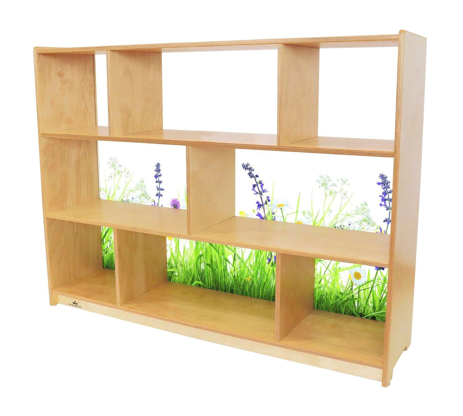 Create a unique nature-inspired divided area! This 36-in height cabinet features a safe, shatterproof clear acrylic back panel imprinted with an inviting nature scene that brightens and defines any room environment and provides maximum child supervision. Three fixed shelves provide three divided storage compartments on the upper and lower shelves and two spacious compartments on the middle shelf. The cabinet connects to other pieces in the Nature View Room Divider Collection without the use of unsightly plastic connectors to create a beautiful, flexible divided area layout. Constructed with no visible screws or joinery for a nice finished furniture look. All corners and edges are rounded over and finished smooth for safety. Floor glides included. Need a different height? Check out our WB0247 24-in height or WB0248 30-in height Nature View Cabinets [each sold separately].