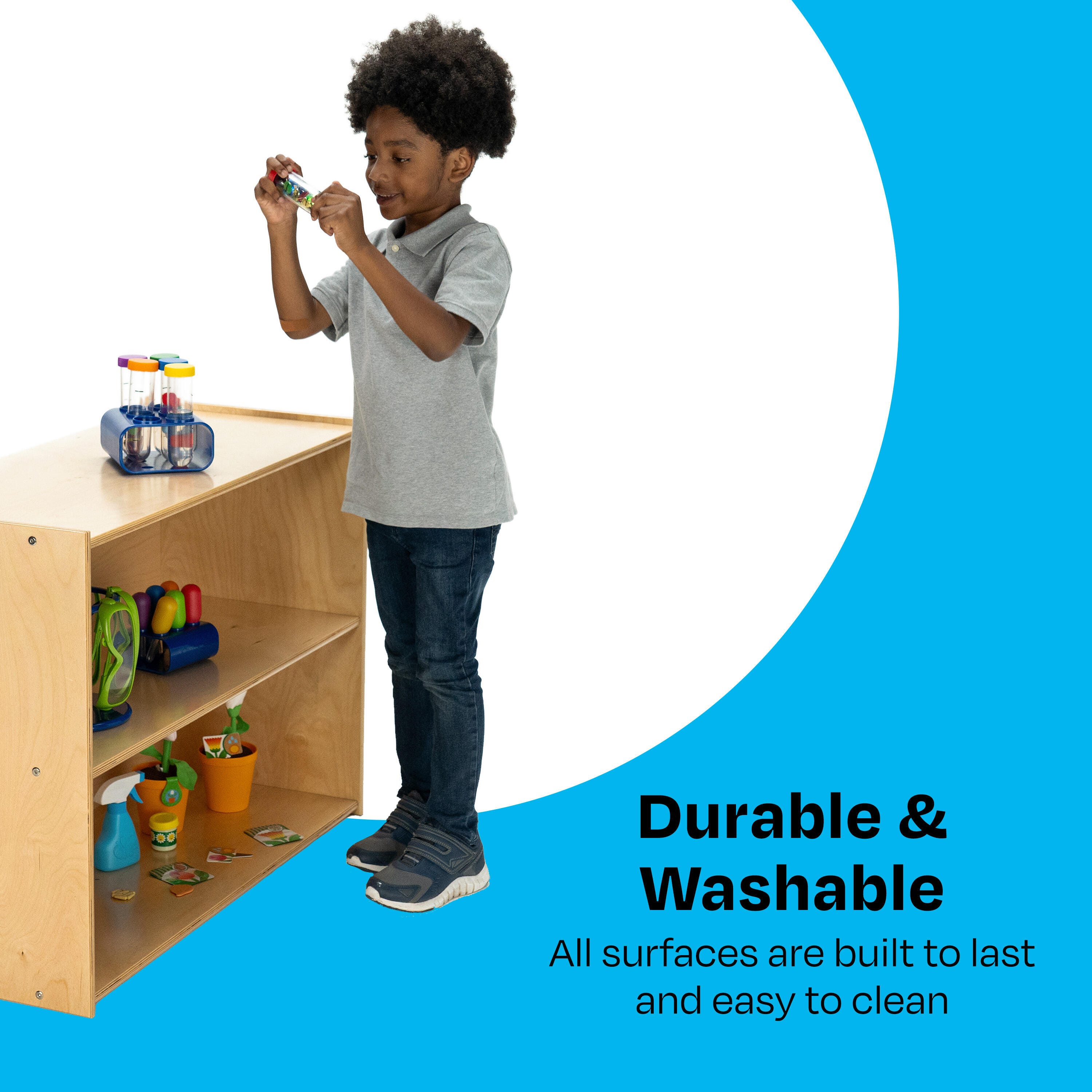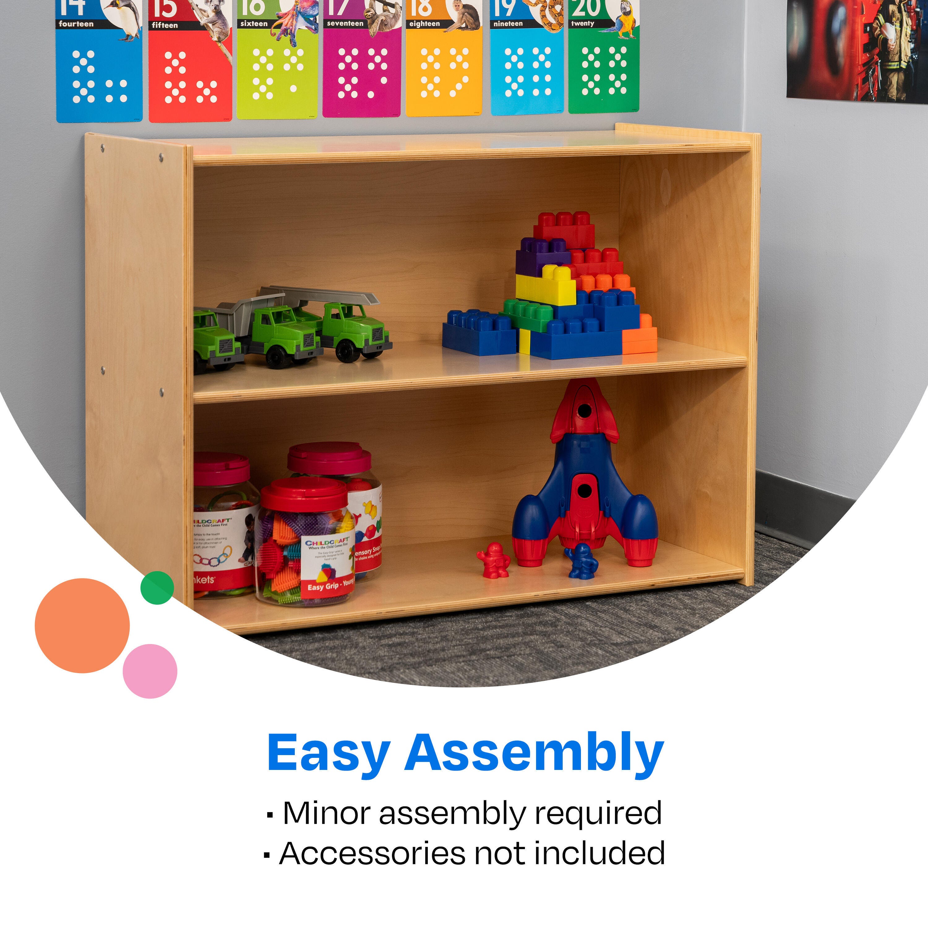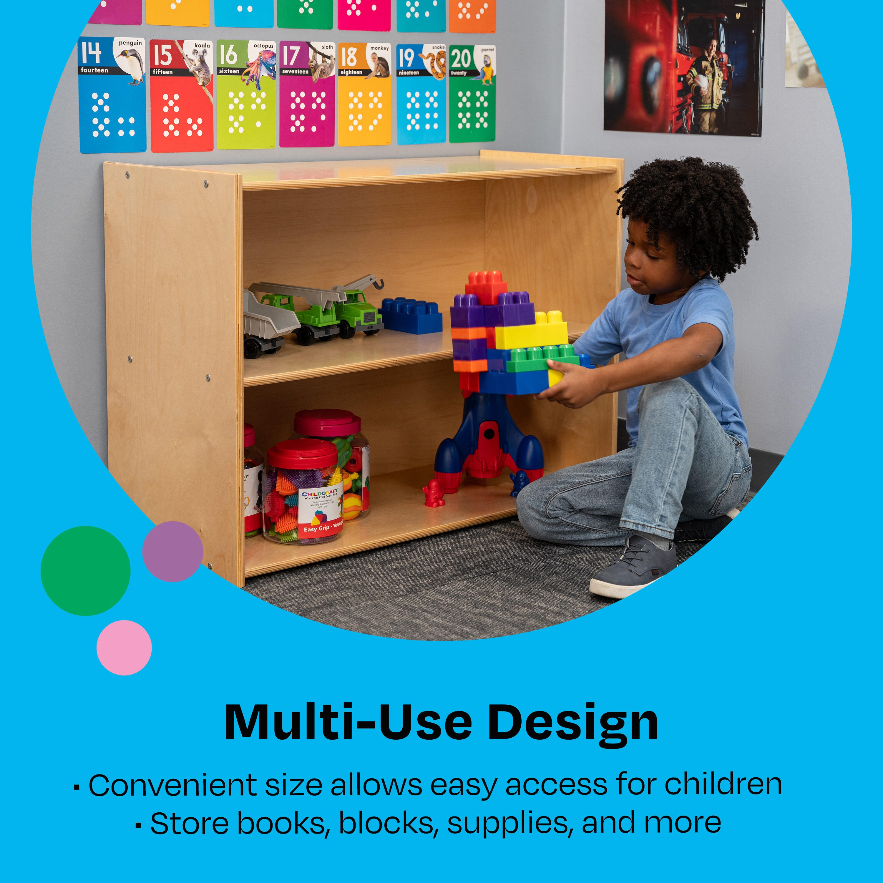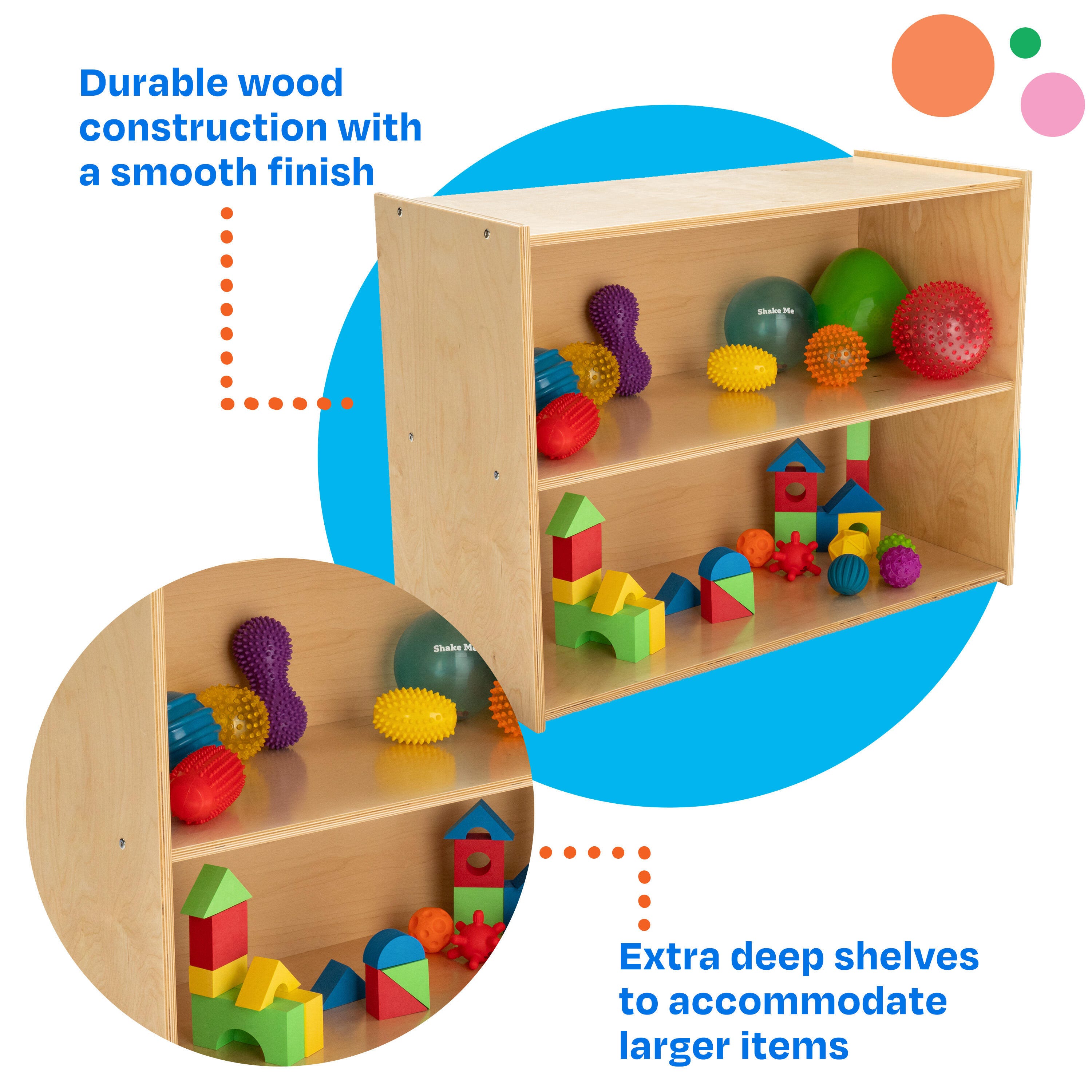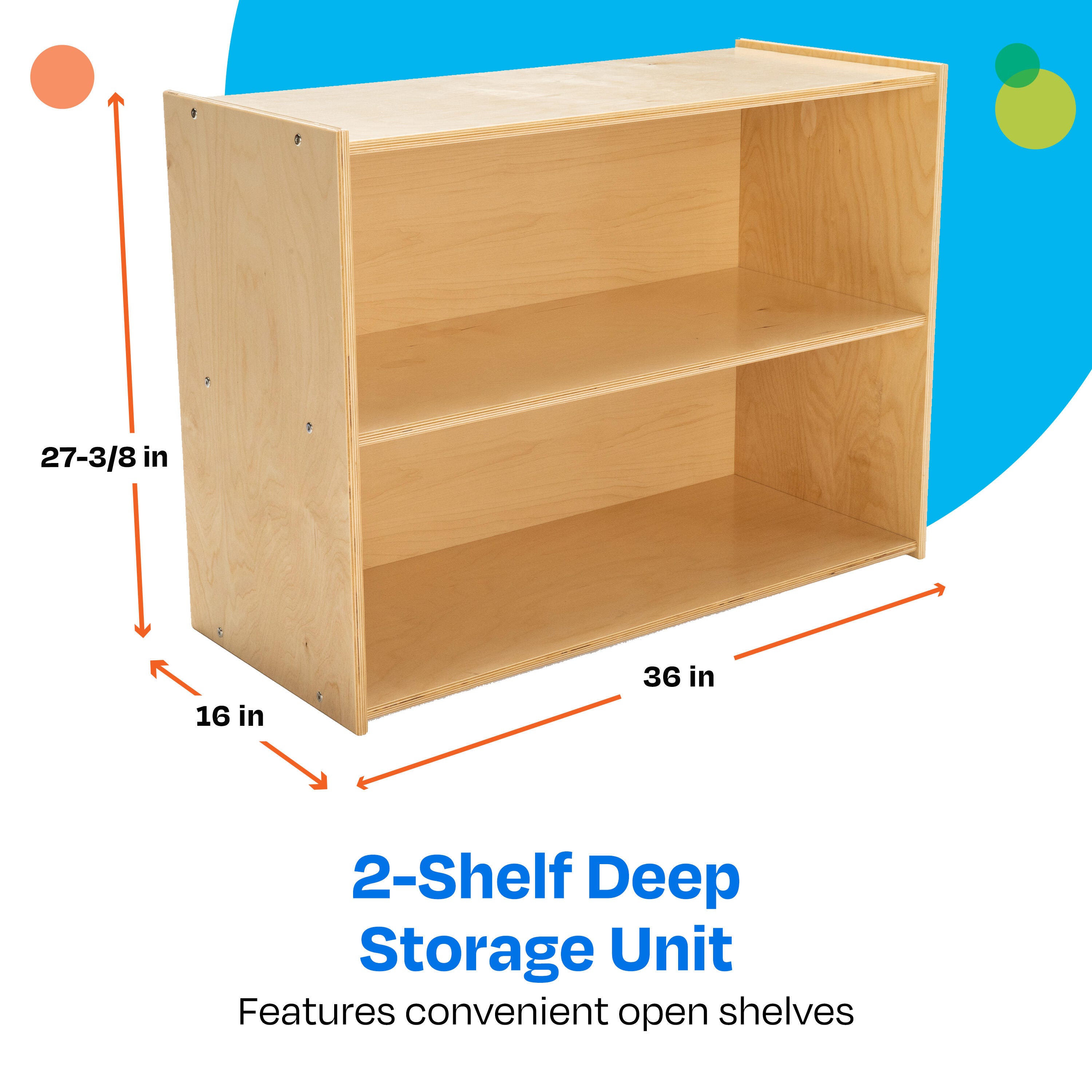Description Childcraft® 2-Shelf Deep Shelf Storage Unit is easy to assemble and made with a durable design. Use the wooden shelves for preschool, kindergarten, daycare centers, homes, and beyond. The deep storage shelves are great for storing and organizing books, games, and manipulatives. Crafted for long-lasting use, this classroom furniture piece is made of durable birch plywood that’s easy to wipe clean. Assembly is required. This classroom bookcase measures 36 W x 16 D x 27-3/8 H inches.Features Features deep shelves to hold more items all in one spot Classroom bookshelves with an open design are teacher and student-friendly A low height and wide design helps young children easily reach shelves GREENGUARD Gold Certified for use in children’s rooms and settings Team up with Childcraft to design and outfit your early education environment; we have 75+ years of experience and offer a limited lifetime warranty Committed to the 5C’s of Childcraft: Child-safe, Crafted with quality, Constructed for durability, Complete solutions, and Cleanable design Includes: 1 Wooden Deep Shelf Storage Unit