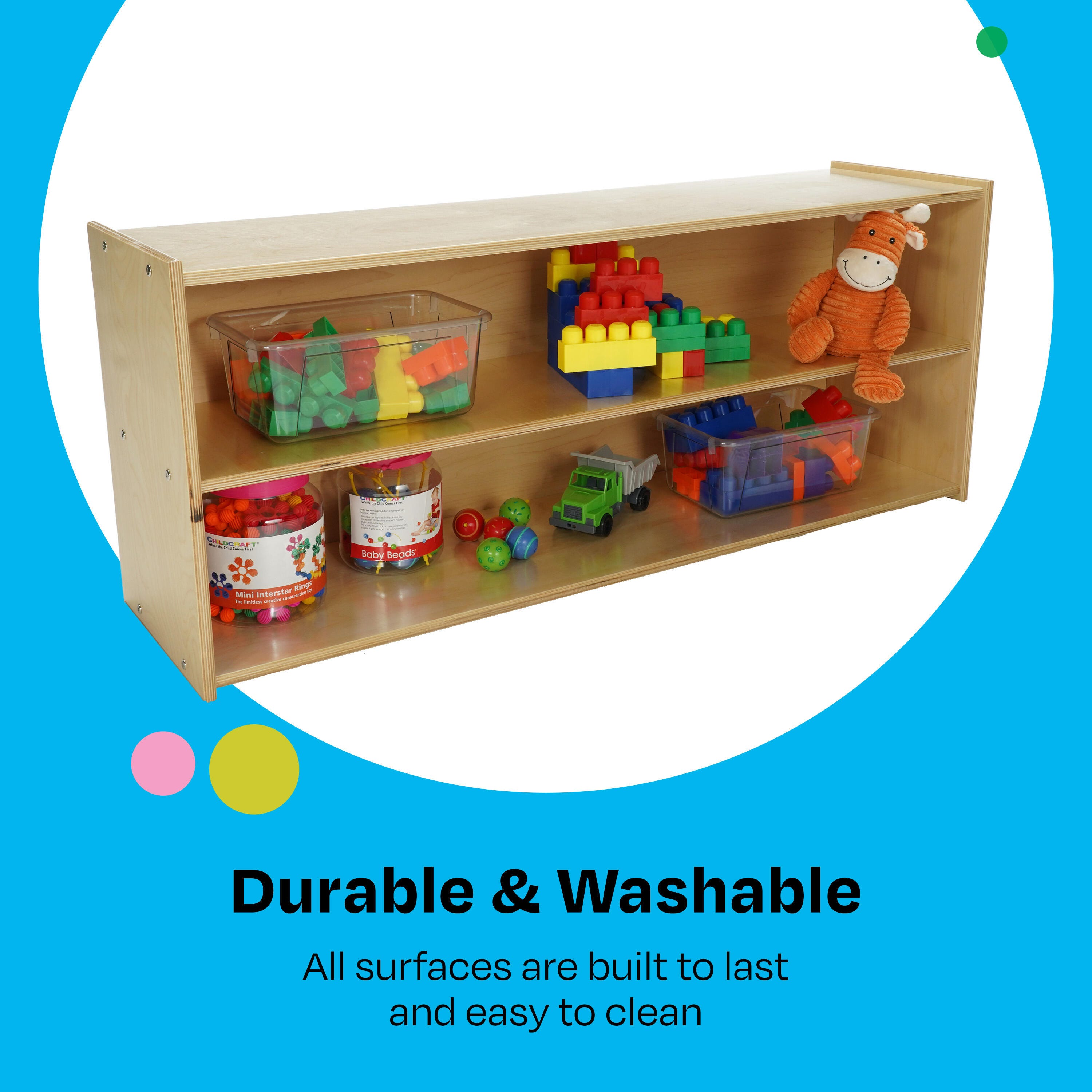 Childcraft® 2-Shelf Storage Unit for Classrooms is easy to assemble and made with a durable design. Use the toddler-height wooden shelves for preschool, kindergarten, daycare centers, homes, and beyond. A shorter design is the ideal height for young children. The storage shelves are great for storing and organizing games, books, manipulatives, and toys. Crafted for long-lasting use, this classroom furniture piece is made of durable birch plywood that’s easy to wipe clean. Assembly is required. This item comes with a limited lifetime warranty.