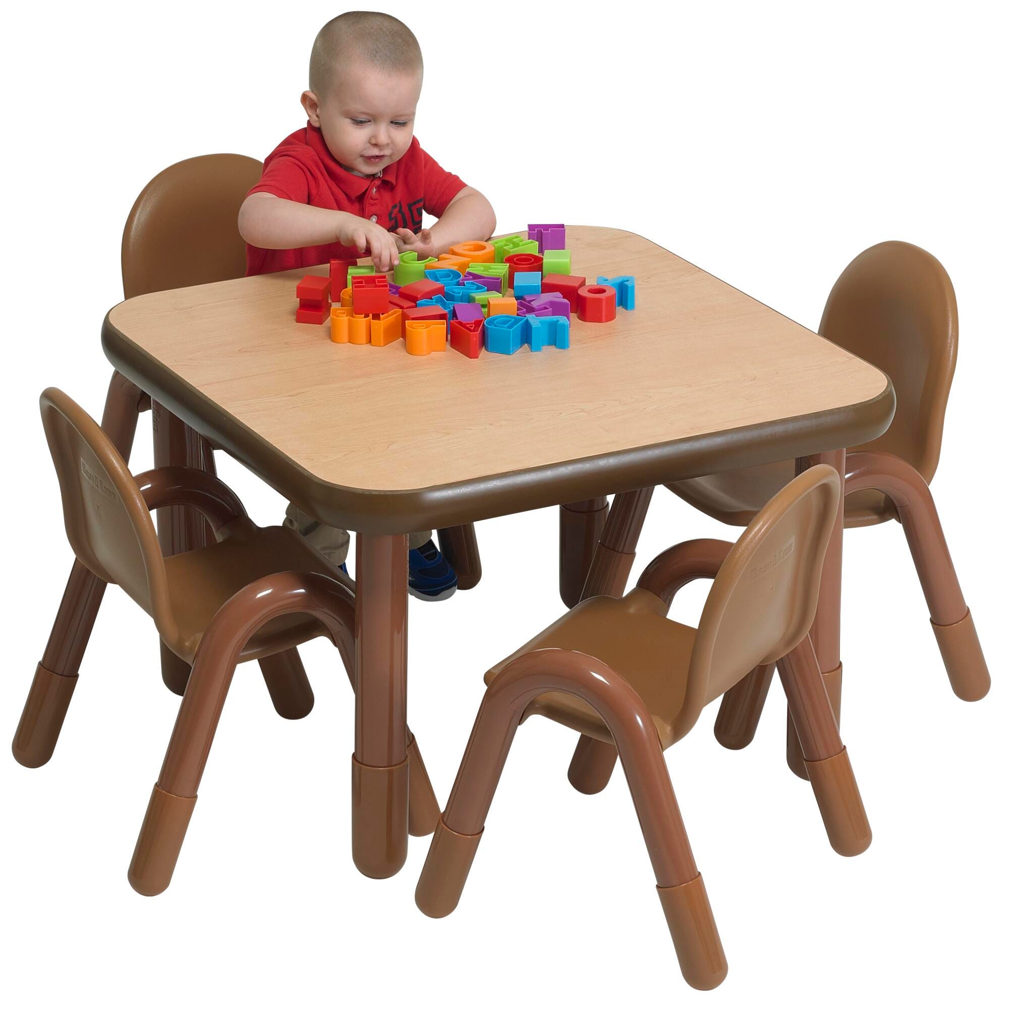 Angeles Baseline Square Pre-School Table and Chair Set includes 30 W x 30 D x 20 H inches natural brown table and 4 chairs in caramel brown, each measuring 11 inches high.