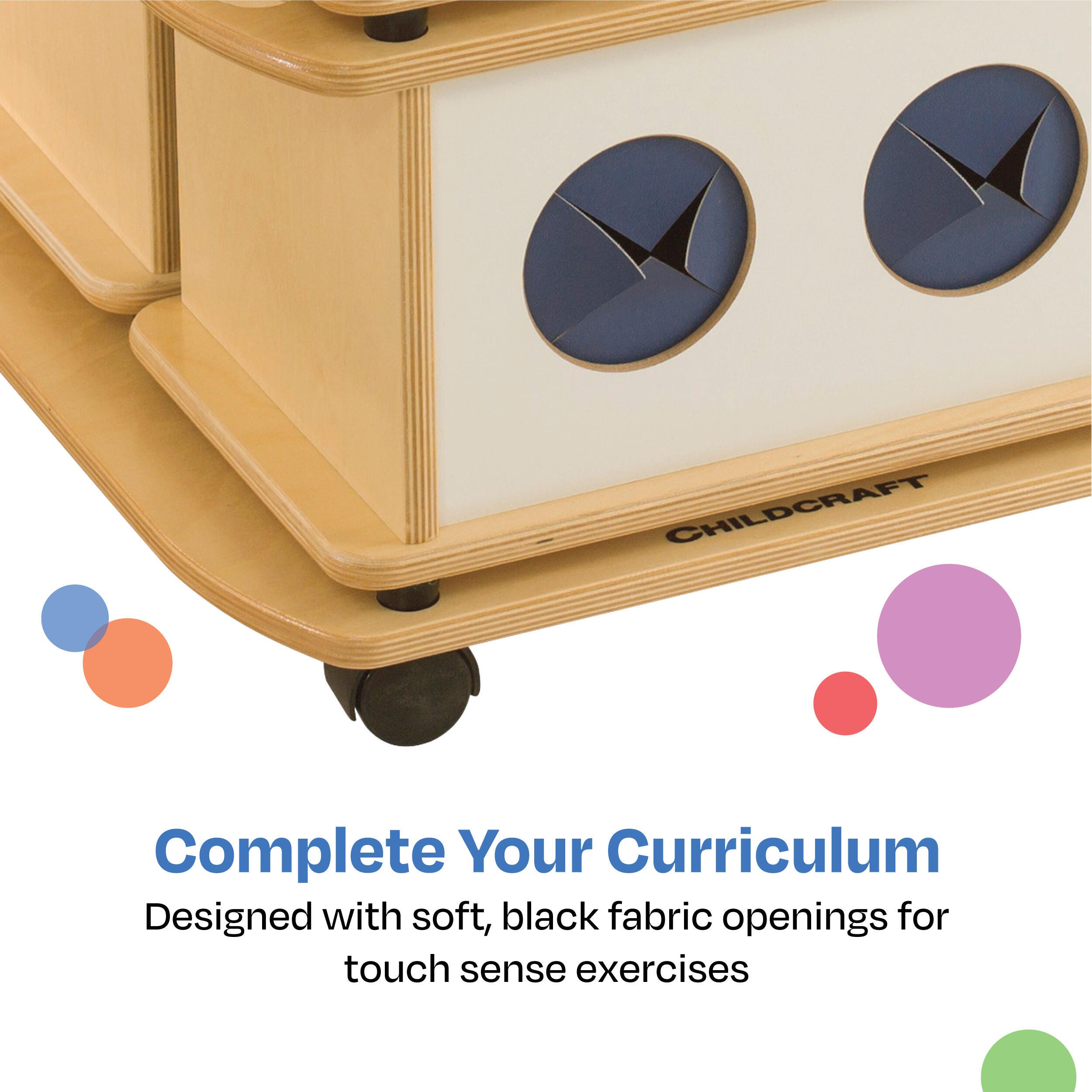 Equip your early childhood classroom with this stacking sensory table with soft fabric openings for tactile exploration.