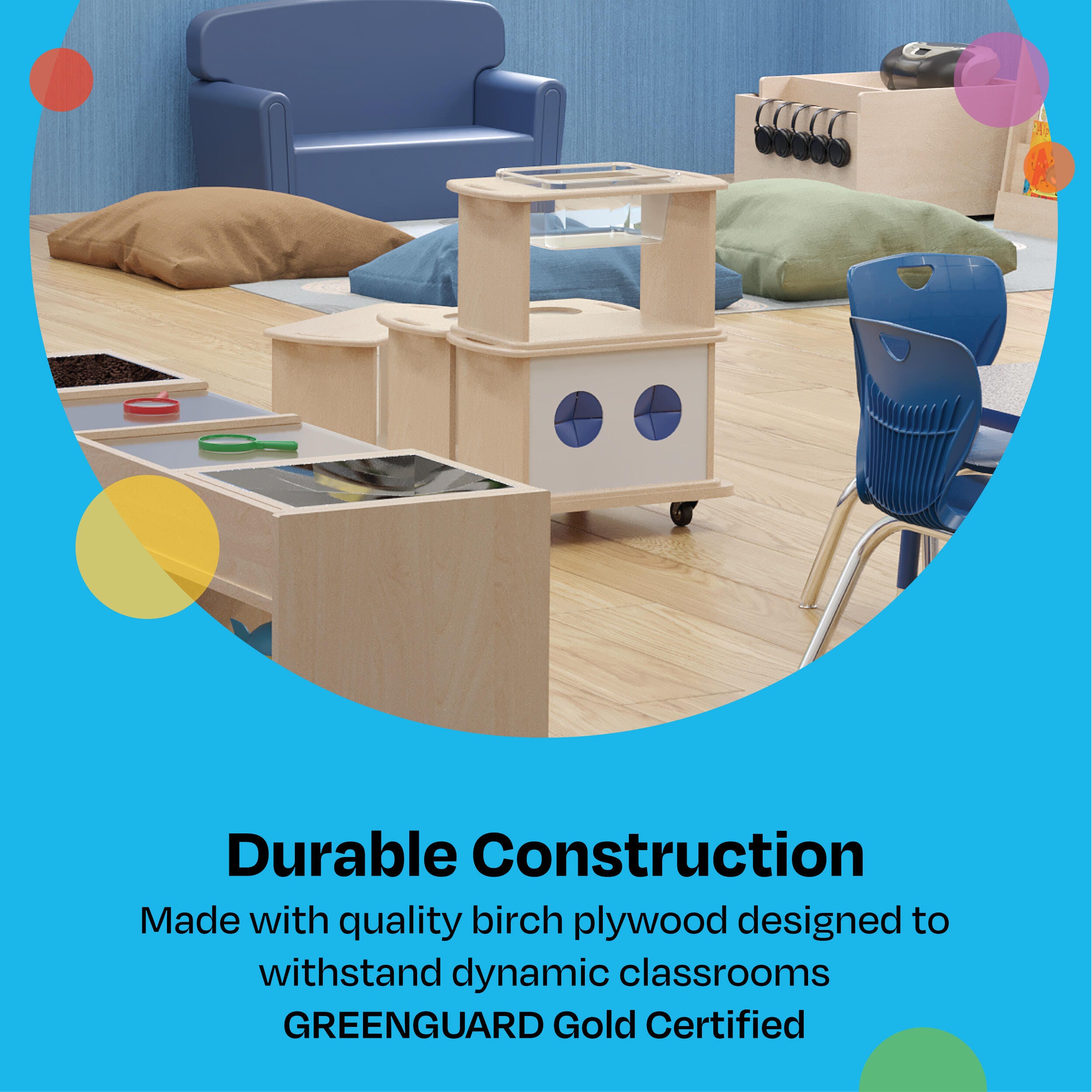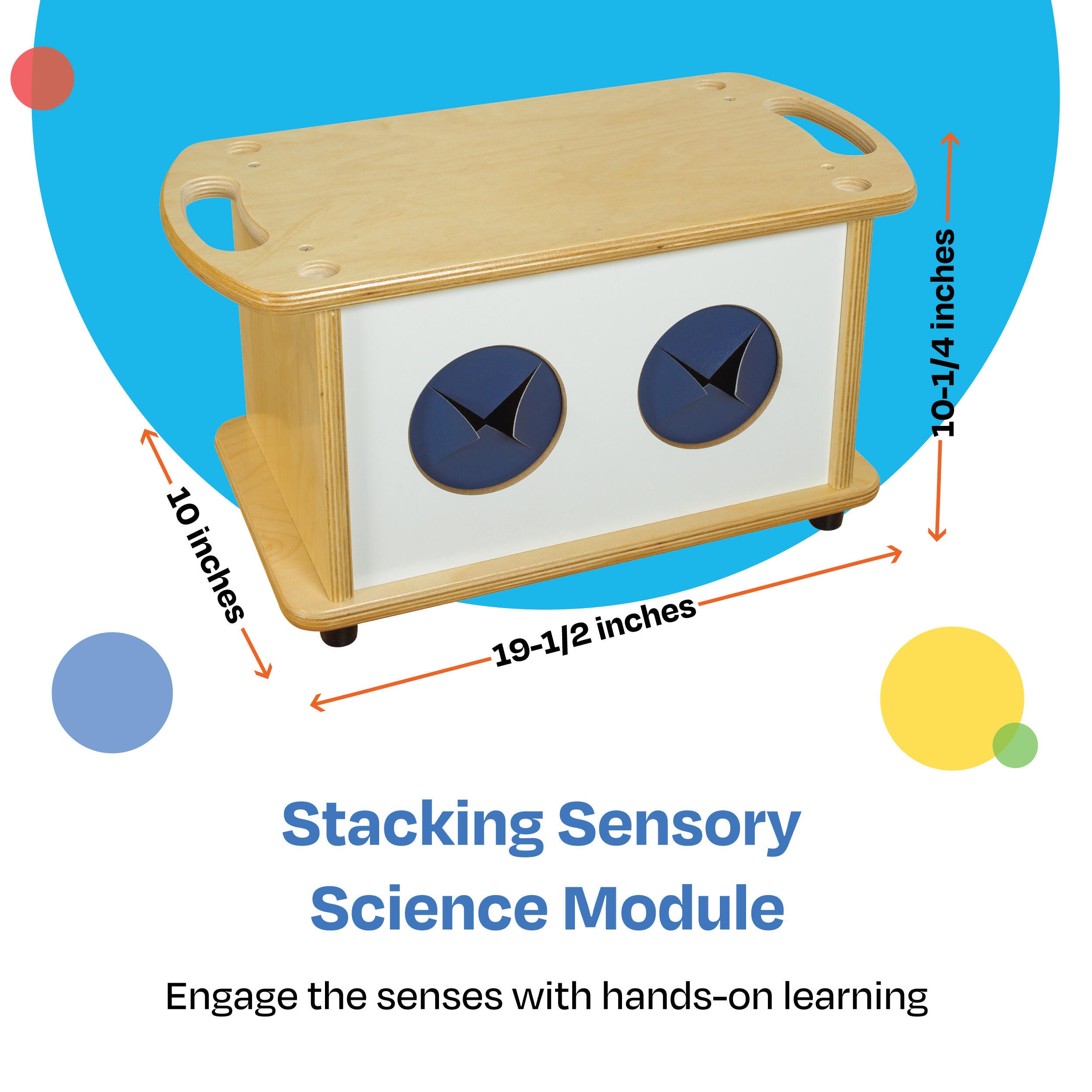 Childcraft® Stacking Sensory Science Module Sensory Table includes two openings for a touch experience of hidden objects. Use the sensory table for hands-on learning and exploration. The portable science cart features a sensory experience for young children, and has smooth handles for easy carrying and feet that nest for stacking with our other small tables. The interactive activity center is great for building fine motor skills and developing sensory stimulation. Crafted for long-lasting use, this science station is made of durable birch plywood that’s easy to wipe clean. Comes fully assembled. This sensory table measures 19-1/2 W x 10 D x 10-1/4 H inches.