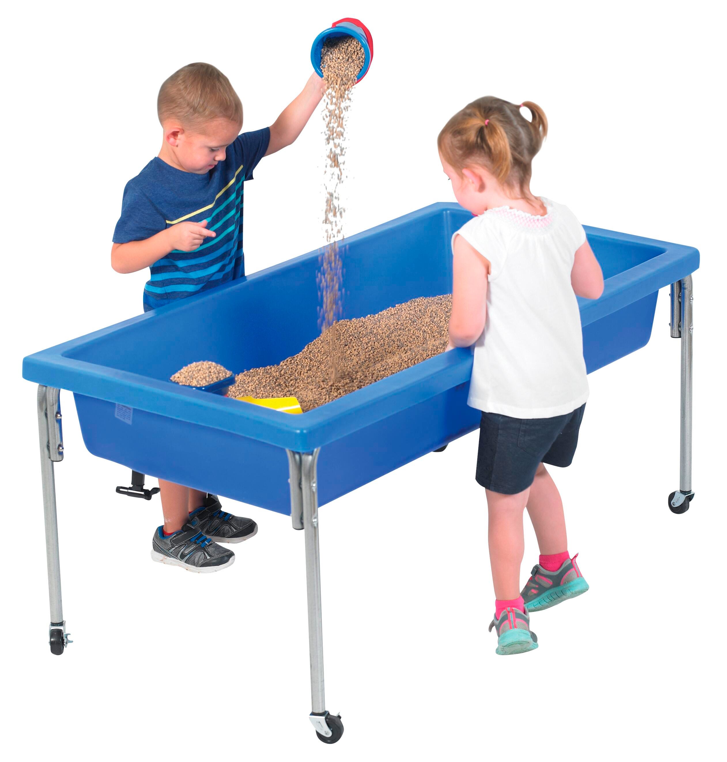 Fill this versatile table with water, sand, or Kidfetti (items 1428020 & 1380276, sold separately) and provide children with a relaxing and stress-reducing sensory experience. This extra-large table allows four to five children to play at once. The 9-inch deep tub is made of sturdy, weather-proof plastic with one drain valve and has a rust-proof galvanized steel frame.