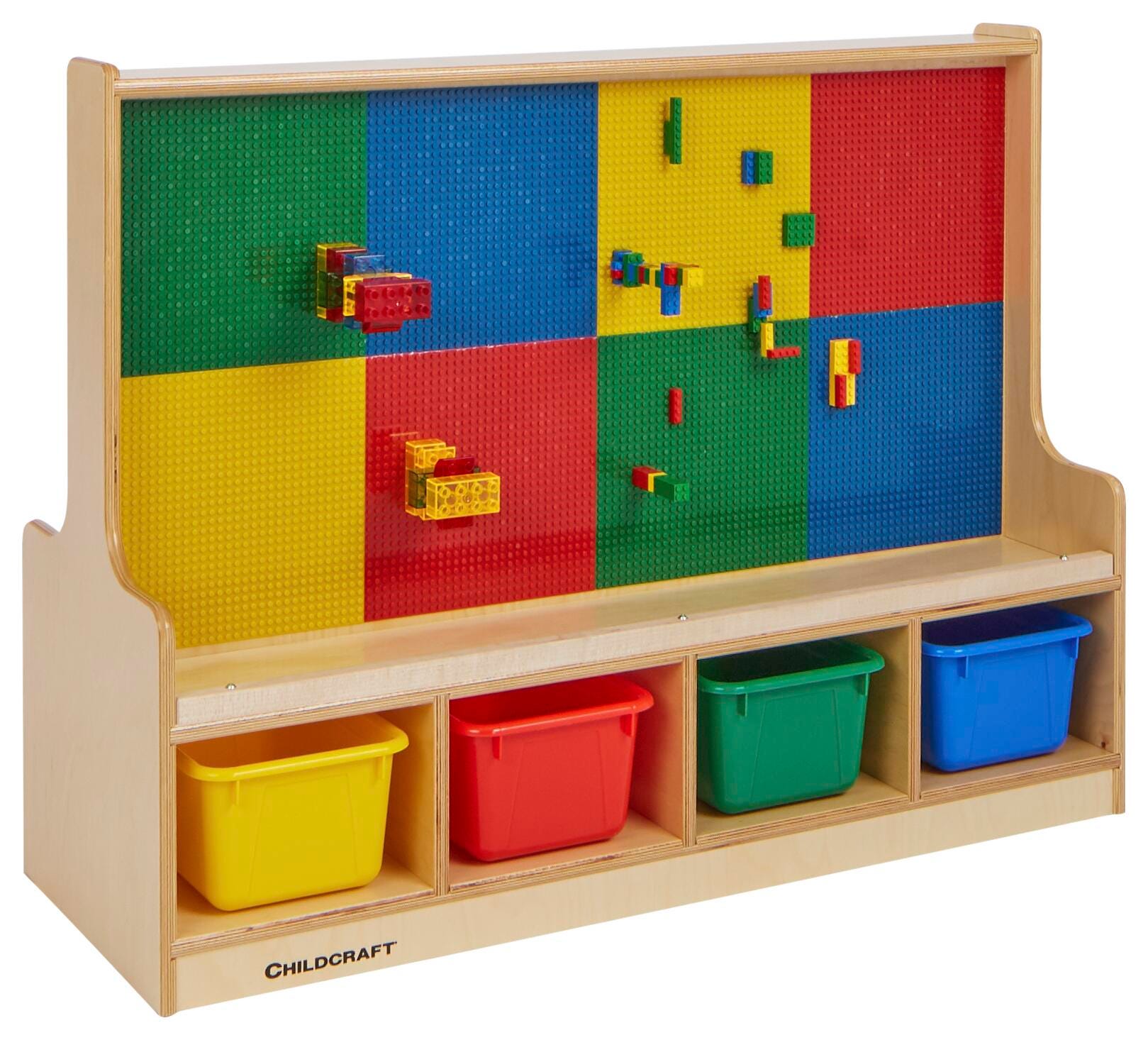 Childcraft® Dual-Sided Building-Brick Activity Center offers a perfect blend of entertainment and organization for children. One side features a multi-colored brick grid for standard-sized building blocks, while the other side provides a magnetic dry erase board for drawing, writing, and problem-solving. The play unit includes four removable colored trays for convenient storage of bricks, markers, or other supplies. This activity center promotes teamwork and creative exploration, making it ideal for classrooms, daycares, or playrooms. Comes fully assembled. The compact activity wall measures 39-1/2 W x 14-1/4 D x 30 H inches.Features