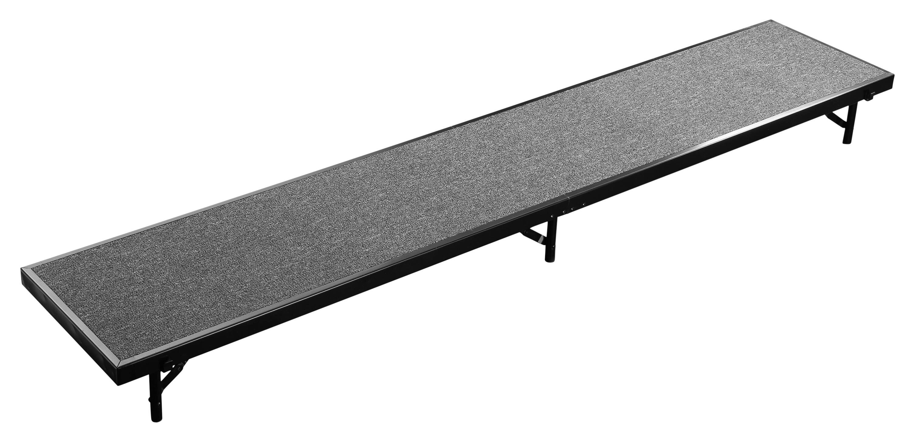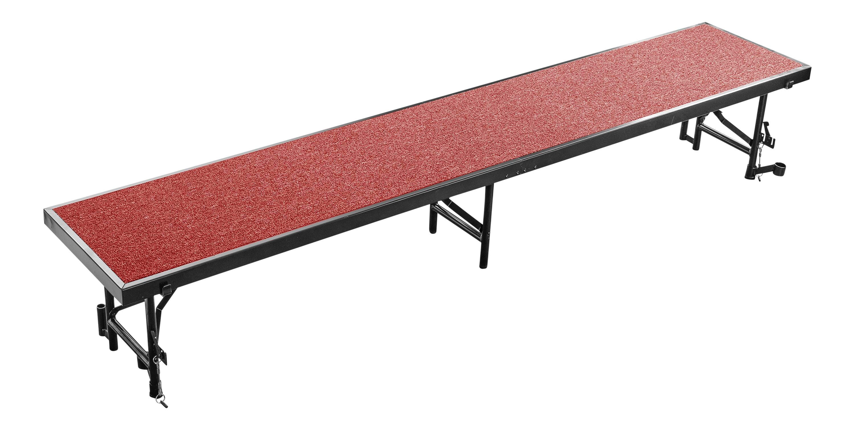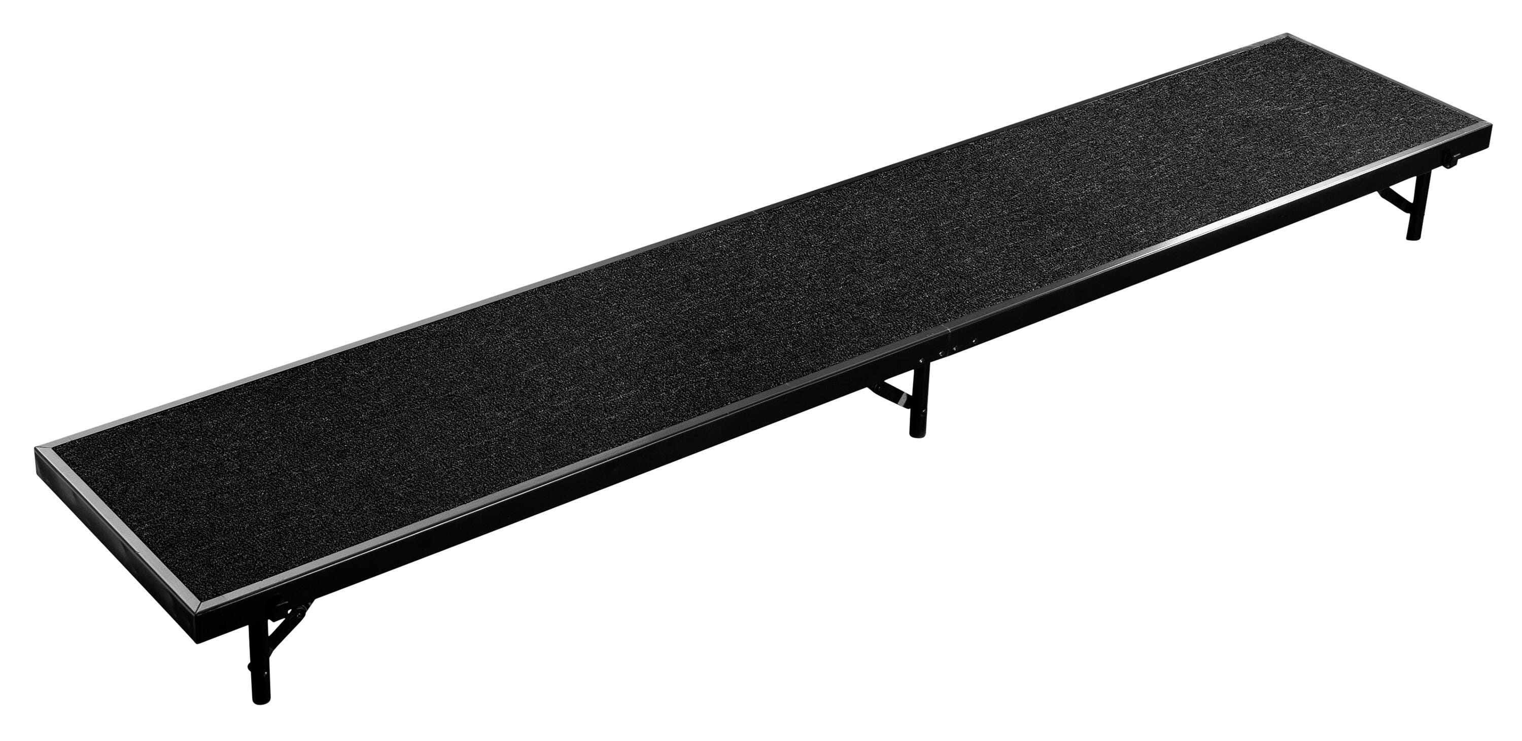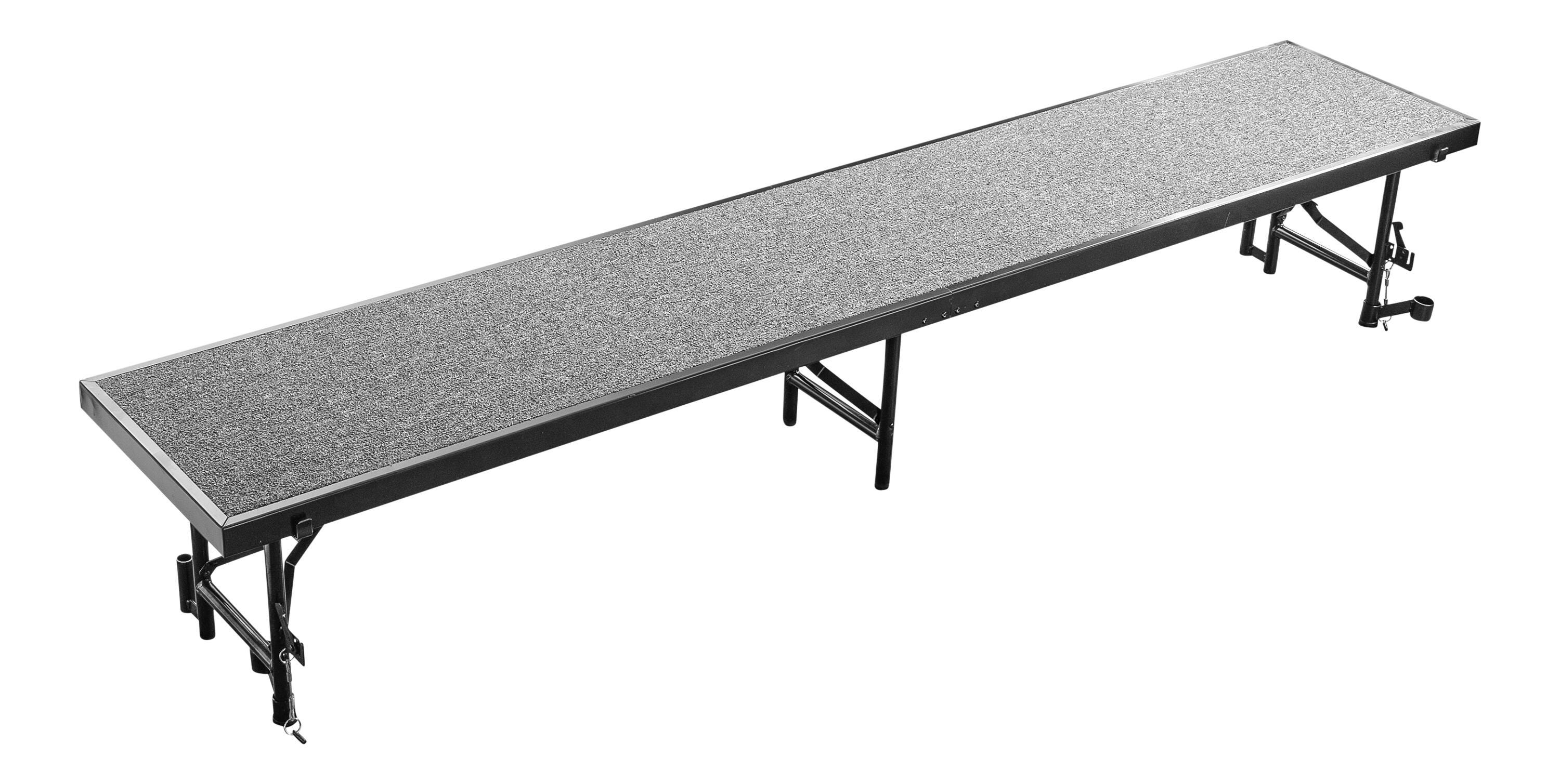 The NPS Straight Portable Standing Riser has a durable 16-gauge steel frame and premium grade 3/4-inch solid plywood core covered with carpet. Legs are made with 14-gauge tubular steel capped at the point of floor contact with high-impact plastic glides. Riser equipped with drop-in couplings that allow units of the same or different heights to be joined together. All ganging devices are permanently secured to each unit and can be easily attached to one another to build multi-level heights. The riser is easy to set up and allows for quick continuous or semi-circle arrangements for all performance venues. Optional Guardrails for safety are sold separately.