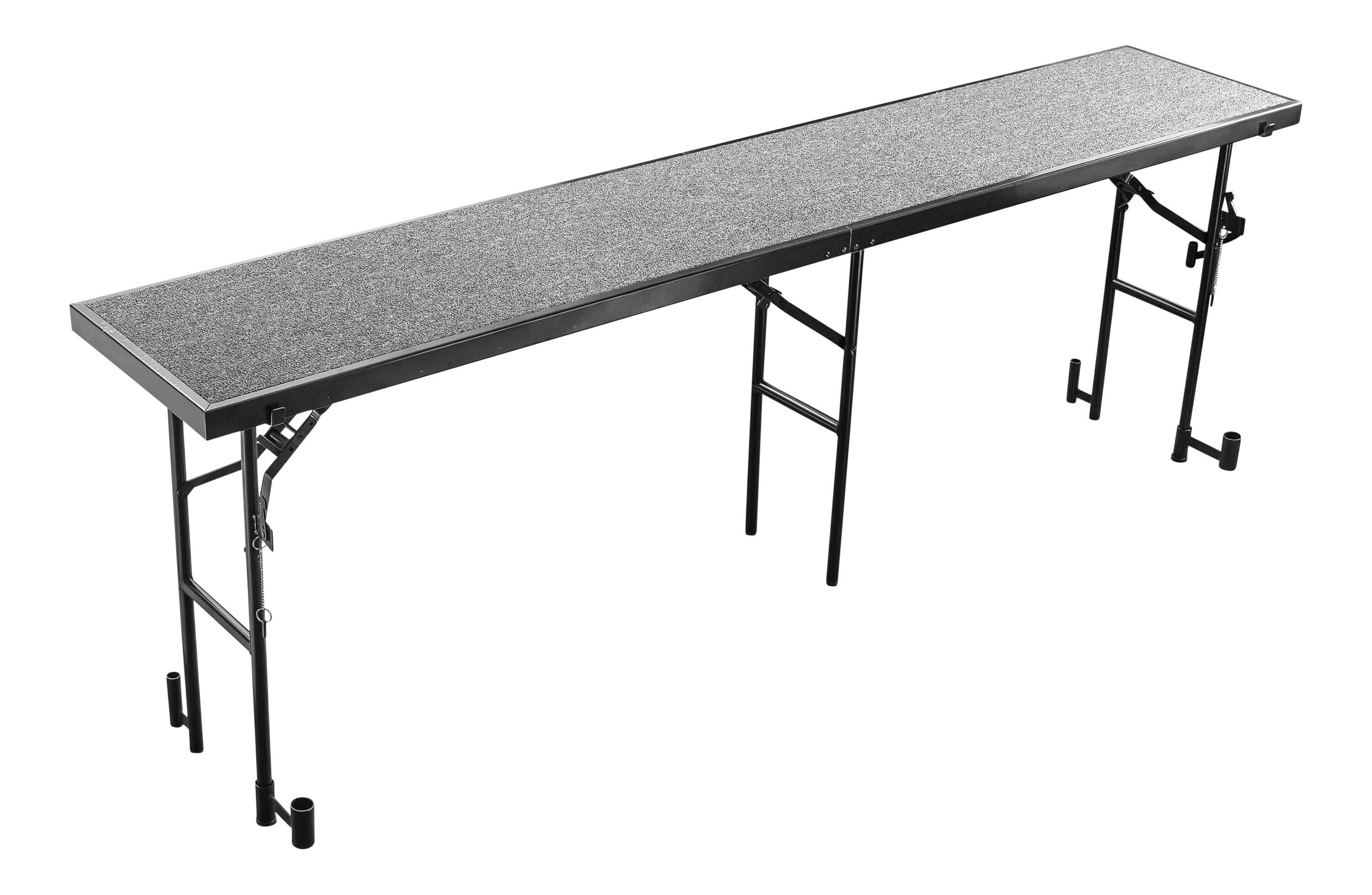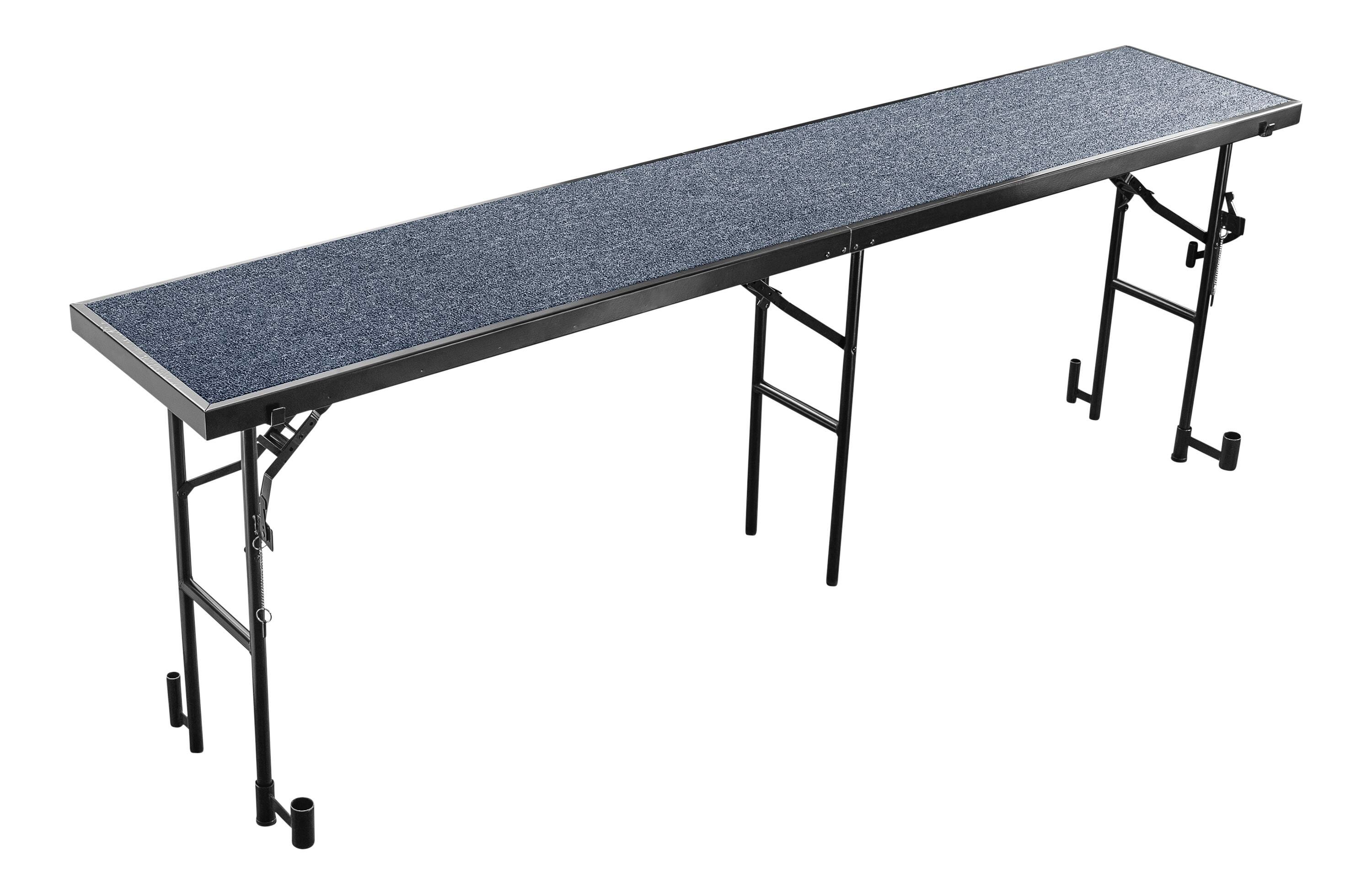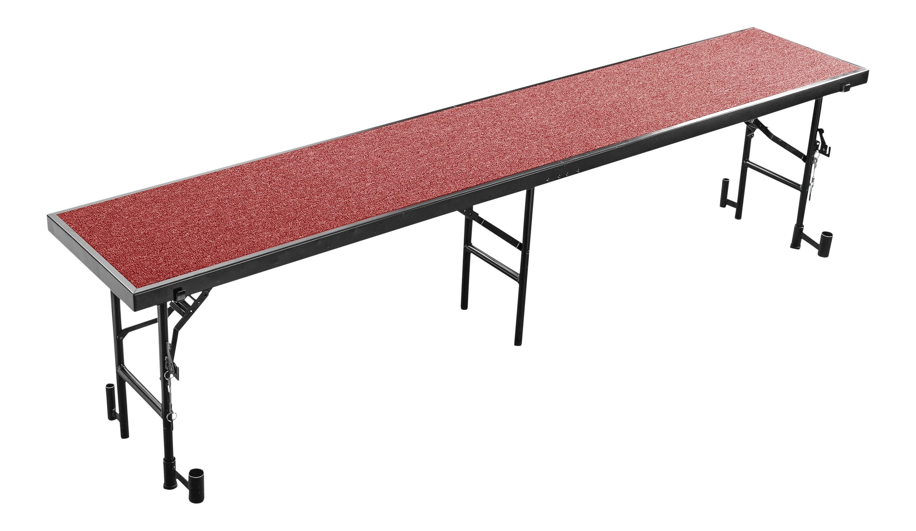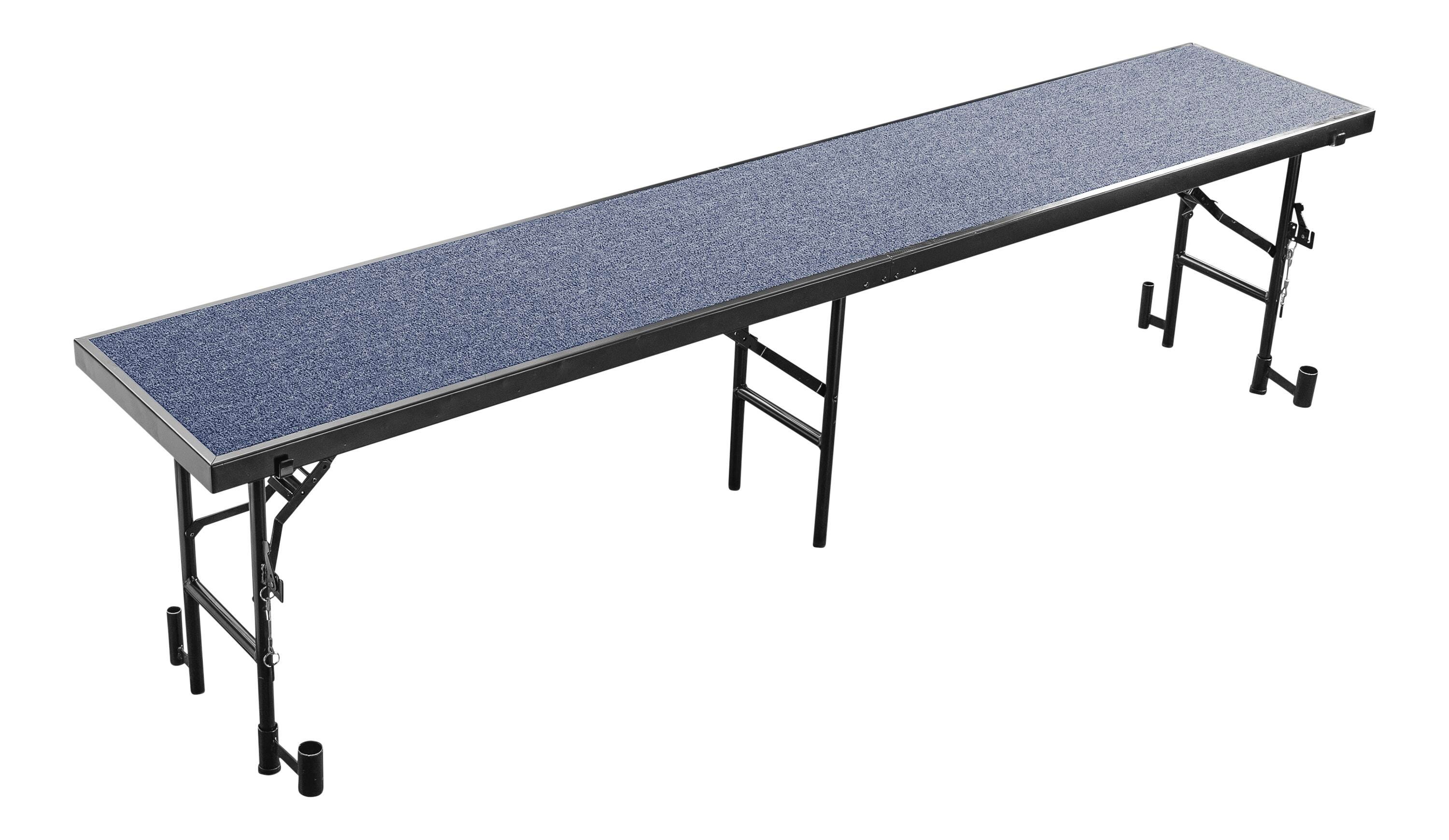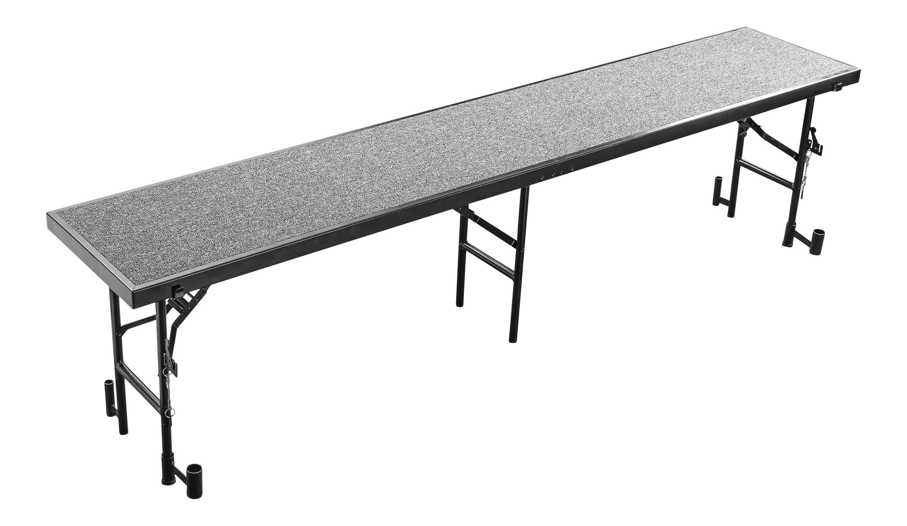 The NPS Straight Portable Standing Riser has a durable 16-gauge steel frame and premium grade 3/4-inch solid plywood core covered with carpet. Legs are made with 14-gauge tubular steel capped at the point of floor contact with high-impact plastic glides. Riser equipped with drop-in couplings that allow units of the same or different heights to be joined together. All ganging devices are permanently secured to each unit and can be easily attached to one another to build multi-level heights. The riser is easy to set up and allows for quick continuous or semi-circle arrangements for all performance venues. Optional Guardrails for safety are sold separately.