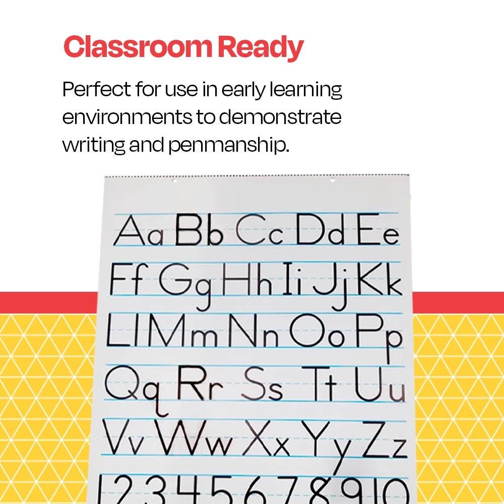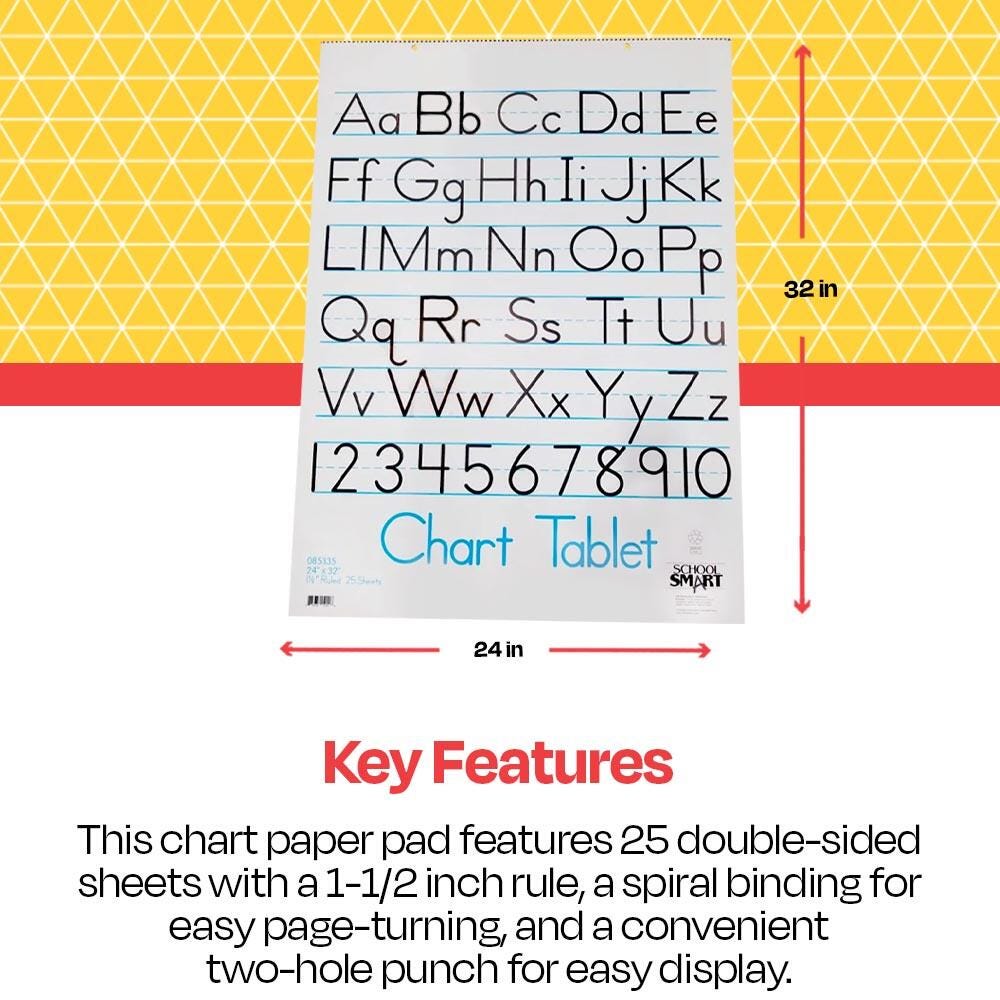 Features Pages are white with ruled lines, and the writing paper helps with reinforcement and practice for class lessons and group discussions The easel paper pad provides a sturdy writing surface and a convenient place to take notes during presentations Chart paper serves as a great teacher tool for modeling letter formation and writing skills The flipchart paper pad also makes an excellent resource for at-home learning environments Two top hole punches allow for hanging of the chart pad in classrooms and offices Use for writing to-do lists, meeting agendas, or quick notes Click to view the School Smart Ruled Paper Guide Includes: 1 Chart Tablet with 25 Pages