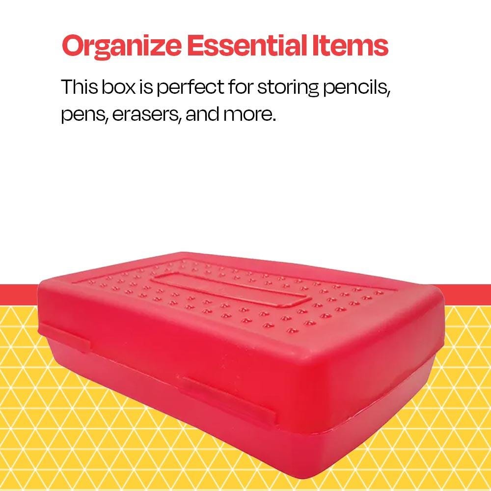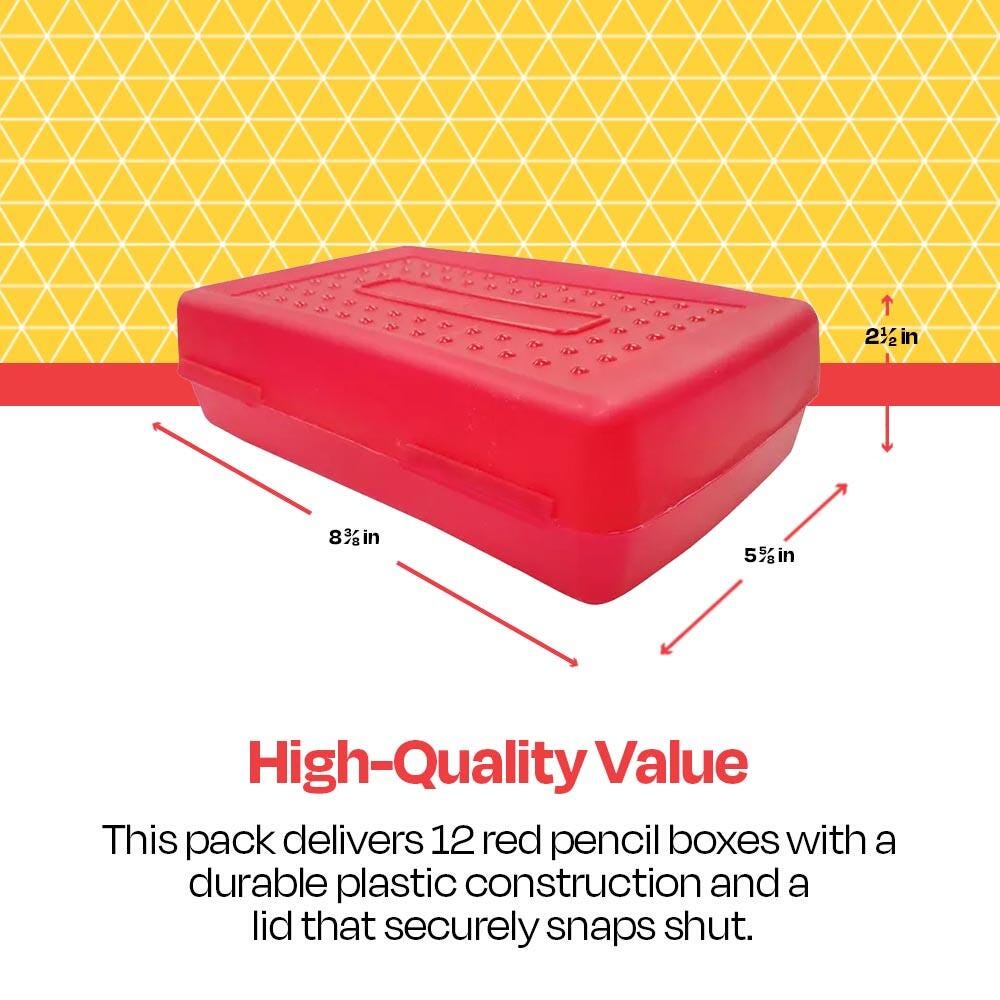 Description This School Smart plastic pencil box case includes 12 pencil holders. Use the organizers to hold pencils, pens, markers, crayons, and other school supplies. Made from durable plastic, each red pencil box also features an easy-to-use snap-shut latch. Students and teachers love the red organizers.Features Our lightweight storage cases can fit in most lockers Solid one-piece construction uses advanced plastic molding Plastic lid snaps shut with an integrated latch keep your items safe and secure Use the multi-pack for classrooms, closet storage, desk organization, and more Great for elementary and middle school Includes: 12 Plastic Pencil Boxes, Red