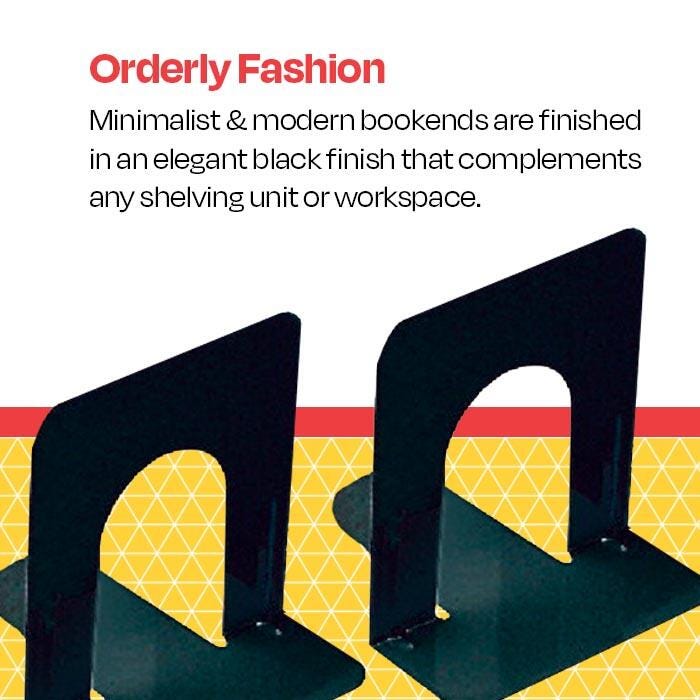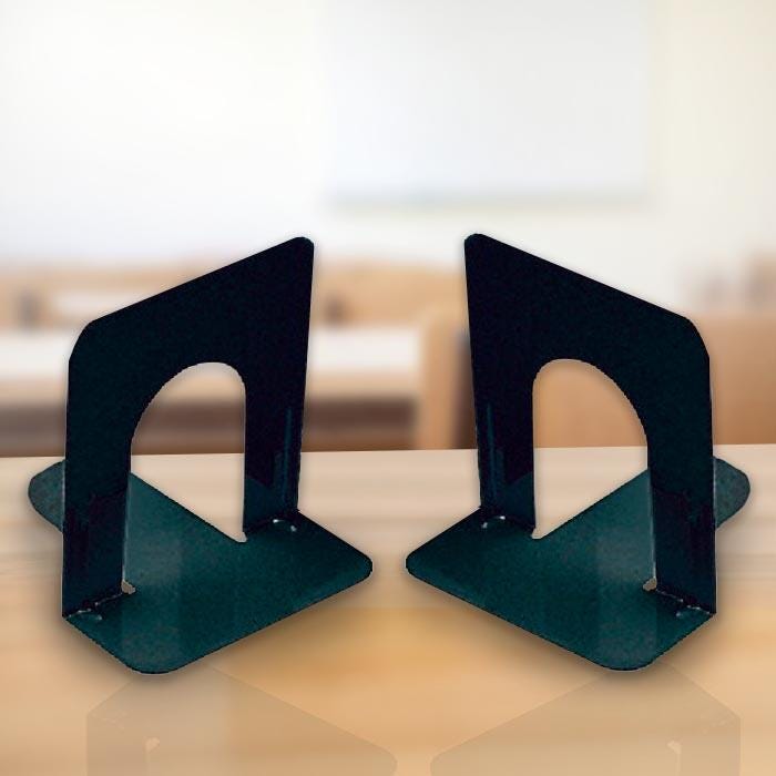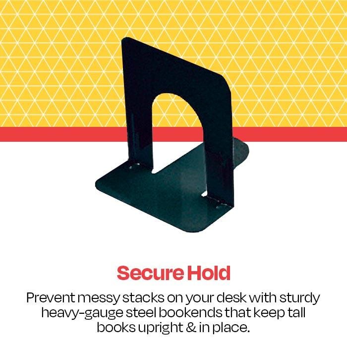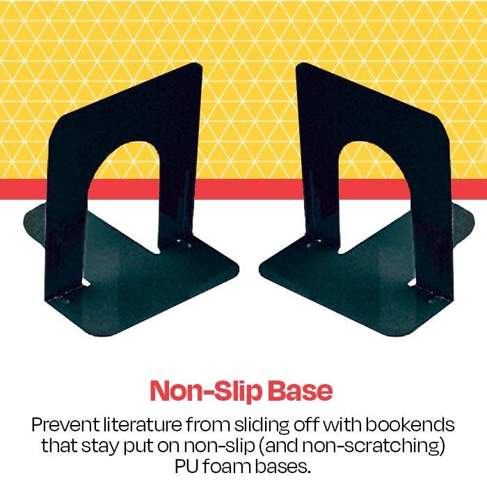 Description School Smart Non-Skid Steel Bookends in black support your books in a sleek, modern style. Measuring 6 inches x 9 inches, these bookends are designed for use with tall books. They offer an ideal way to keep shelves tidy and are made of heavy-gauge steel for a secure hold. Smooth coined edges on both the inner and outer arcs offer extra safety. Polyurethane foam on the base provides a non-skid feature that also prevents scratching on surfaces. Sold as a set of two bookends.Features Heavy gauge steel with durable black finish Smooth "coined" edges for extra safety Sleek look that complements any space Economical way to keep books organized