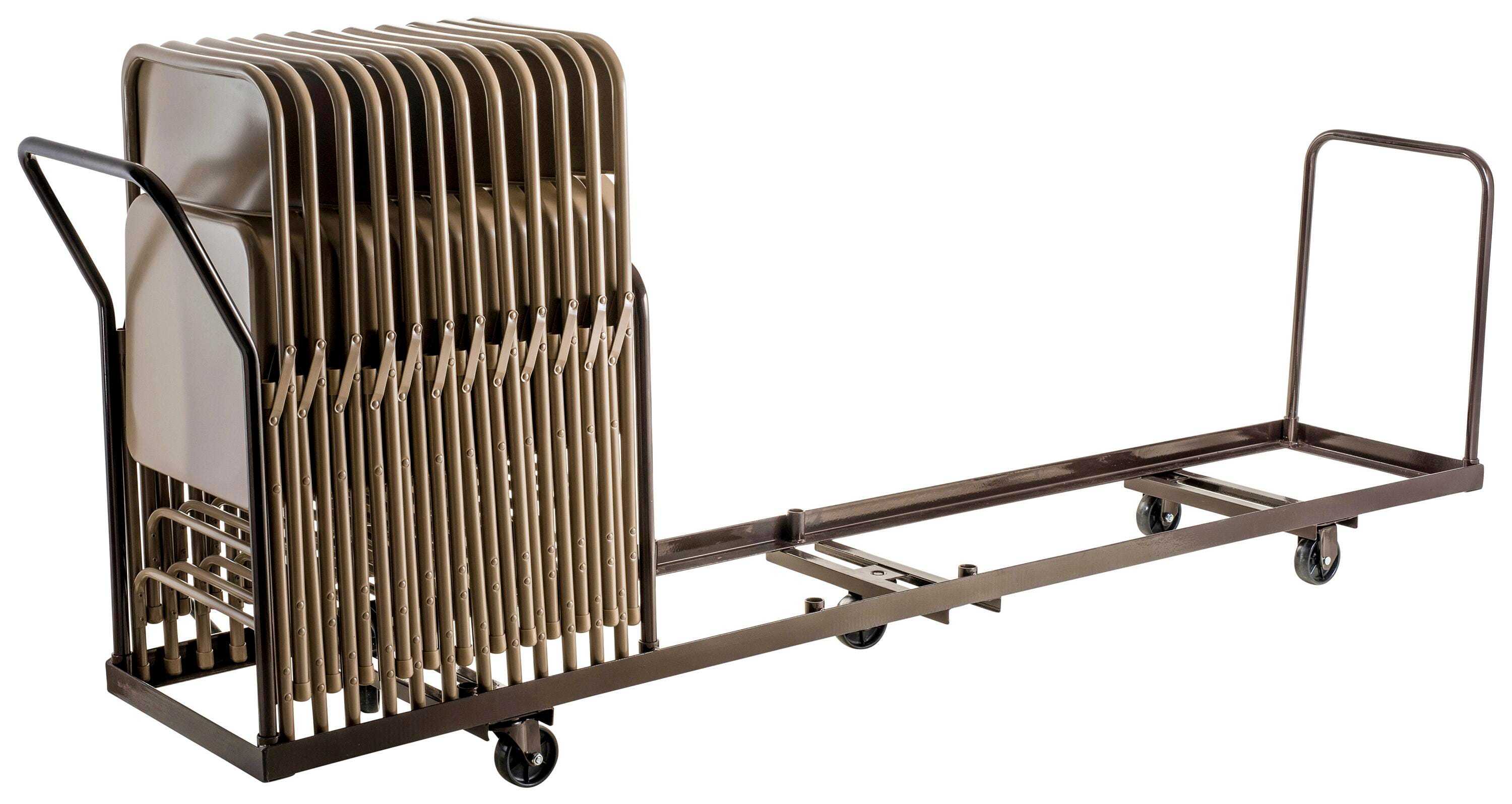 Chair Caddy Chair caddy built for easy handling provides stability for storing and transporting. Features a solid steel powder coated construction. Additional handle bar sockets allow secure placement of chairs. Strategically placed handle positions lock chairs in almost any spot on the dolly. Holds 50 folded chairs that are 15-1/4 up to 19 inches wide. Overall dimensions are 19-1/4 L x 109-1/2 W x 38-1/2 H inches. Inside width 19 inches with a 2 inch lip. Chairs not included.