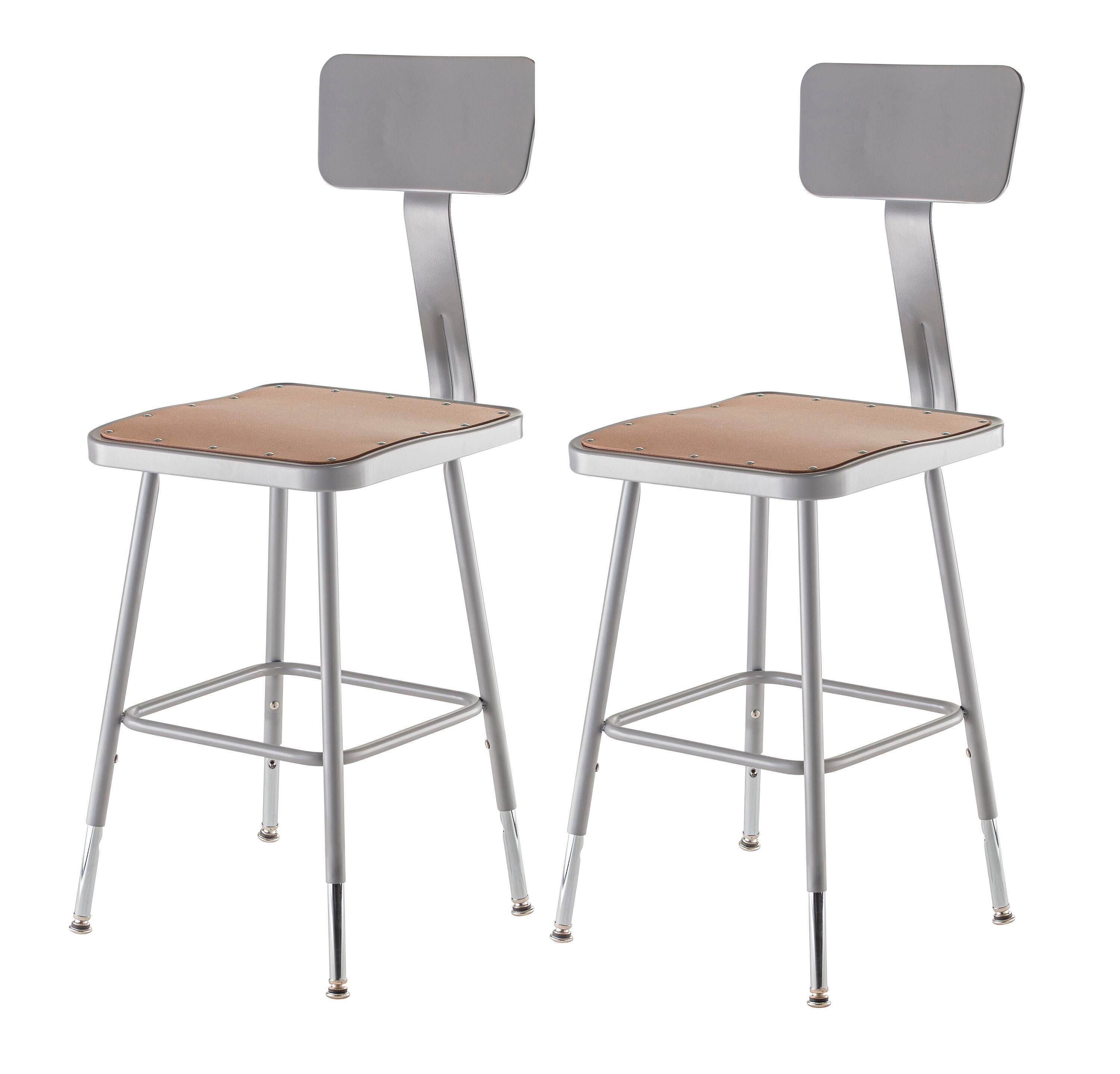 NPS Adjustable Height Upholstered Stool with gray metallic enamel finish features curved steel backrest that adjusts 2 inch horizontally and vertically. Stool has a height that varies from 19 inch - 27 inch with 1 inch increments suits different users. Stool is provided with self leveling glides and contoured square masonite seat without upholstery.