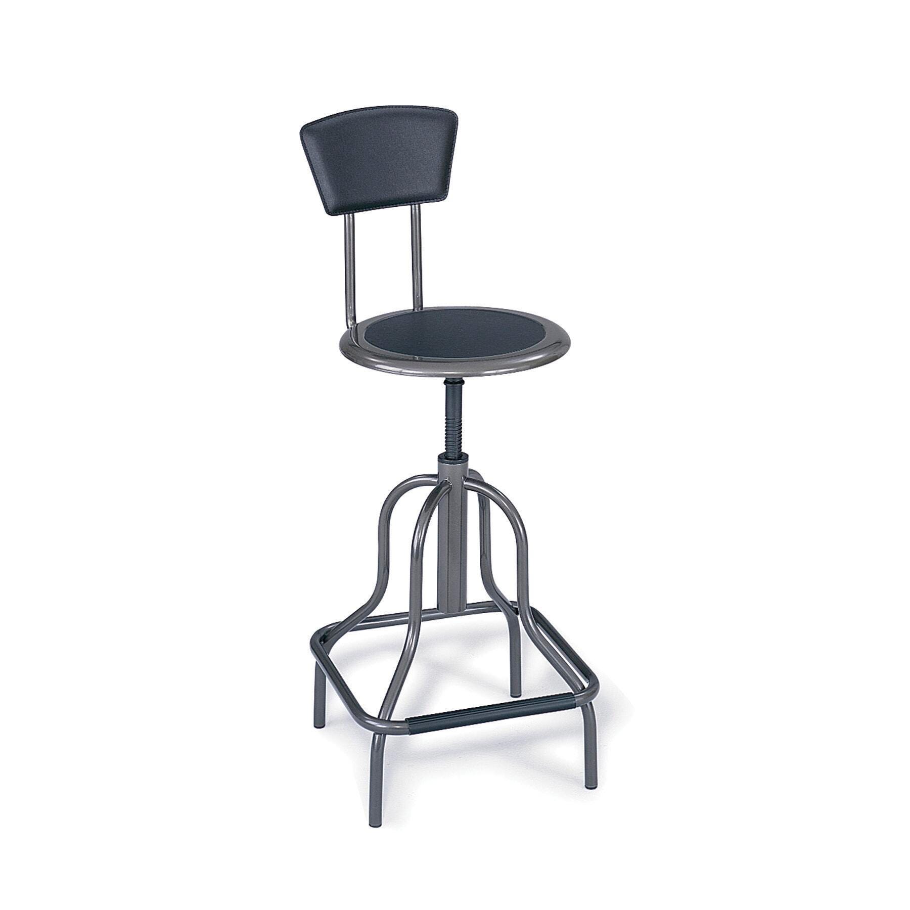 Safco Diesel High Stool measuring 16-1/2 x 16-1/2 x 22 - 27 in is suitable for educational environment and is designed from rugged steel with a clear coat pewter finished frame. Diesel high stool is available with 14 in Dia leather padded seat and a 12 in x 7 in leather padded steel back for extra comfort. Black stool features a manual seat height adjustment using nylon-coated screw lift and a non-marring rubber feet protect floors for added durability.