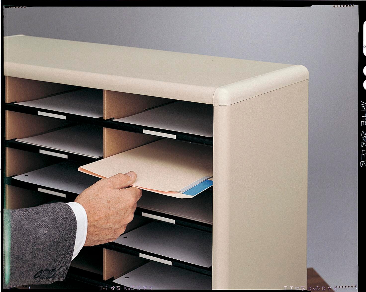 Value Sorter Literature Organizer with radius corners and pleasing lines, has a steel shell with support shelves and a solid fiberboard back for stability and durability. It is perfect for organizing literature and keeping it accessible for convenient retrieval. Storage compartments are made of heavy-duty corrugated fiberboard and measure 9-3/4 W x 12-1/2 D x 2-1/2 H inches. Compartments hold up to 550 sheets of letter sized paper. When ordering, please select options to choose color choices.Features