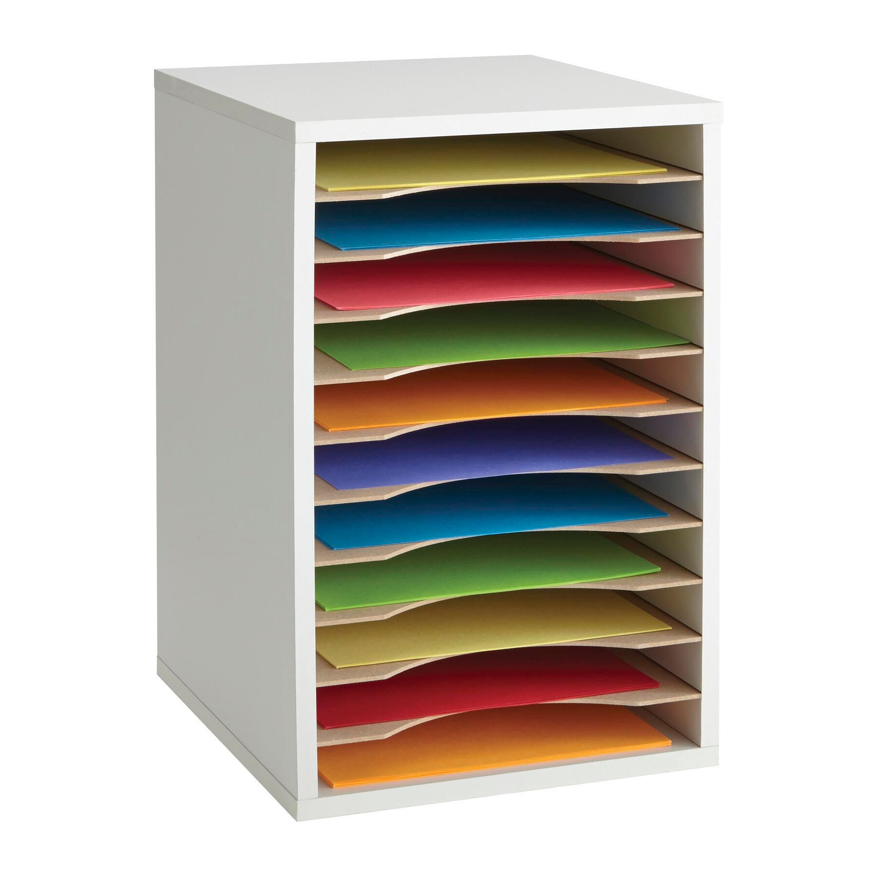 Wood Vertical Literature Organizer is made of 1/2 inch compressed wood with a laminate finish and a solid hardboard back. Each of the 11 compartments holds letter sized documents and can hold up to 15 pounds per shelf. Shelves are removable during assembly for customizing the compartment. Unit measures 10-3/4 W x 12 D x 16 H inches. Medium Oak finish.Features