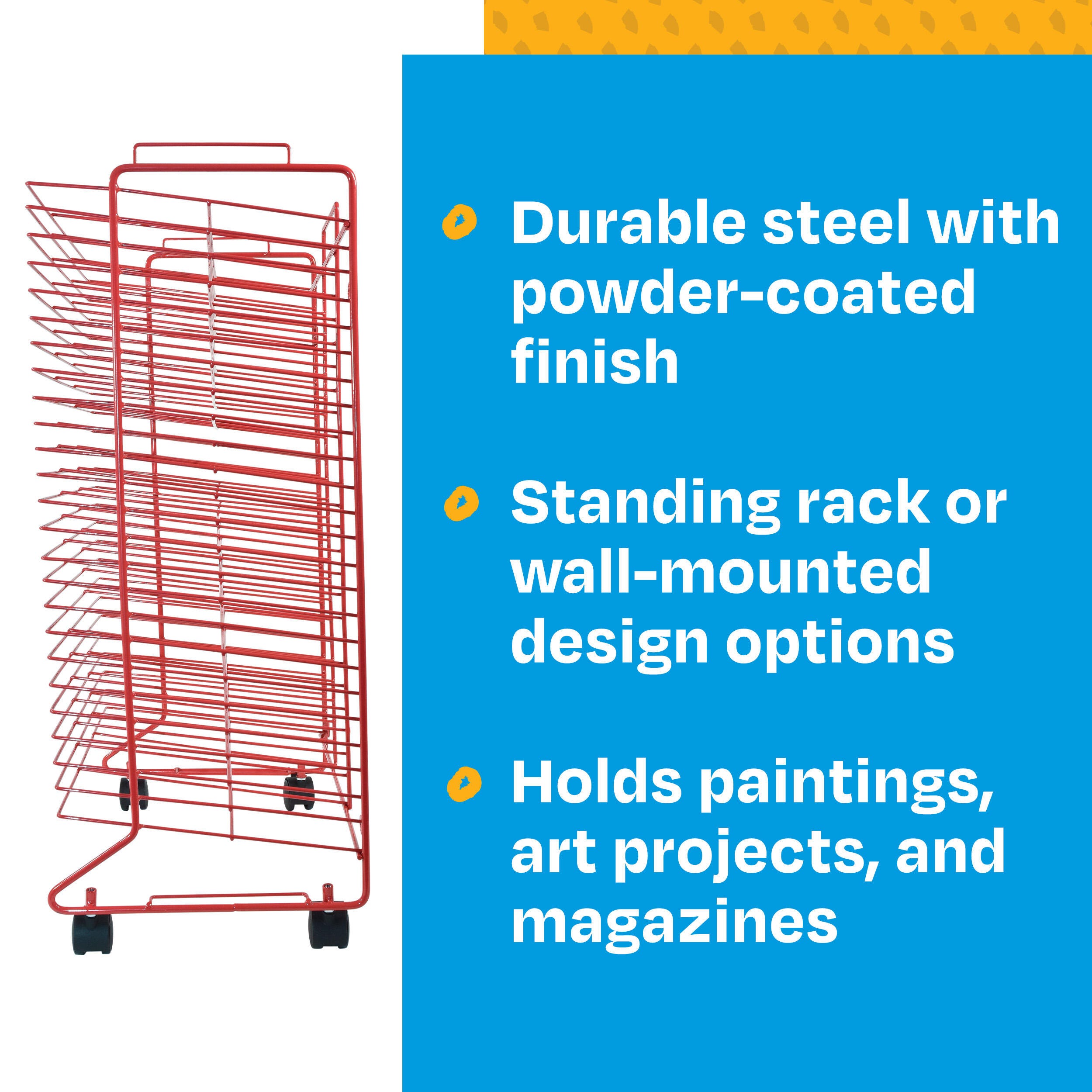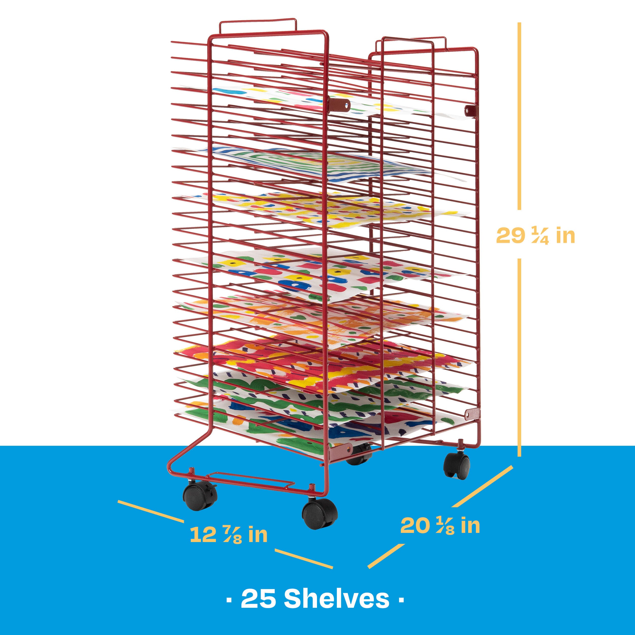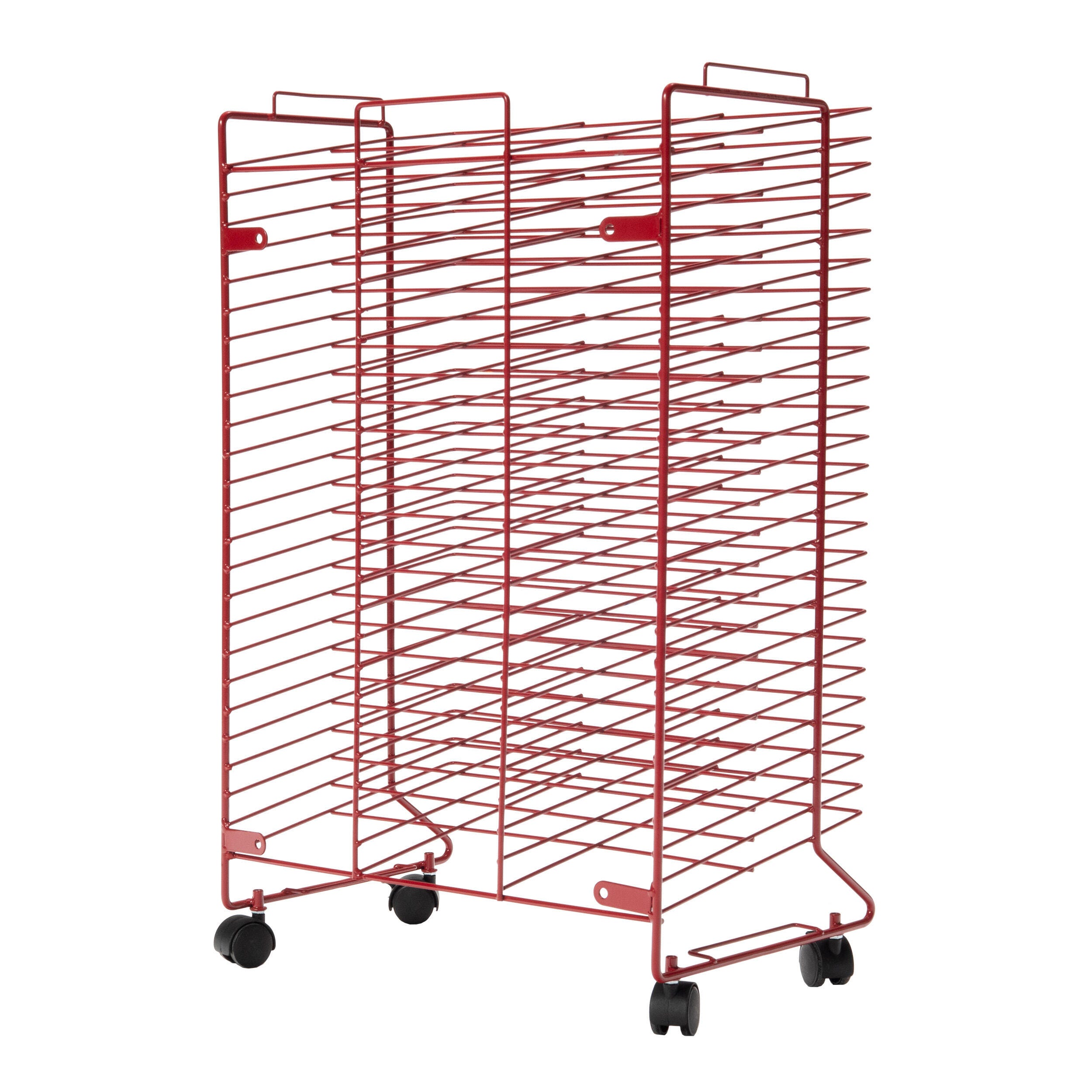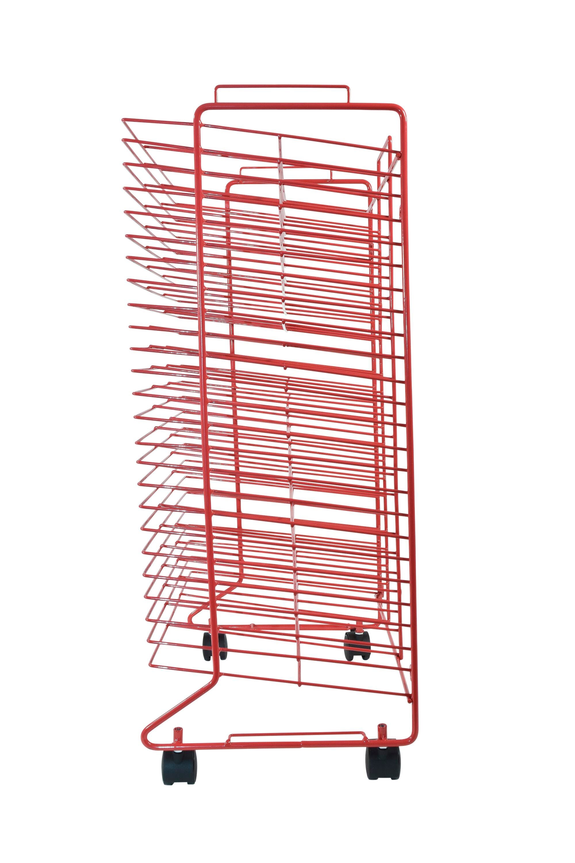 Description The Sax stack-a-rack drying rack is a versatile shelving system for classrooms, studios, and homes. Made from sturdy steel, the metal wire racks feature a red powdercoat finish for better durability. Use the storage unit as a standing rack, wall mountable rack, or mobile rack with 4 wheels. With 25 shelves and a flexible design, this unit can accommodate wet paintings and papers for the whole classroom.Features Total size of the versatile shelving system is 20-1/8 W x 12-7/8 D x 29-1/4 H inches The wired art holder features 25 shelves, each measuring 19 x 12 inches and spaced 1 inch apart Capable of accommodating paper sizes 8 x 8 to 17 x 11 inches Slim shelves help dry paintings and keep artwork flat, neat, and easily accessible Made of a high-quality, sturdy welded metal construction for long-lasting use Fun design with a bright red color and powdercoat finish Sax art supplies are developed and field-tested by art educators for art educators Includes: