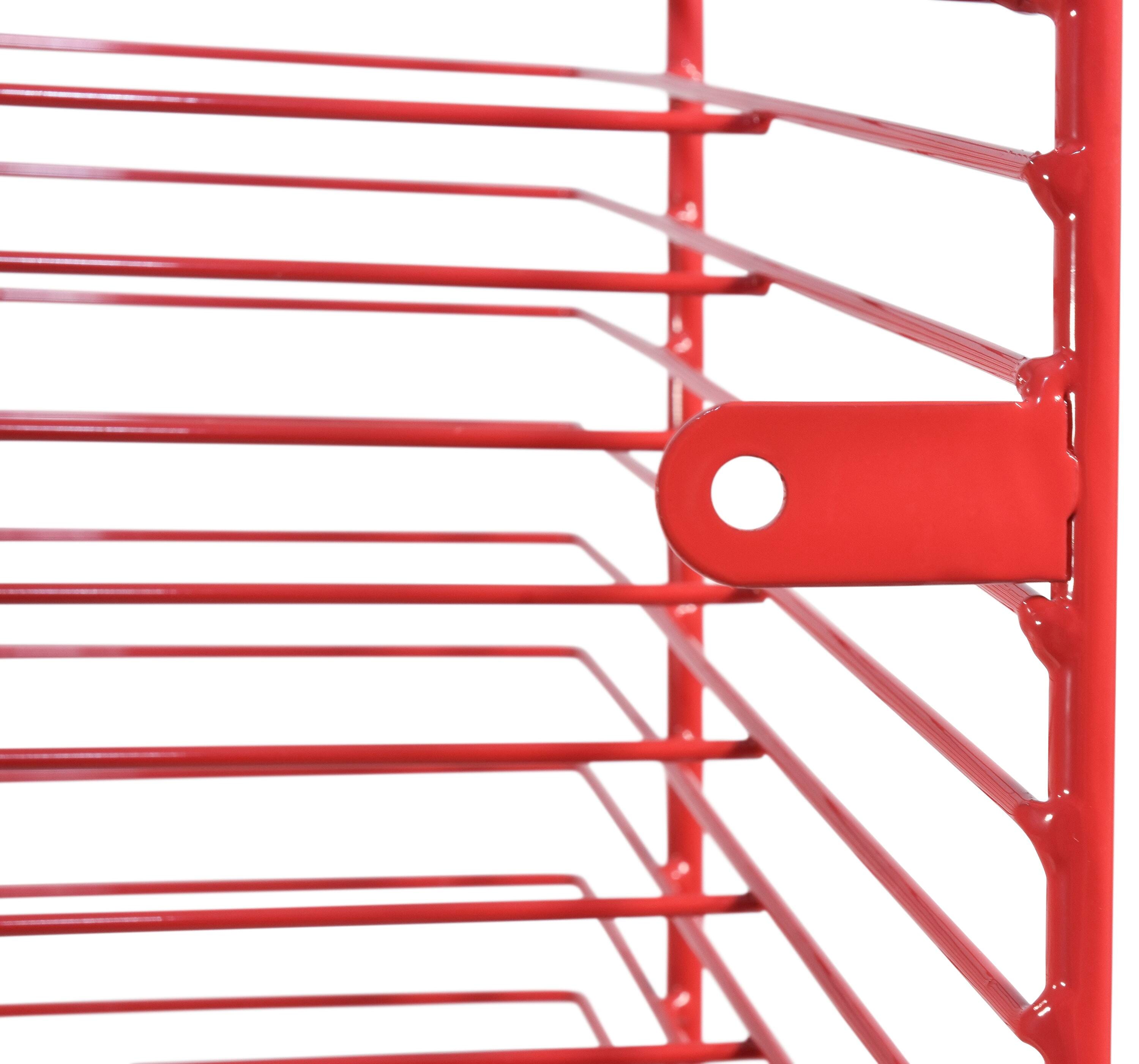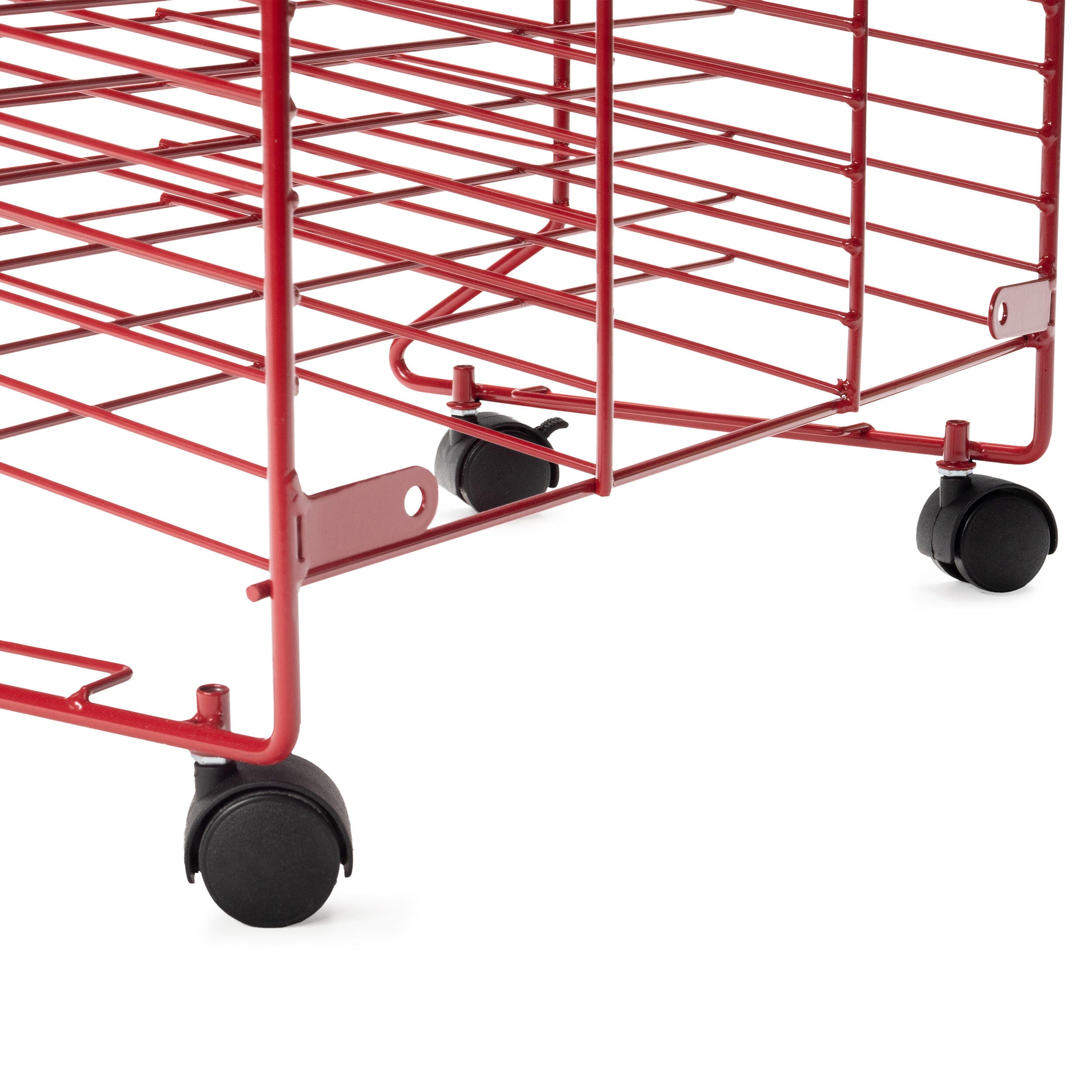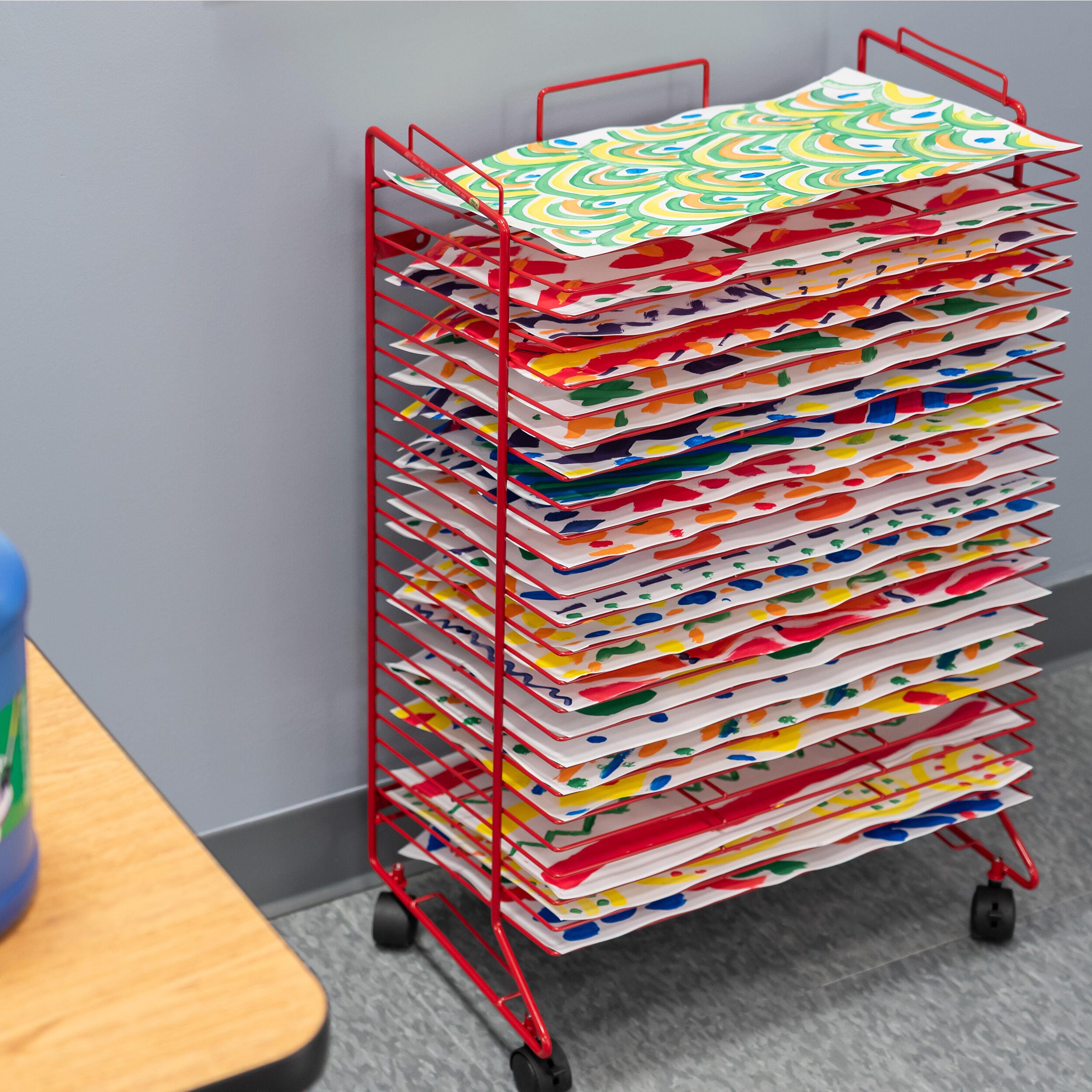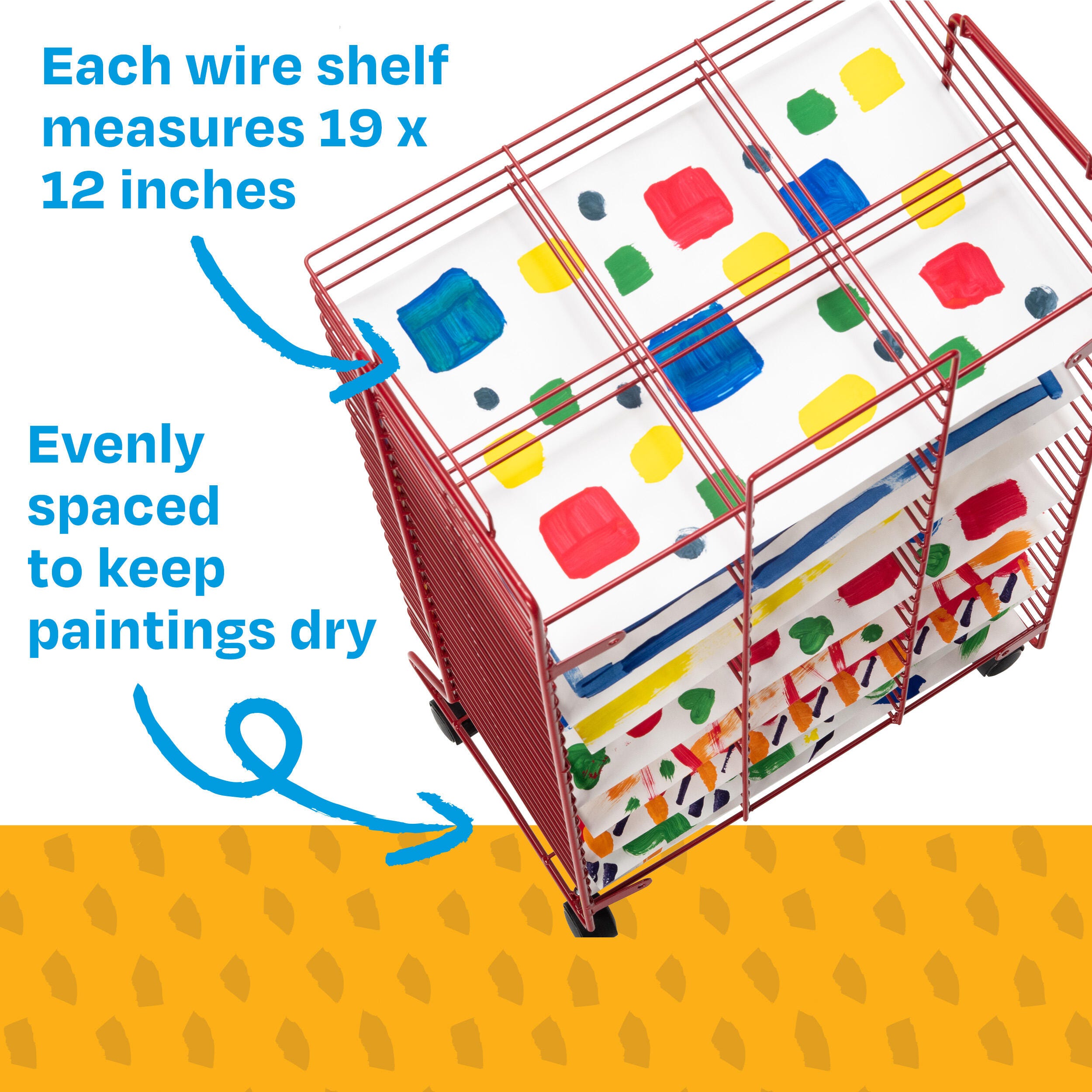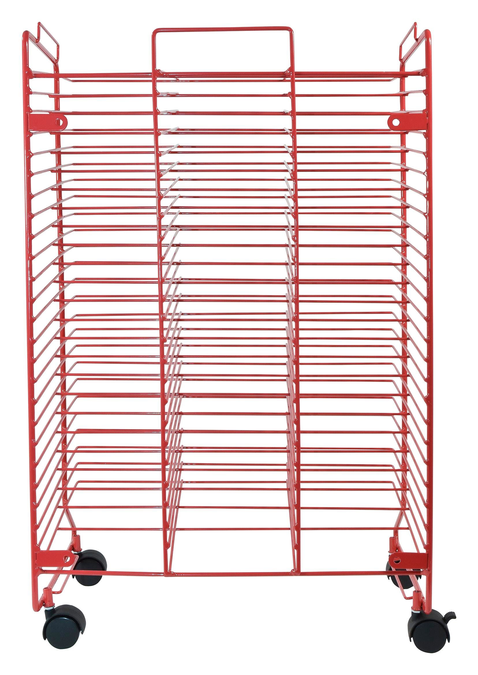 Description The Sax stack-a-rack drying rack is a versatile shelving system for classrooms, studios, and homes. Made from sturdy steel, the metal wire racks feature a red powdercoat finish for better durability. Use the storage unit as a standing rack, wall mountable rack, or mobile rack with 4 wheels. With 25 shelves and a flexible design, this unit can accommodate wet paintings and papers for the whole classroom.Features Total size of the versatile shelving system is 20-1/8 W x 12-7/8 D x 29-1/4 H inches The wired art holder features 25 shelves, each measuring 19 x 12 inches and spaced 1 inch apart Capable of accommodating paper sizes 8 x 8 to 17 x 11 inches Slim shelves help dry paintings and keep artwork flat, neat, and easily accessible Made of a high-quality, sturdy welded metal construction for long-lasting use Fun design with a bright red color and powdercoat finish Sax art supplies are developed and field-tested by art educators for art educators Includes: