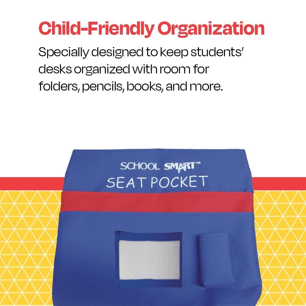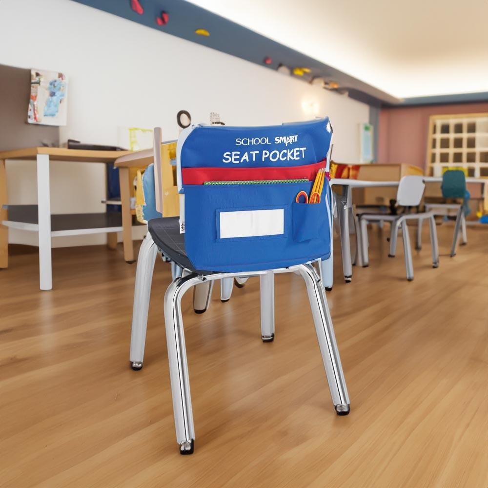 Description Keep your classroom organized with the help of the School Smart seat pocket. The blue seat sack easily slips over the back of a chair to provide extra storage and space for children. It features two main compartment pockets for larger items and additional pockets for a name plate and pencils. Seat sacks for student chairs are an easy and affordable way to stay organized.Features Made of long-lasting, durable fabric Easily slips on and off of seatbacks Comes with a clearly visible name plate Use the chair organizer for schools or recreation centers Student back of chair pockets provide extra space and storage in preschool, kindergarten, and elementary school