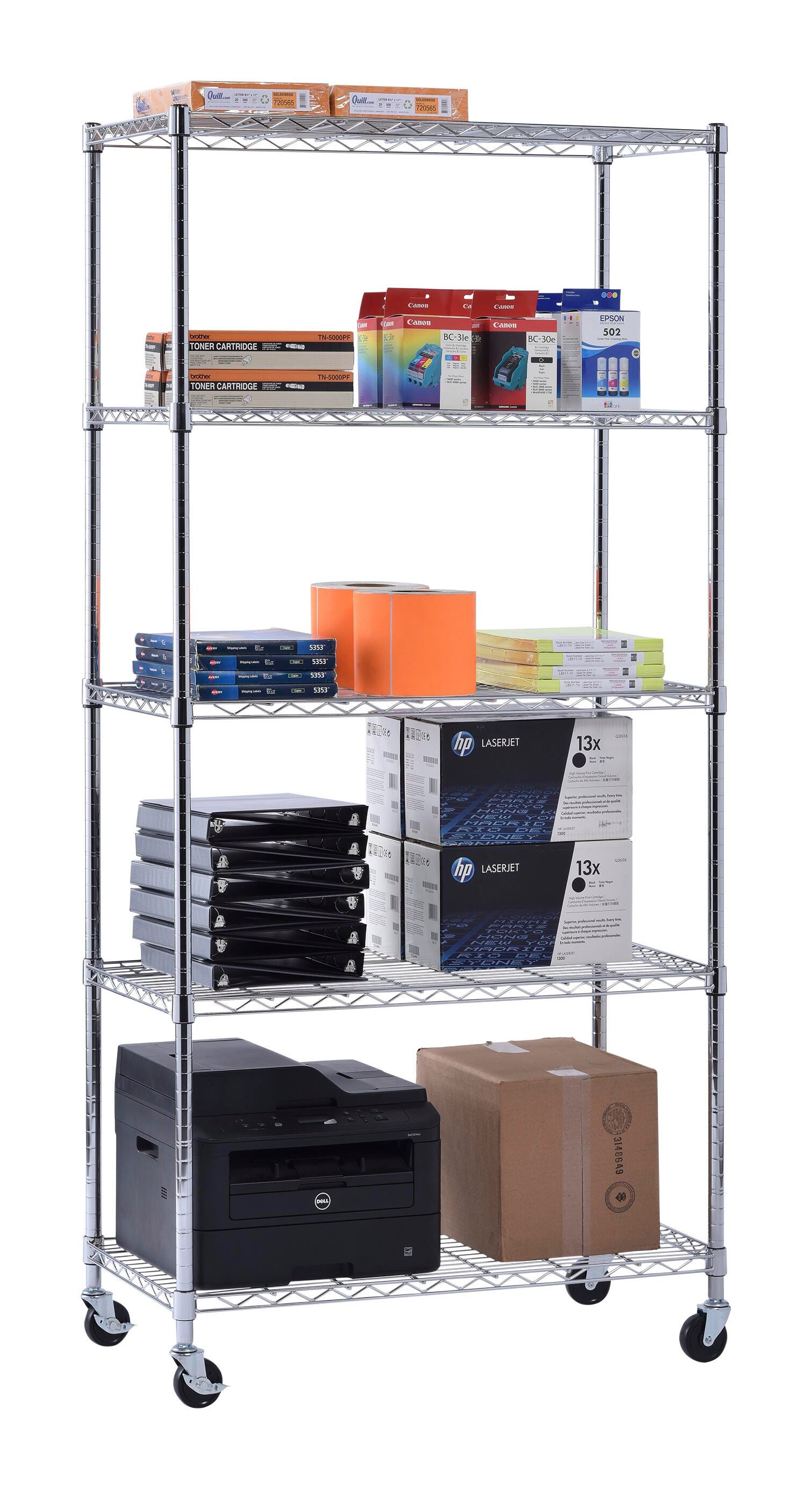 NSF Certified. Strong and durable welded wire construction with an open design permits sprinkler, air, and light penetration and reduces dust build-up. Includes five shelves adjustable in 1 in increments. Four 3 in rubber casters, 2 with locking brakes. Also includes adjustable leveling feet. Units are easy to assemble in just minutes without tools. Maximum weight capacity per shelf is 500 lbs., evenly distributed. Chrome finish.Features