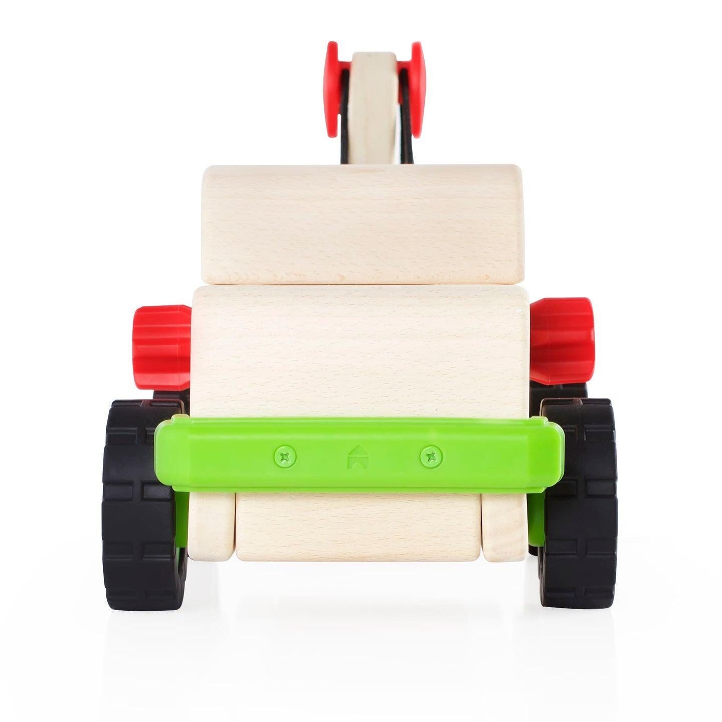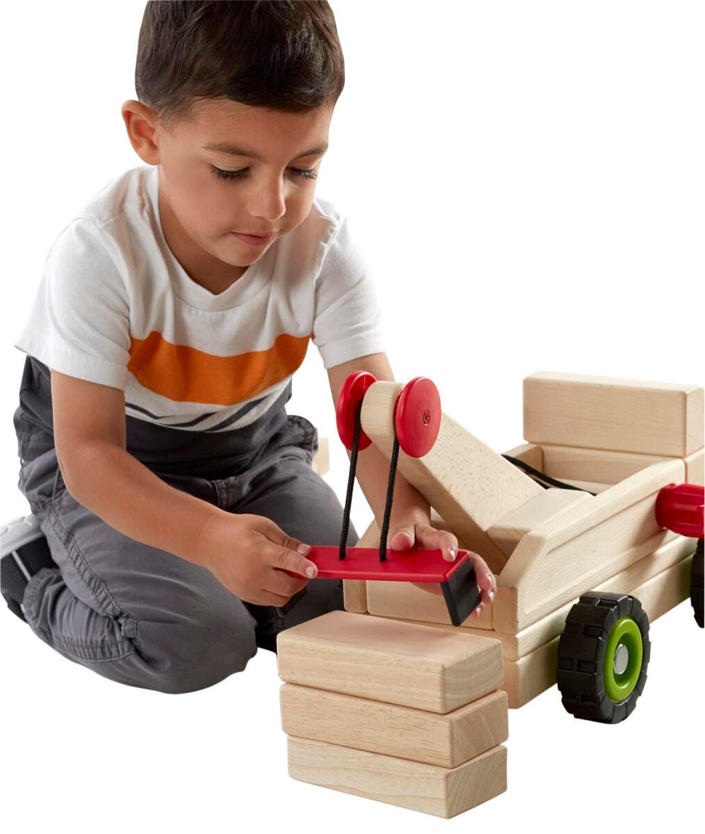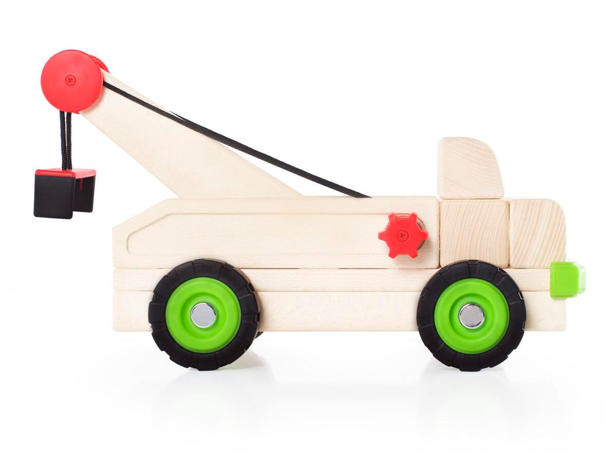 - Large wooden toy tow truck with plastic parts teaches children about simple machines like wheels and axles When a child rotates the handles in the front of the truck bed, the attached Unit Blocks (sold separately) can be raised and then lowered