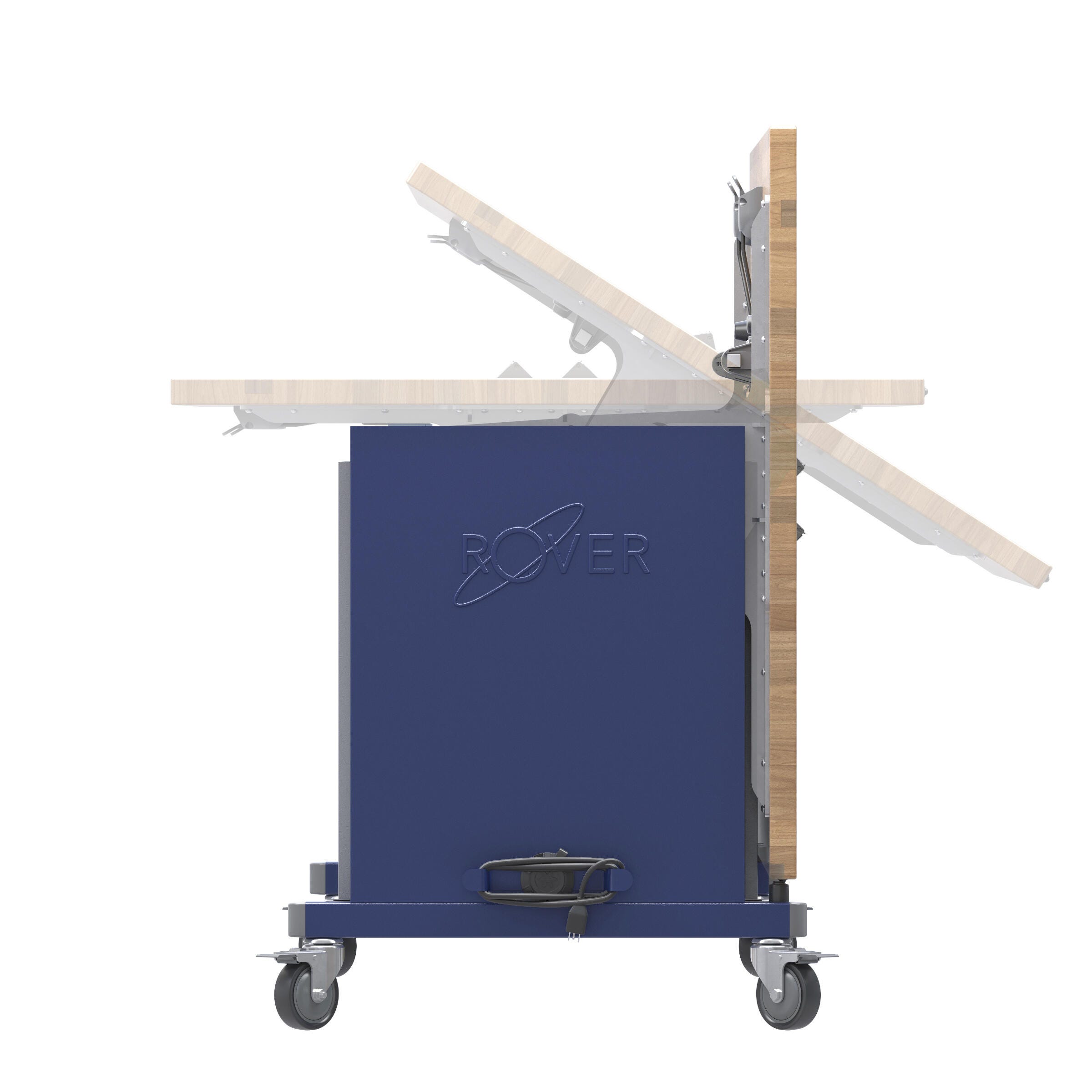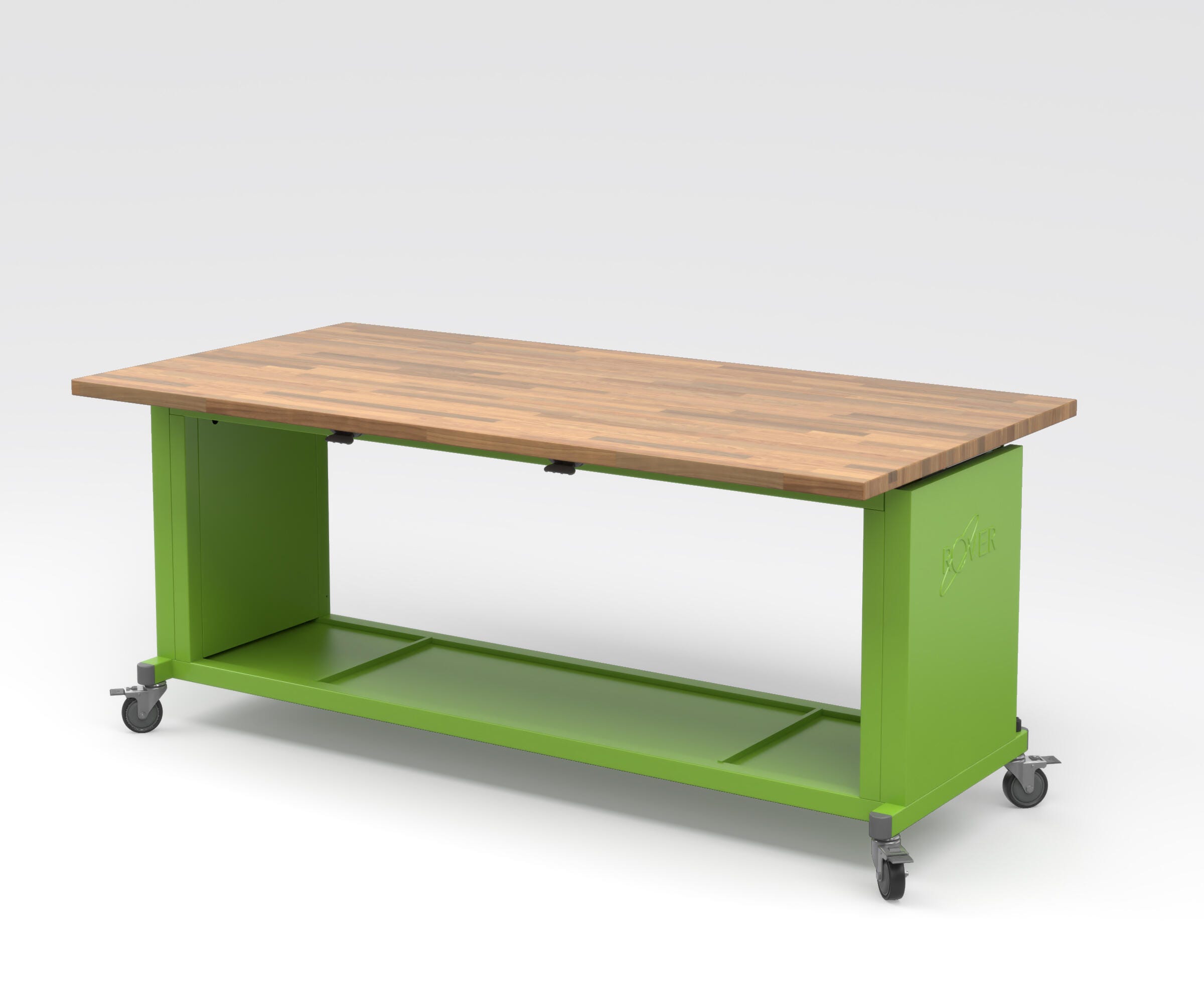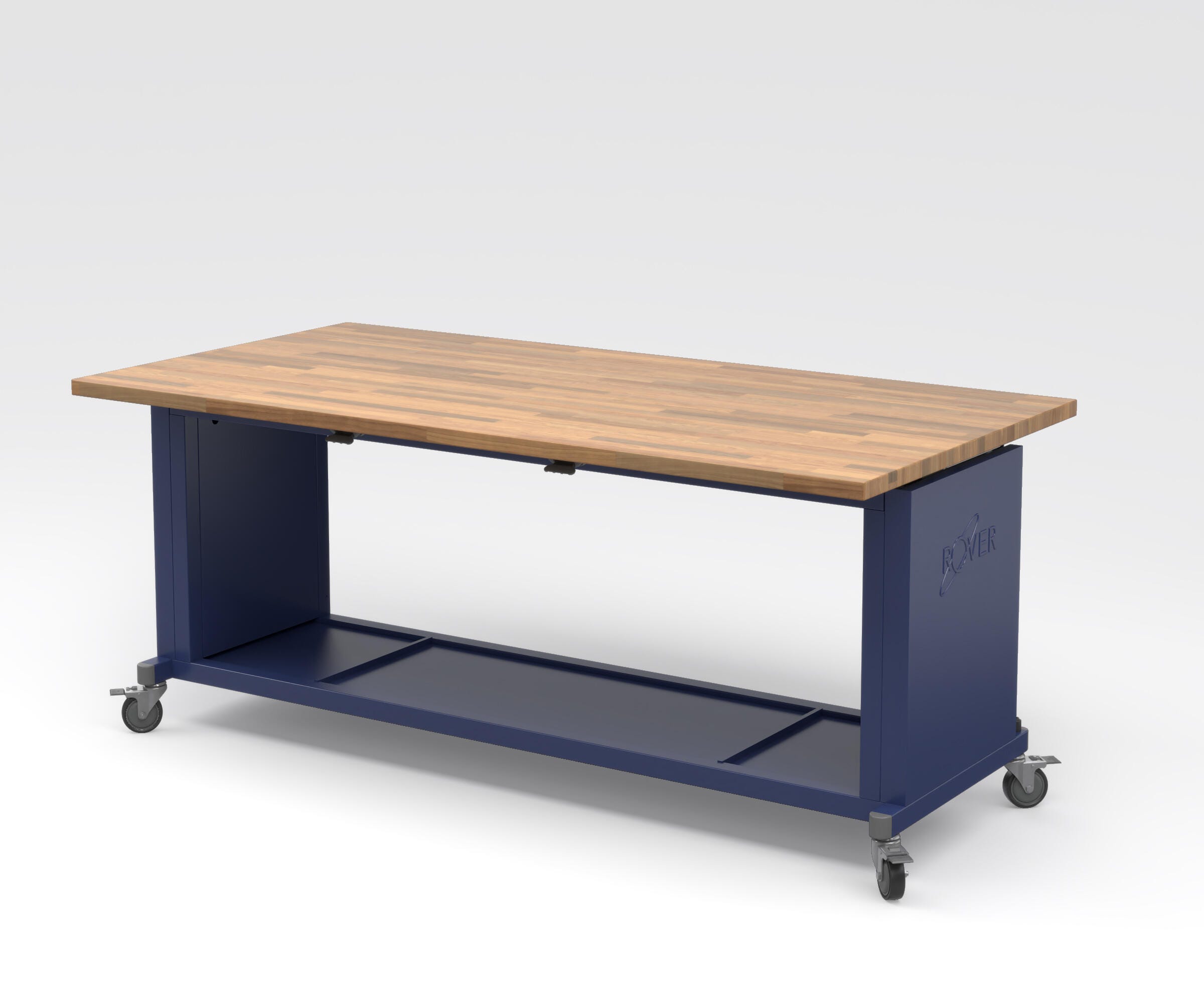 Start your project with this maker table. Made with solid hard maple butcher block, welded steel tube, and 18 gauge formed and welded steel frame. Rests on 4- x 4-inch locking casters made of high-strength steel with thermoplastic polyurethane (TPU) tread, meaning they're non-marking and corrosion-resistant. The frame is powder-coated and designed to withstand heavy wear, paired with clear storage bins. Measures 84 W x 29-1/2 D x 50-1/2 H inches when Rover table top is open.