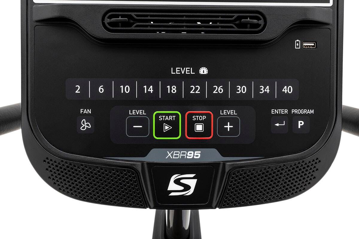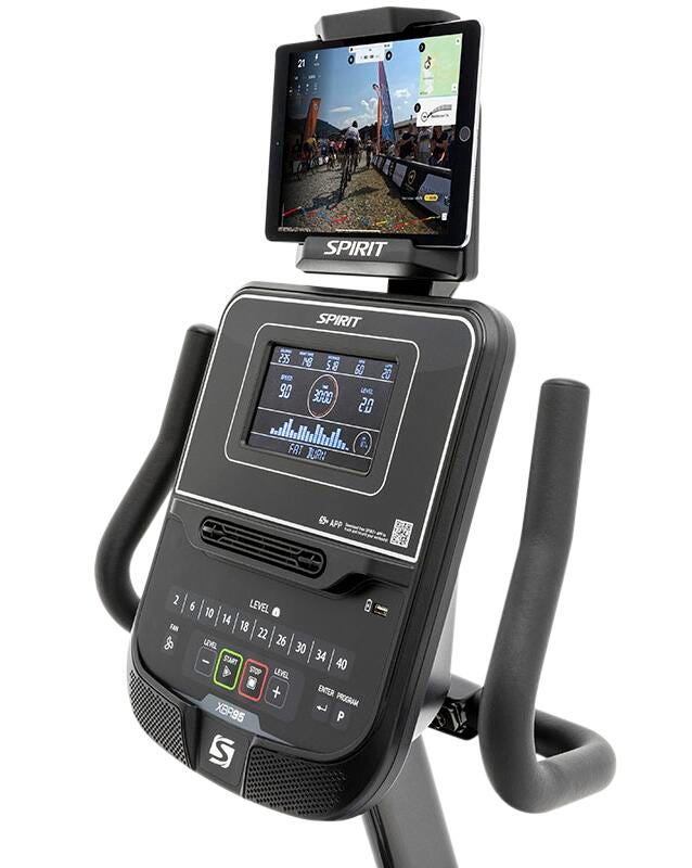 The ergonomic design and cord-free convenience of the XBR95 recumbent bike makes it a top performer for users of all levels. The XBR95 is self-powered, meaning no cords to worry about. With our bright 7.5" multi-color ClearView? console, you will stay engaged and informed while keeping track of the metrics you care about most, including a heart rate graph to help you stay in your zone. Handlebar resistance controls and a full range of direct resistance console buttons means no more stop and go adjustments. With a 30 lb flywheel and 40 levels of resistance, you will stay challenged during every training session. Bluetooth connectivity allows you to track your progress on the SPIRIT+ app or pair a wireless heart rate monitor (Bluetooth or 5KHz, sold separately), while built-in Bluetooth speakers make it easy to listen to your favorite music or podcast during your workout. A variety of preset programs, including a goal-oriented Time, Calories, and Distance Series, keep you motivated throughout your workout, and convenient handlebar pulse sensors on the lower handlebars are always within reach. Plus, our new removable swivel-tilt tablet holder makes it easy to keep your phone or tablet in view for entertainment or virtual fitness classes, without obscuring console workout data. Easily adjust the large high-density foam seat (forwards/back) or recline for a more comfortable position. Oversized, cushioned quick latch foot pedals and ergonomic hand grips ensure comfort at all touch points so you can keep moving.