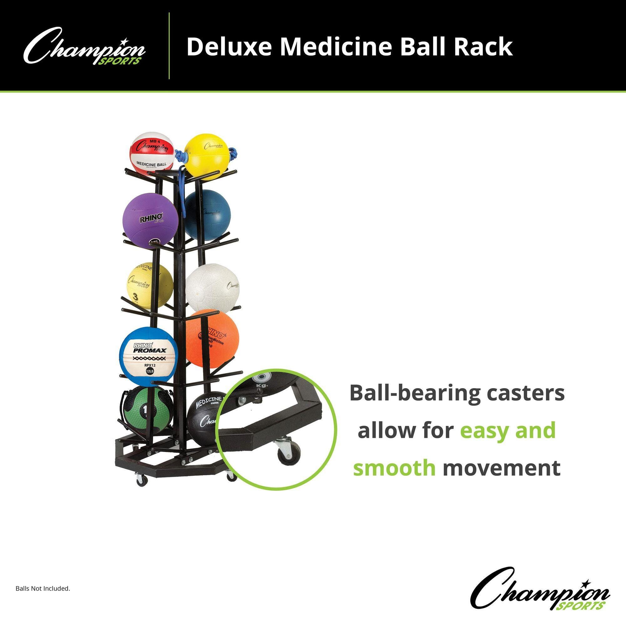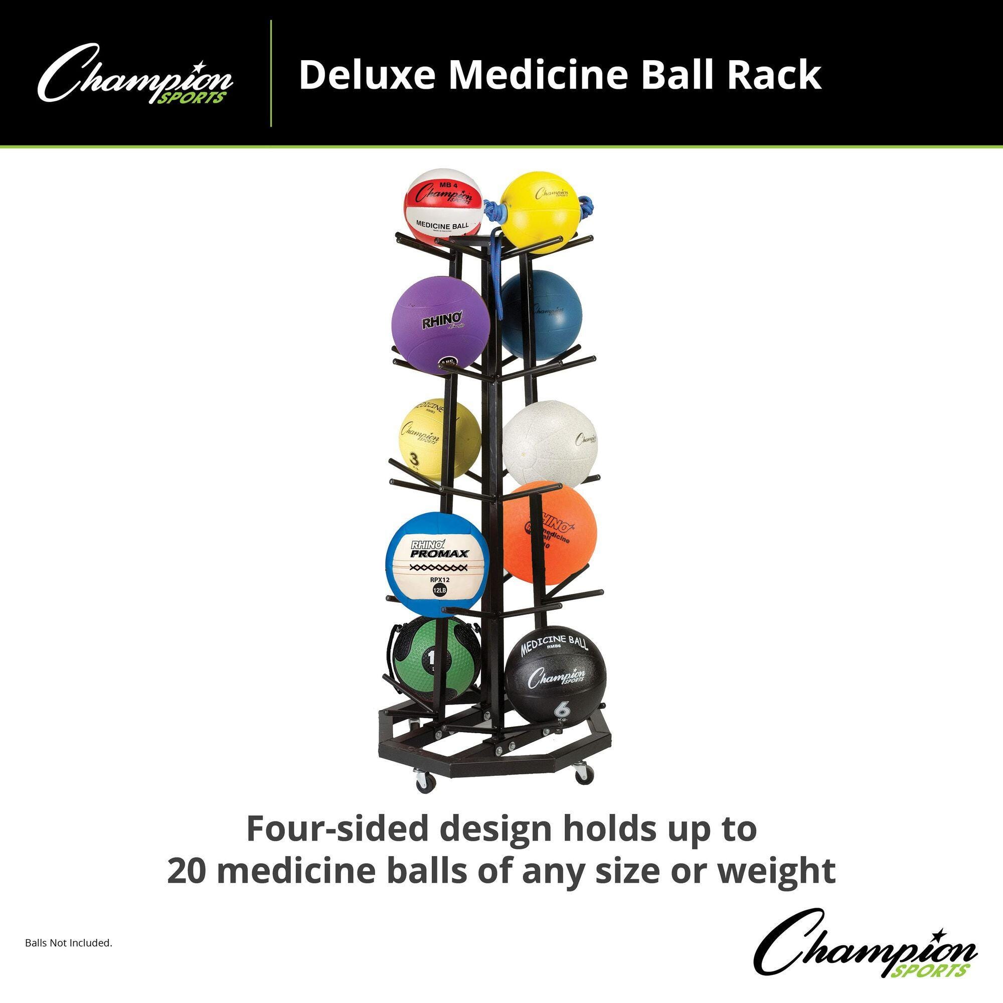 The Deluxe Medicine Ball Rack from Champion Sports keeps your equipment stored and organized! This handy rack helps you save space with a 20-ball capacity and features a strong steel tube construction. It has a nuetral black finish and four smooth ball-bearing casters for ease of movement around the exercise area or into storage. The rack measures 25 L x 25 W x 56 H inches. Assembly required. Balls not included.