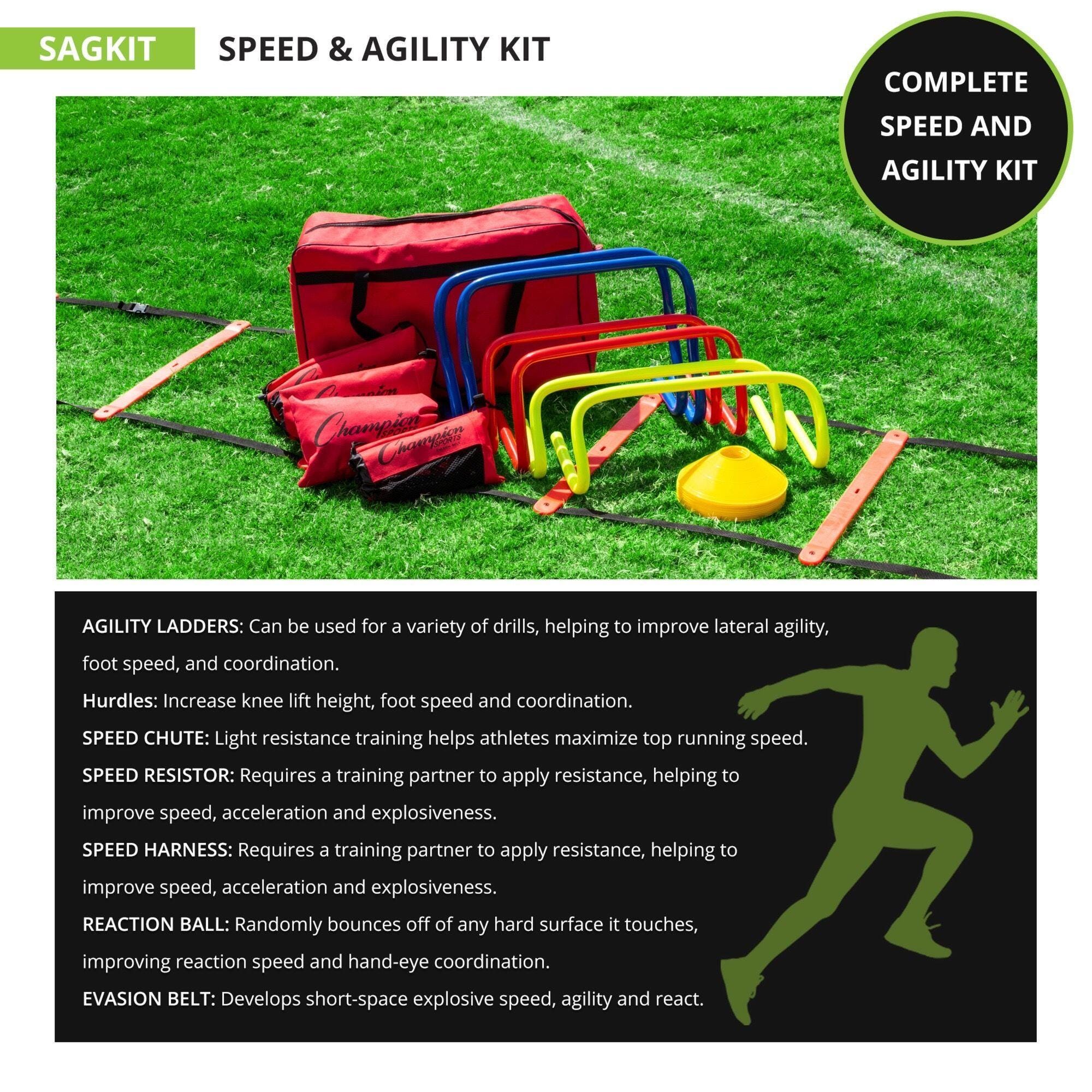 Description The Champion Sports Speed Agility Kit provides you with a comprehensive set of tools to improve athletic performance and ability. The variety of equipment allows you to practice and run drills that focus on different aspects of speed, agility, and coordination at any level. Great for the backyard or practice field, this portable kit is a must-have for athletes of any age looking to take their skills to the next level.Features Versatile equipment can be used for a variety of drills, obstacle courses, training circuits, and more Kit includes equipment to improve overall speed, agility, hand-eye coordination, reflexes, explosiveness, acceleration, foot speed, and more key athletic skills Durable materials ensure lasting use indoors and outside Convenient carry bag provides organized storage and easy transport Great for individual training or group practice drills Excellent resource for PE classes, sports teams, gyms, rec centers, and personal training Includes: