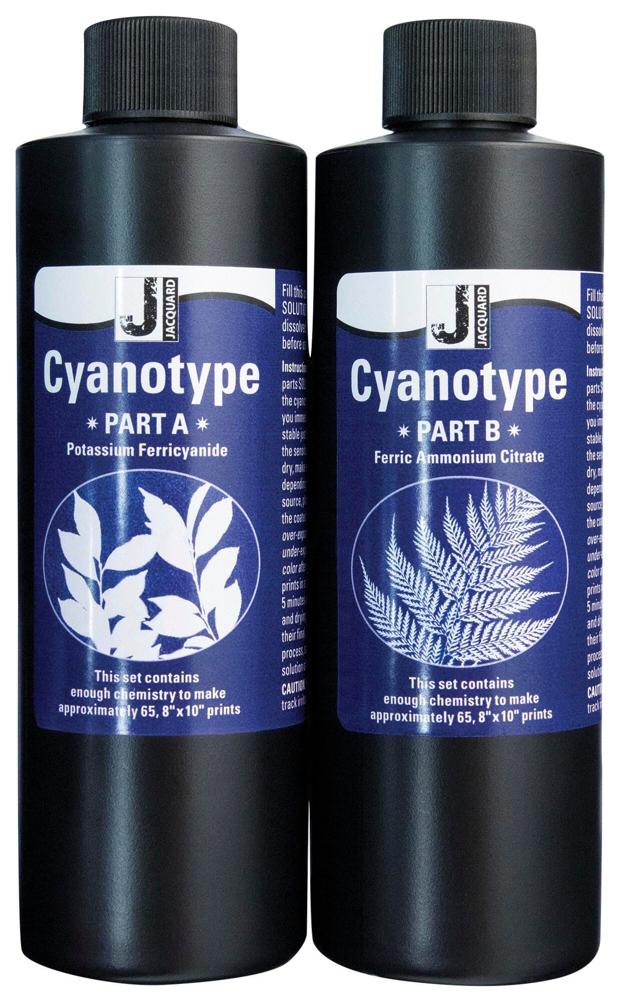 Jacquard's Cyanotype Sensitizer Set makes DIY cyanotype printing as easy as can be. The chemistry comes premeasured in lightproof black bottles. To use, fill each bottle with water to create Stock Solutions A and B, then mix the two in equal parts to create the cyanotype sensitizer. Coat fabric or paper with the sensitizer and, once dry, create prints by exposing to sunlight or UV (3 to 15 minutes, depending on conditions), using objects or a film negative to create an image. After exposure, process prints in a tray of cool water and allow to air dry over about 24 hours; prints will oxidize to their final deep blue color. To instantly oxidize the print to its final color, submerge in a dilute bath of hydrogen peroxide after washing, then rinse and dry. Contains enough chemistry to make approximately 65 prints on 8-1/2 x 11 inch paper or 50 prints on 8-1/2 x 11 inch fabric, depending on the absorbency of the substrate.Includes: