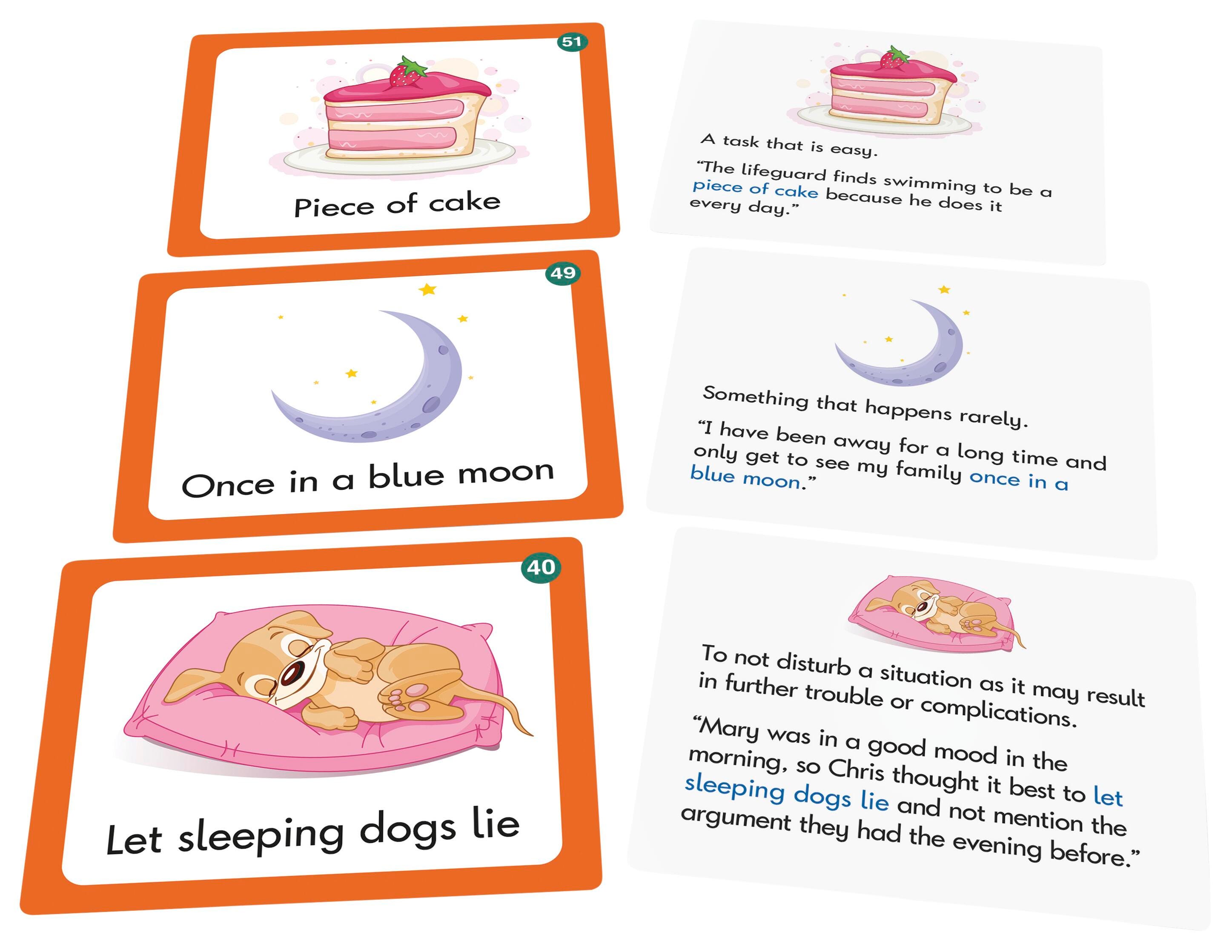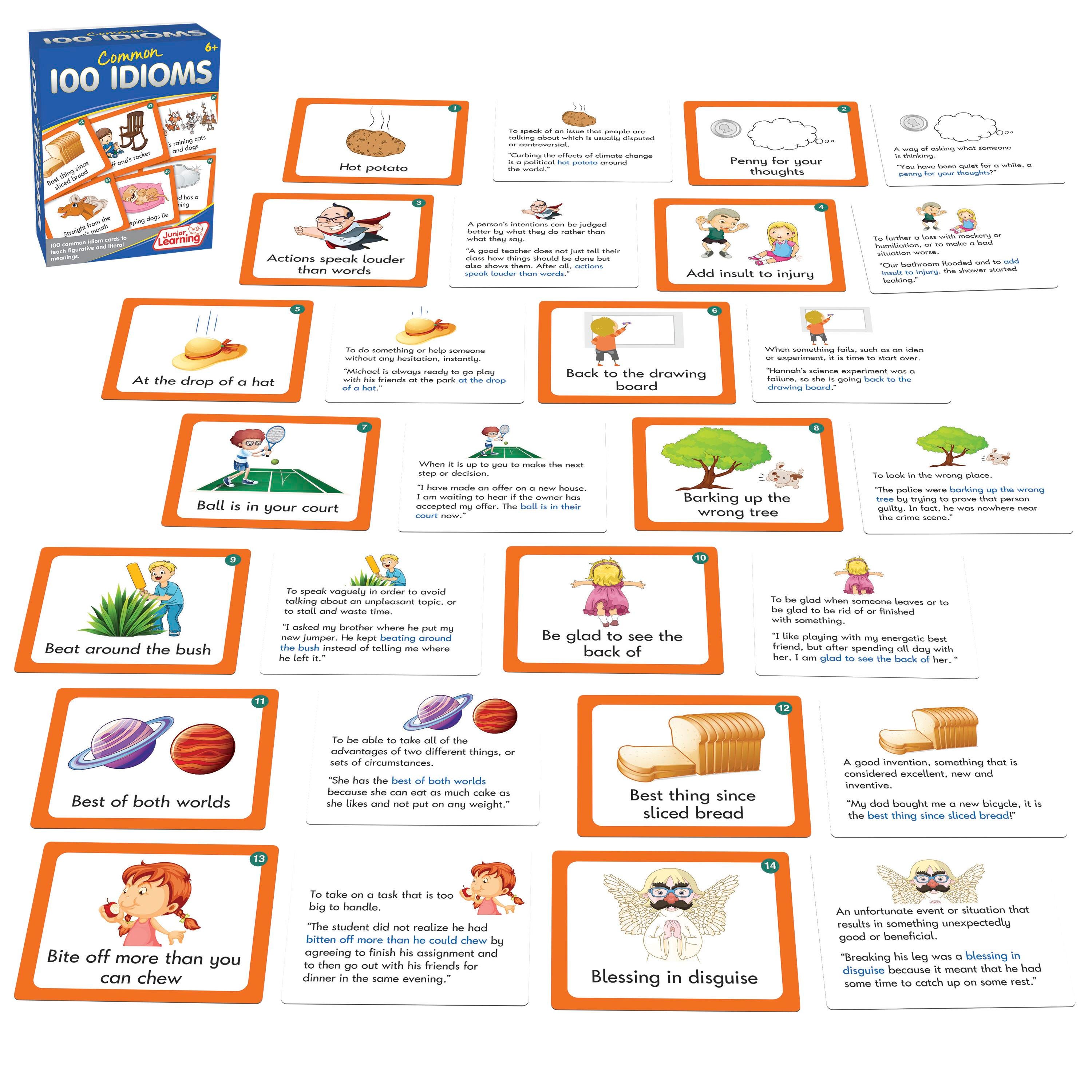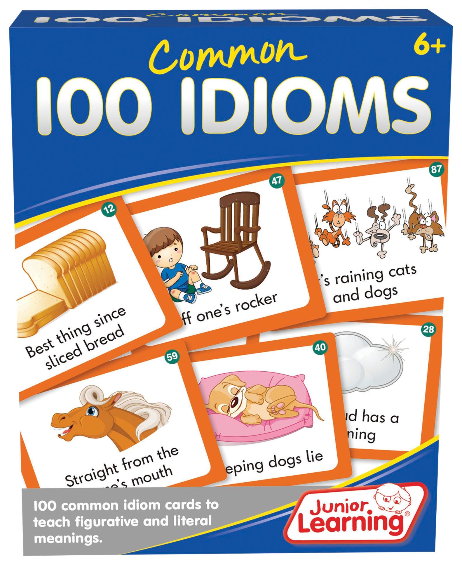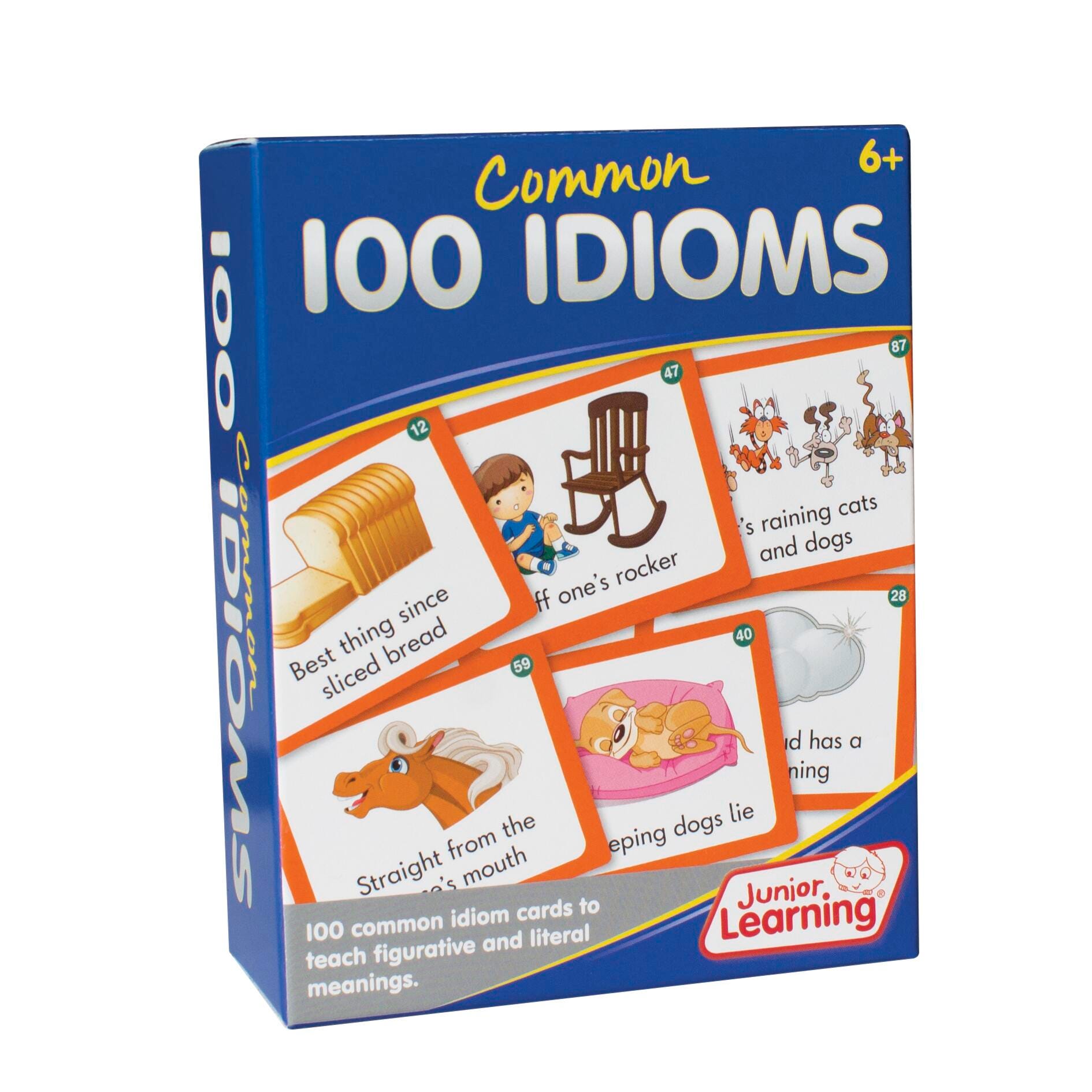 Description 100 Common Idioms cards teaches children about some everyday English conversational phrases such as “do not judge a book by its cover.” Contains a set of 100 cards. Ages 6 and up.Features Helps to understand the literal and figurative meanings of idioms and when it is appropriate to use them Double-sided cards have a colorful illustration on one side and the meaning of the idiom and its use in a sentence on the other Perfect for the classroom or to supplement at-home learning