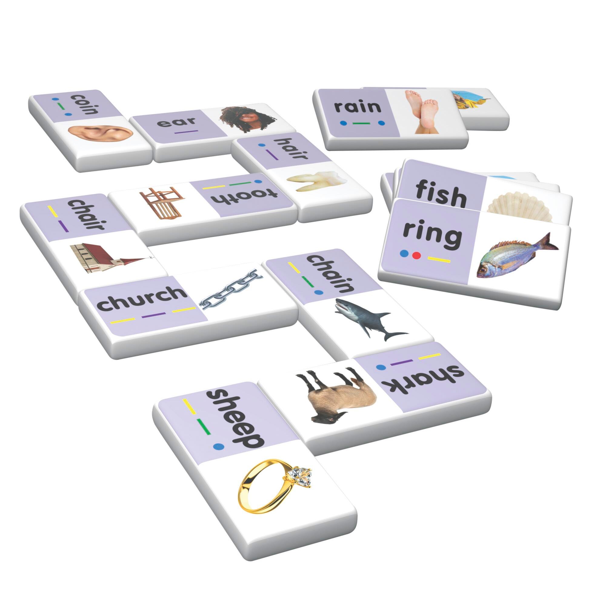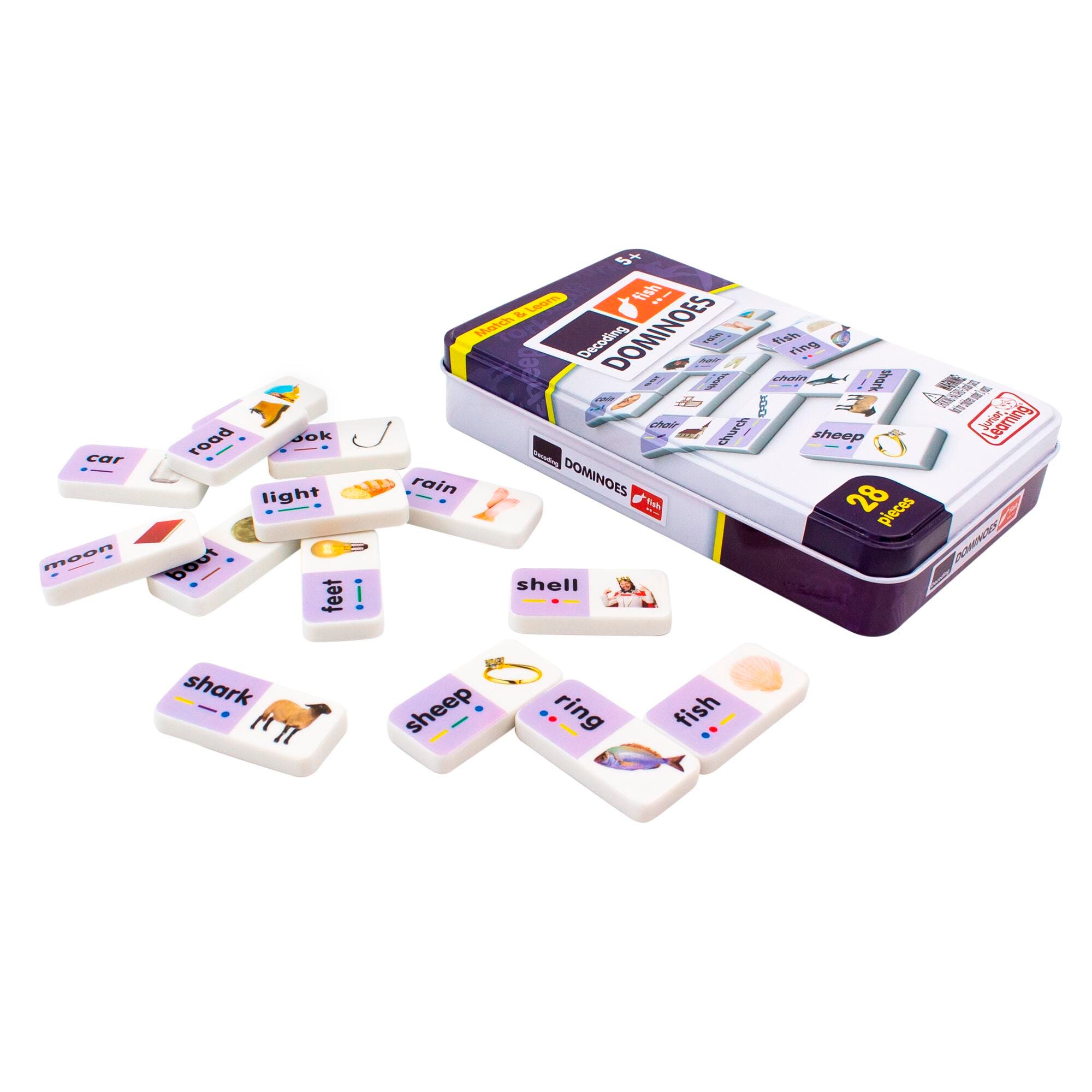 Decoding dominoes include a 28 piece set on thick plastic dominoes. Dominoes come in a collectors tin for storage. Children will love the feel of real dominoes as they complete the decoding matching game.Features
