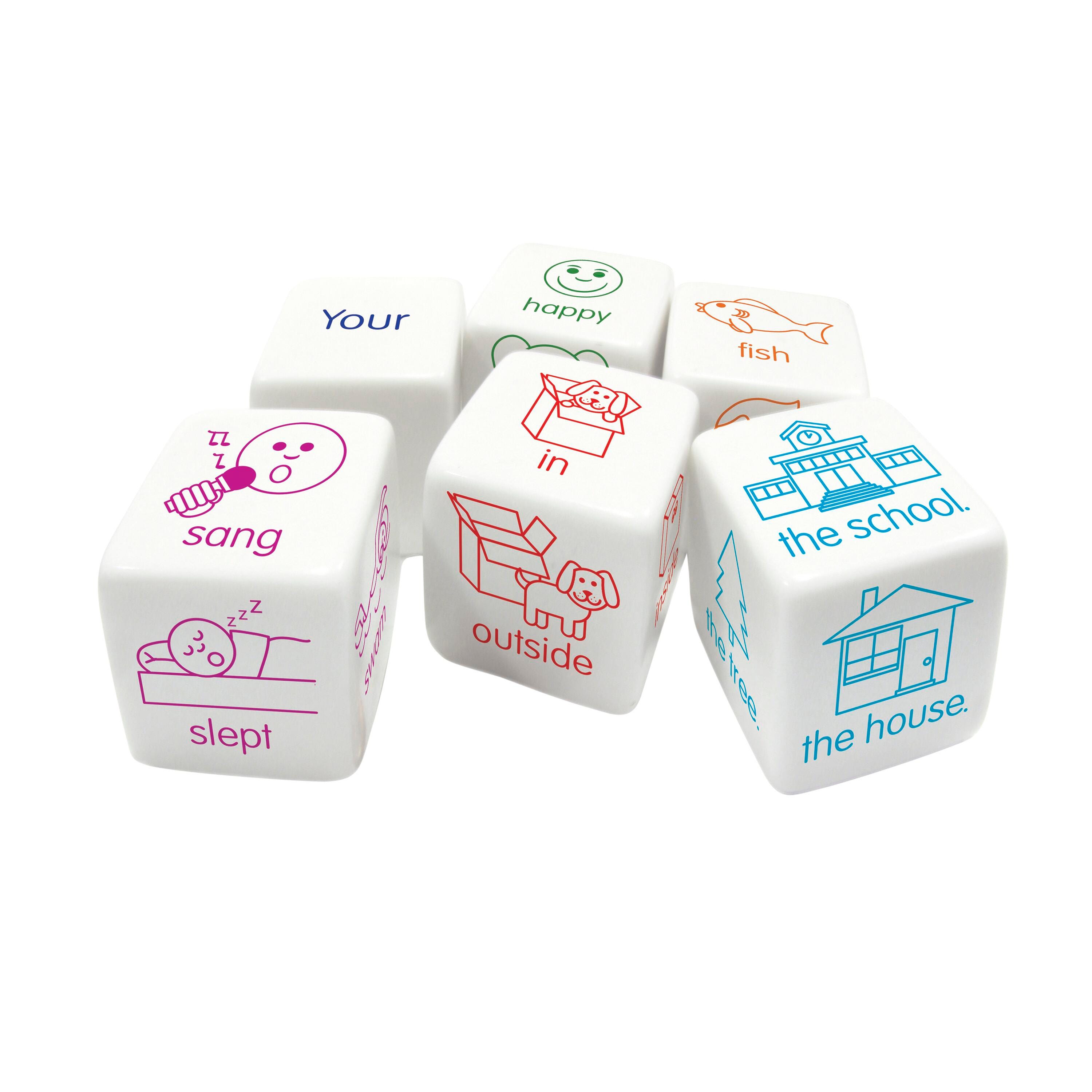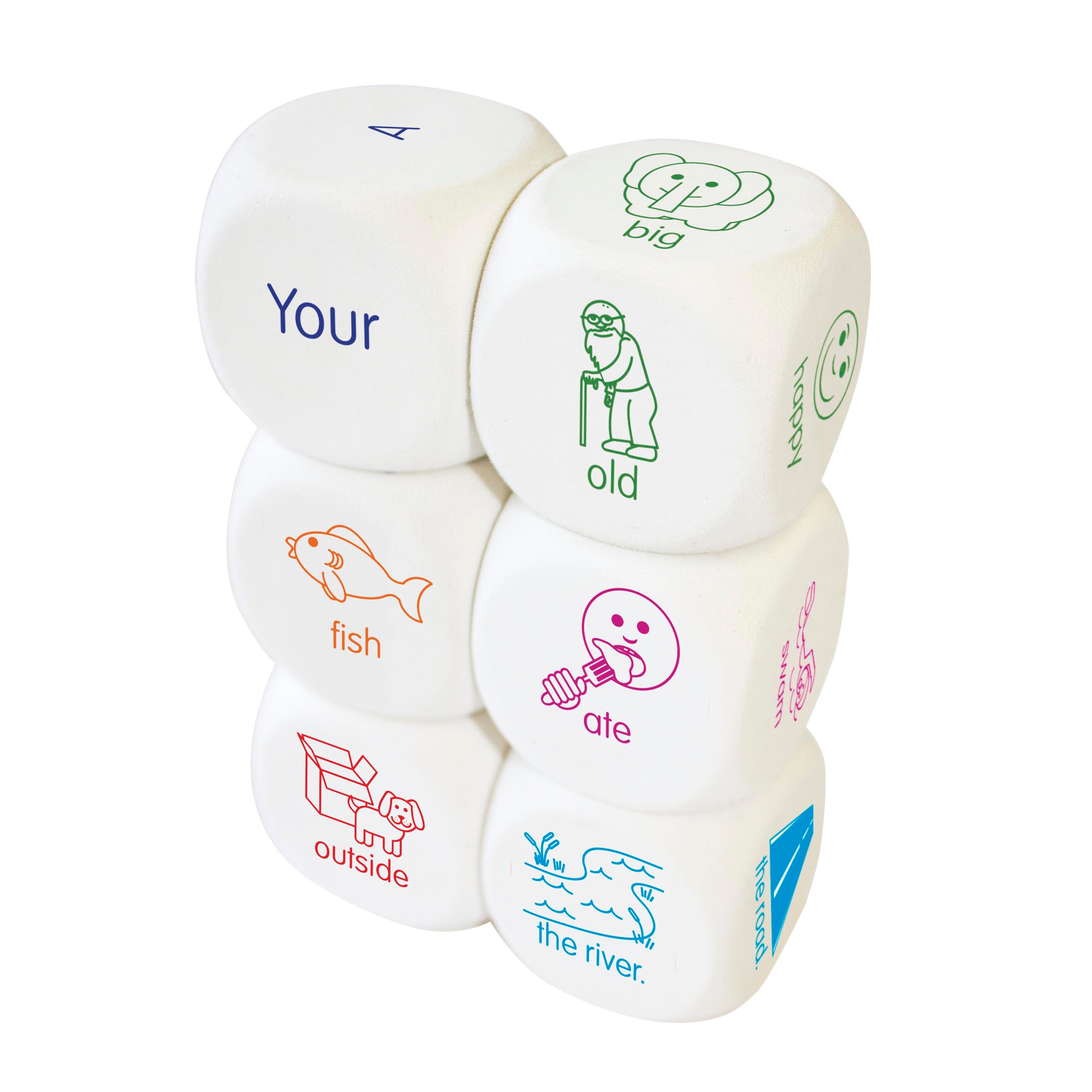 Description Sentence Dice are a collection of 6 soft dice for building sentences. Covers different parts of speech (such as nouns, verbs, prepositions) for building sentences. Ages 4 and up.Features Photographic images used to support learning Parts of speech are color-coded for easy identification and memorization Perfect for classroom activities or for family engagement