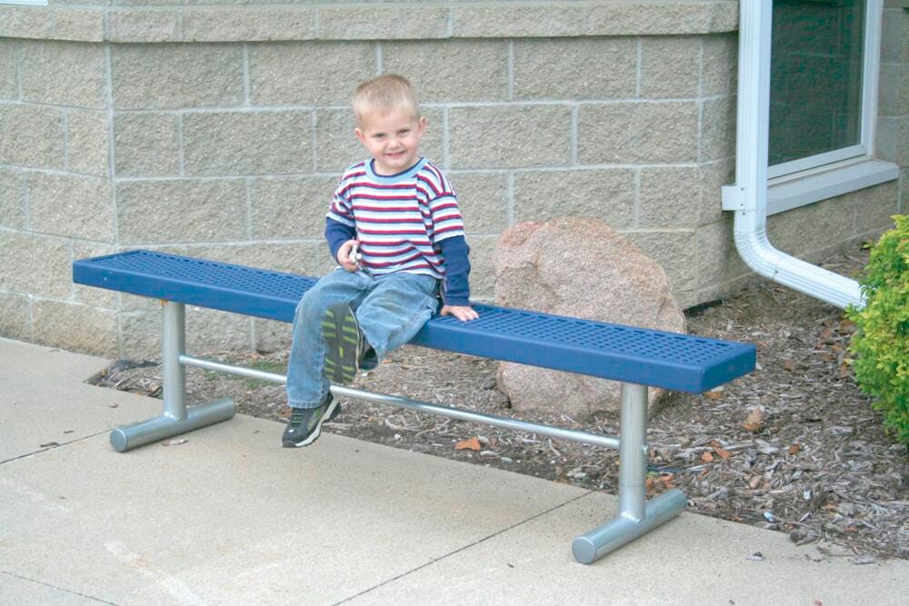 Indestructible Portable Player Bench without Back has an open weave design that allows water and sun through, leaving the grass below green and alive. The nonporous plastisol coating resists common acids, alkalis, salts, alcohols, acid rain, sewage or sea water, and does not support bacteria or fungus growth nor will stain and is flame-resistant. The T-Style legs are made of 2-3/8 inch galvanized steel and is 16-3/8 inches deep.