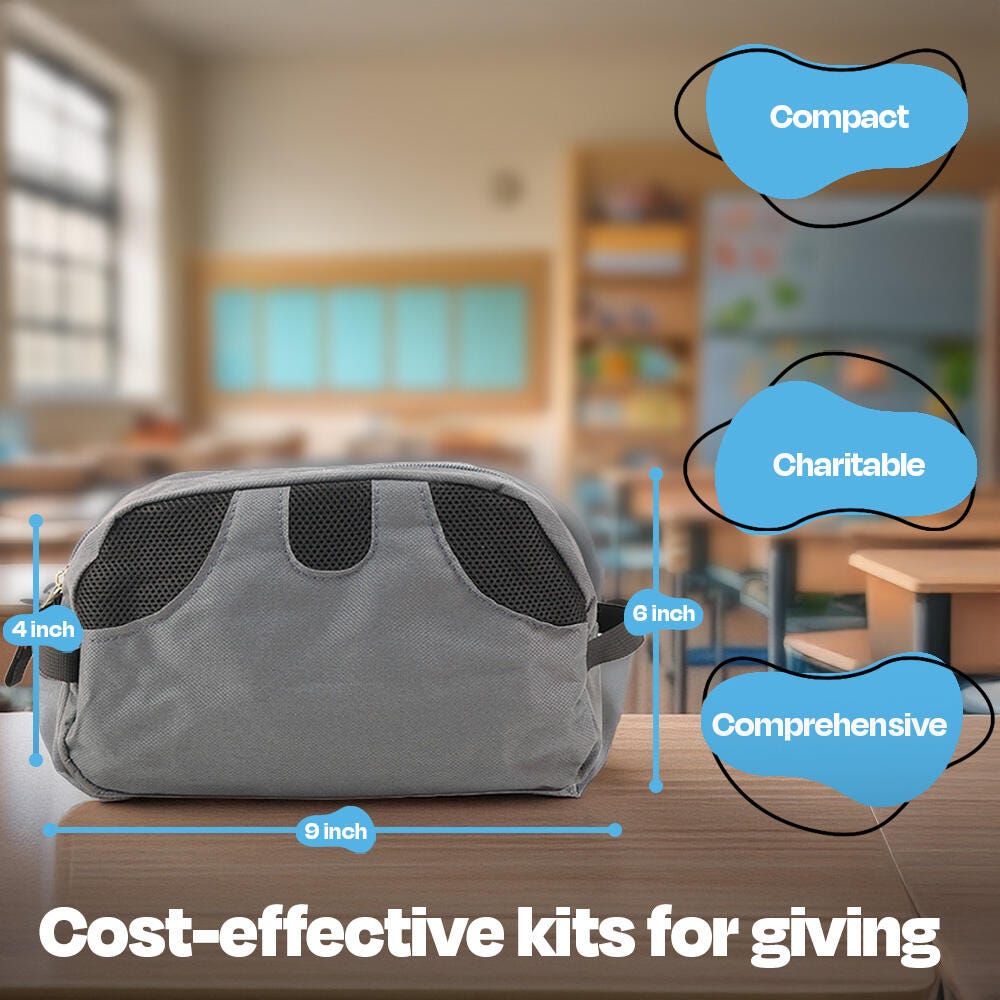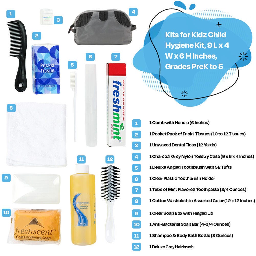 Features Pre-assembled essential supply kits for those in need are delivered to your choice of destination completely assembled and ready for distribution Products come inside a reusable nylon toiletry bag for easy distribution and storage All included items are tested and meet the standards for quality and safety for children's products Cost- and labor-effective choice for schools, care organizations, non-profits, charities, and any facility or family in need Kits for Kidz hygiene kits are also available in Young Adult, Grade 6 to 12 (Item # 2117988), Adult (2117993), and Standard (2117995) or Deluxe Feminine (2117426) versions, each sold separately Kit Includes: 1 Comb with Handle (6 Inches) 1 Deluxe Angled Toothbrush with 52 Tufts 1 Shampoo & Body Bath Bottle (8 Ounces) 1 Pocket Pack of Facial Tissues (10 to 12 Tissues) 1 Deluxe Gray Hairbrush 1 Tube of Mint Flavored Toothpaste (3/4 Ounces) 1 Clear Plastic Toothbrush Holder 1 Unwaxed Dental Floss (12 Yards) 1 Anti-Bacterial Soap Bar (4-3/4 Ounces) 1 Cotton Washcloth in Assorted Color (12 x 12 Inches) 1 Clear Soap Box with Hinged Lid 1 Charcoal Grey Nylon Toiletry Case (9 x 6 x 4 Inches)