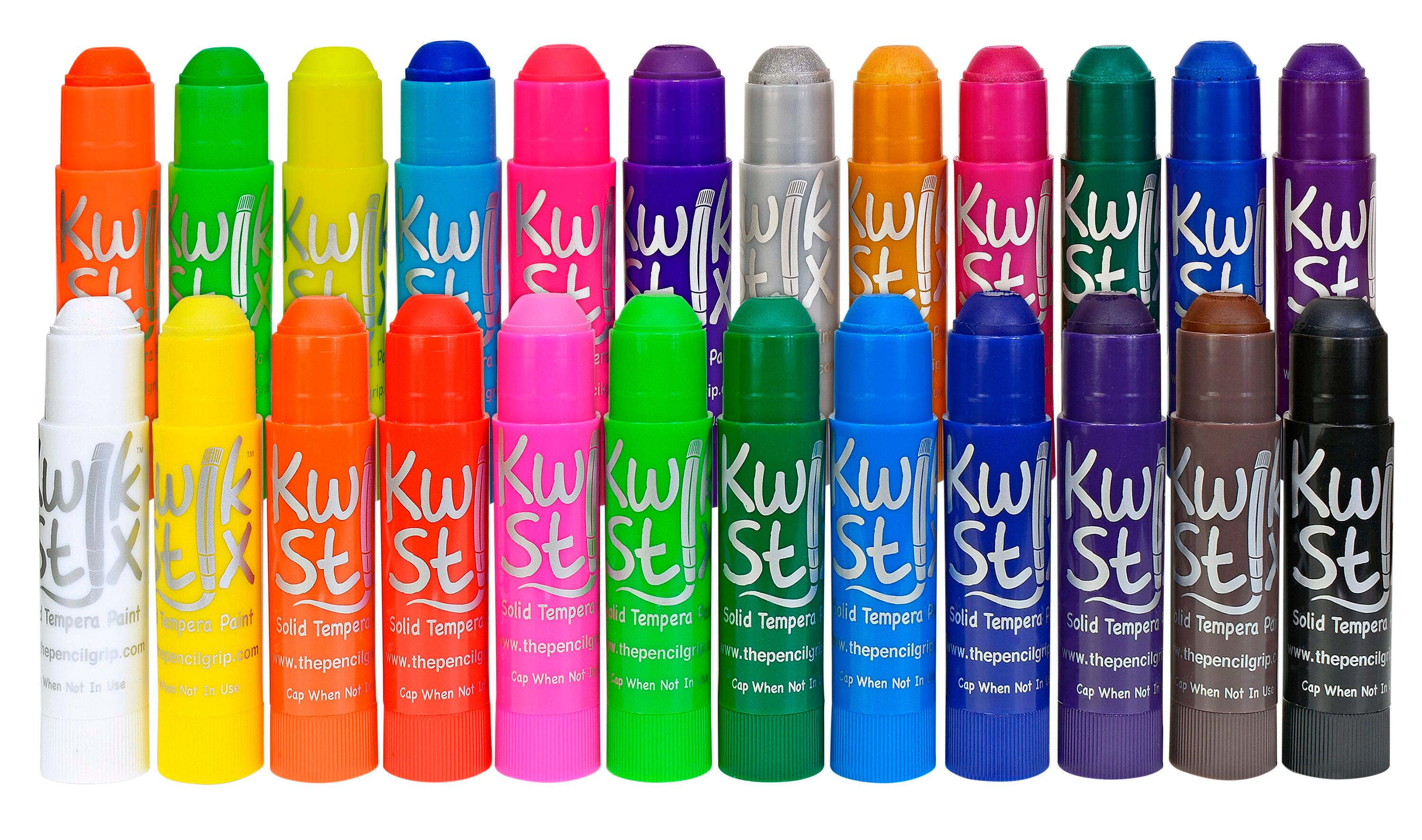 Take the mess out of painting while keeping all the fun by putting tempera paint in a solid stick form. Simply uncap, twist and paint! Kwik Stix have a fast drying formula, allowing them to dry within 90 seconds while leaving a paint-like finish. No cups, smocks, water, brushes - or cleanup - required! Kwik Stix offer coverage that won't crack, and are perfect for poster paper, cardboard, wood, canvas and more. Sold as a set of 12 in assorted colors.Features