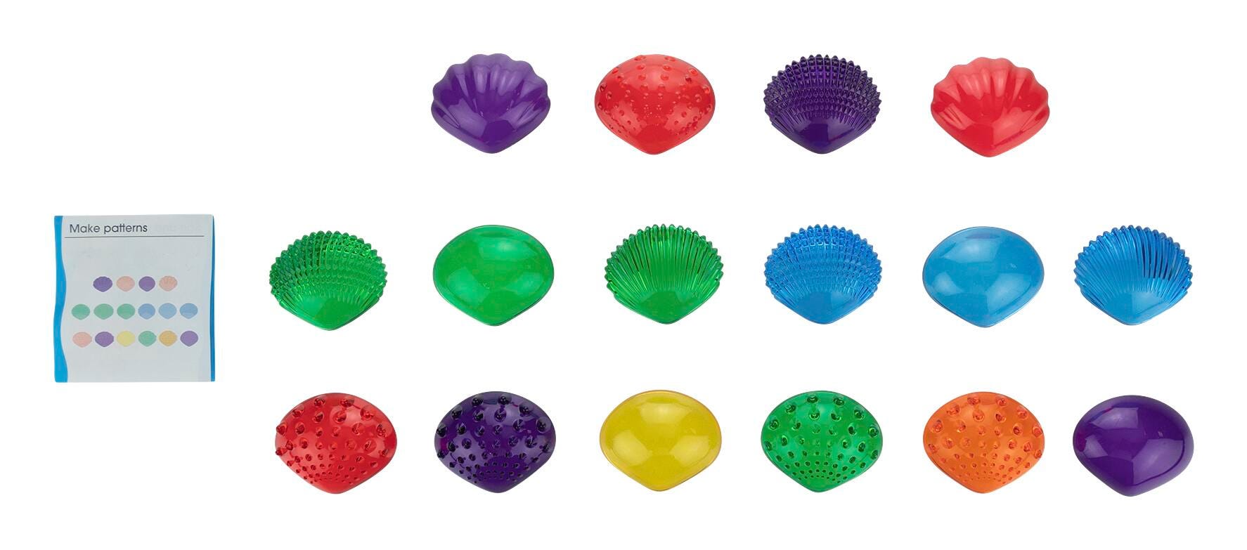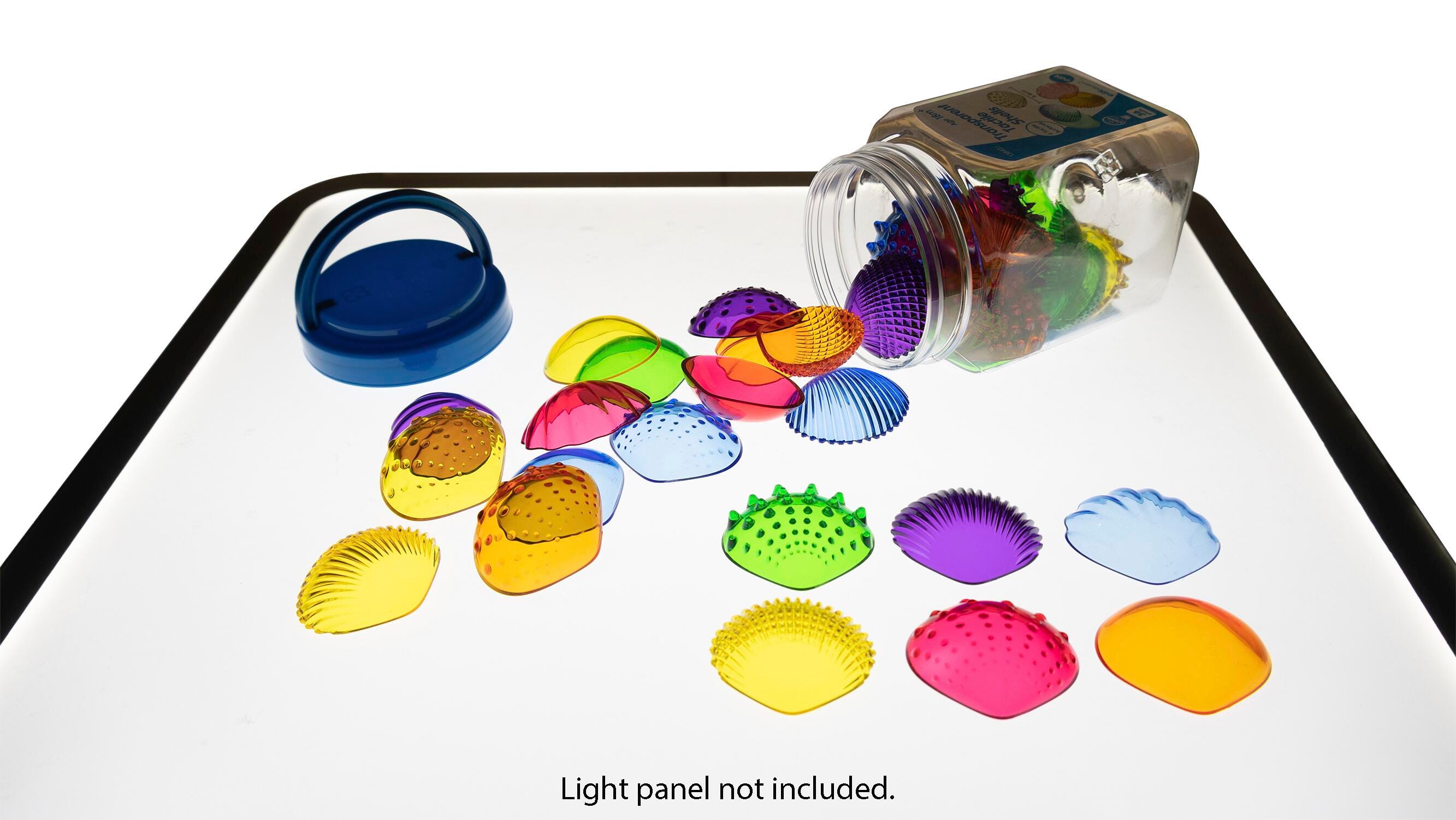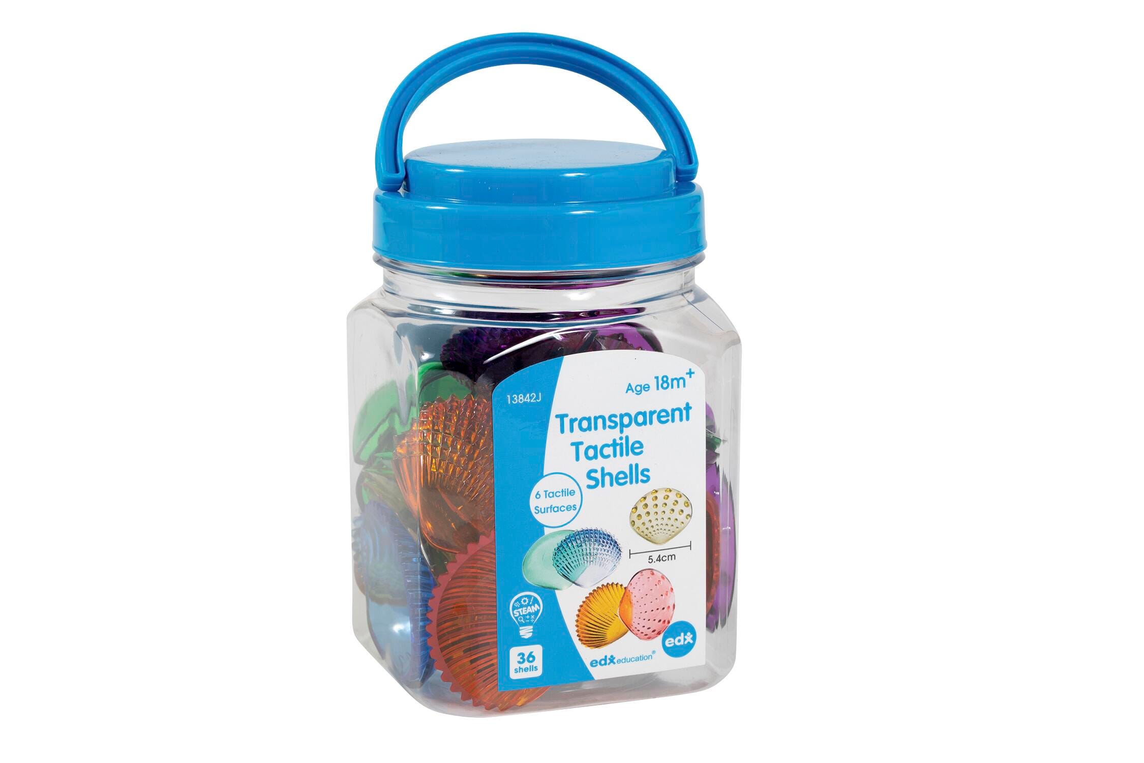 This set includes 36 seashell-shaped pieces in 6 different transparent colors (red, yellow, orange, green, blue and purple) and 6 different textures. It also includes an activity guide. These multicolored, see-through shells are perfect for counting, sorting, patterning, comparing, matching and classifying. Ideal for tactile learners, these shells are a great resource to explore STEM concepts via light panels or sensory bins. Foster fine motor skills as children use these hands-on manipulatives to learn addition, subtraction and symmetry. Made with durable plastic and rounded edges, these shells are the perfect math manipulative for home or classroom learning. Transparent Tactile Shells are packaged in a plastic jar with lid for easy cleanup and storage. Size: 1-3/4 L x 2-1/10 W inches. For ages 18m+.Features
