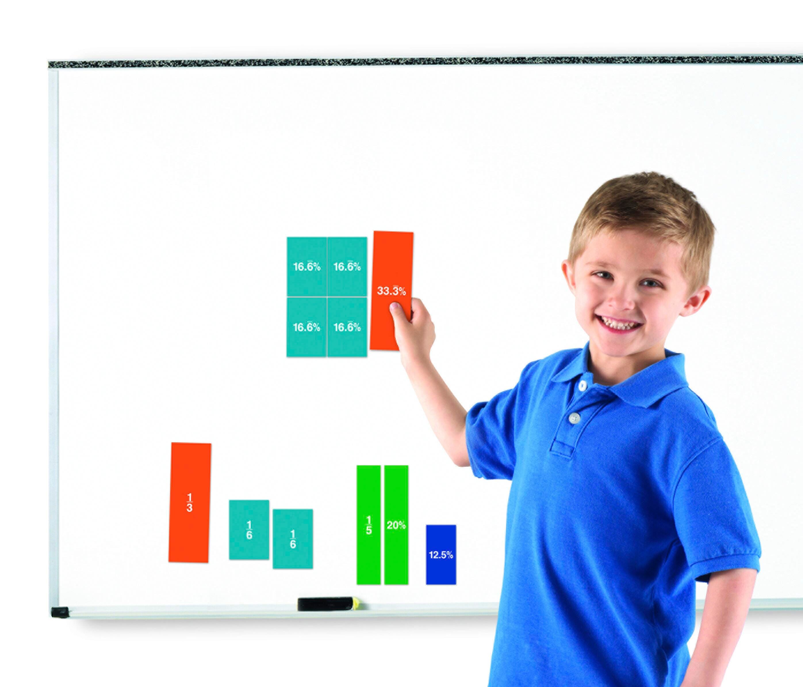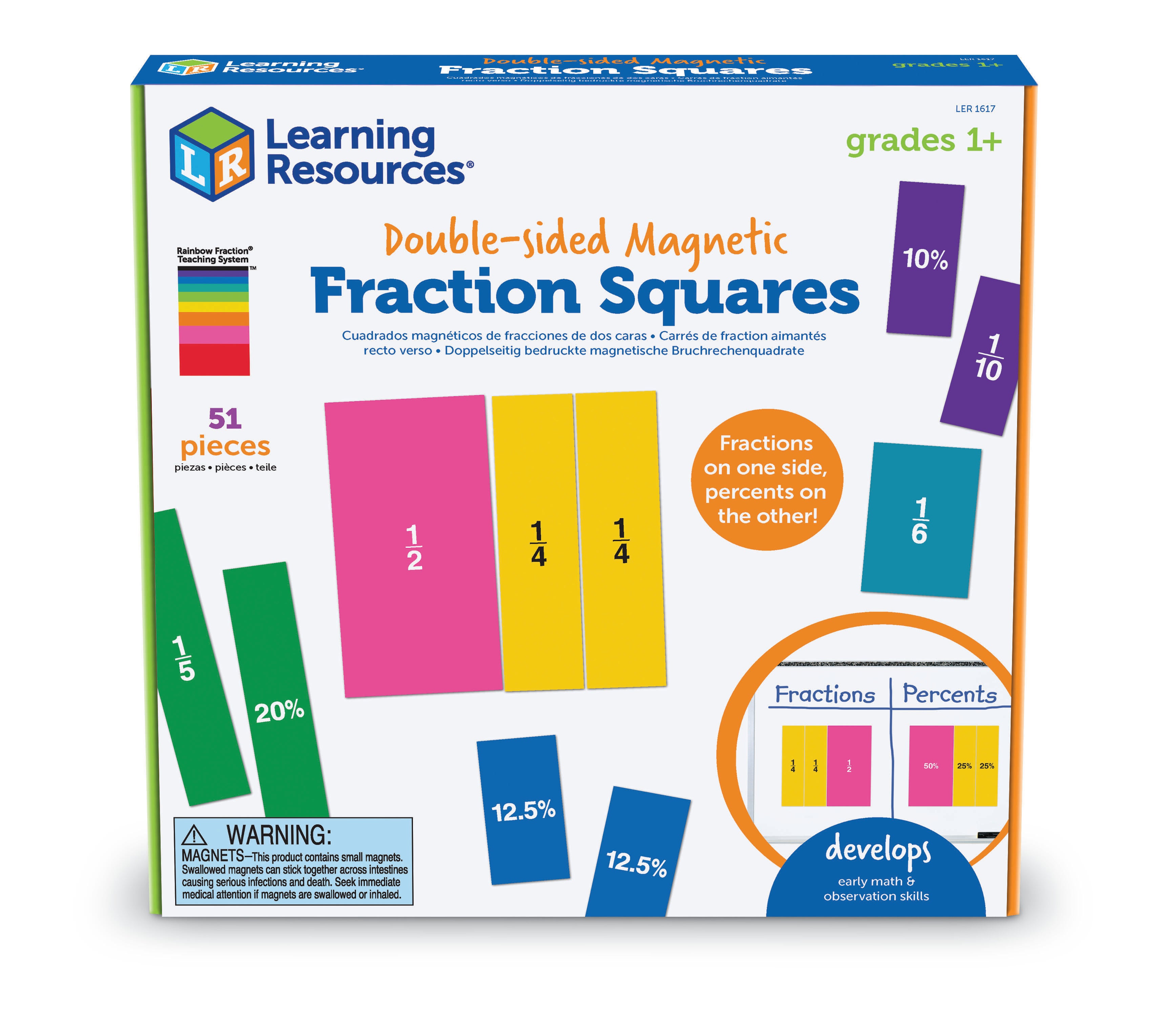This set of Magnetic Fraction Squares from Learning Resources offers a hands-on way to build math skills. The double-sided, color-coded, magnetic squares have fractions on one side and percentages on the other to help students understand the relationships between fractions and percentages. Fractions are easier to comprehend when they can be easily visualized as a whole with this handy set. It includes 51 pieces: 1 whole, halves, thirds, fourths, fifths, sixths, eighths, tenths, and twelfths. Whole squares measure 6-1/2 x 6-1/2 inches.