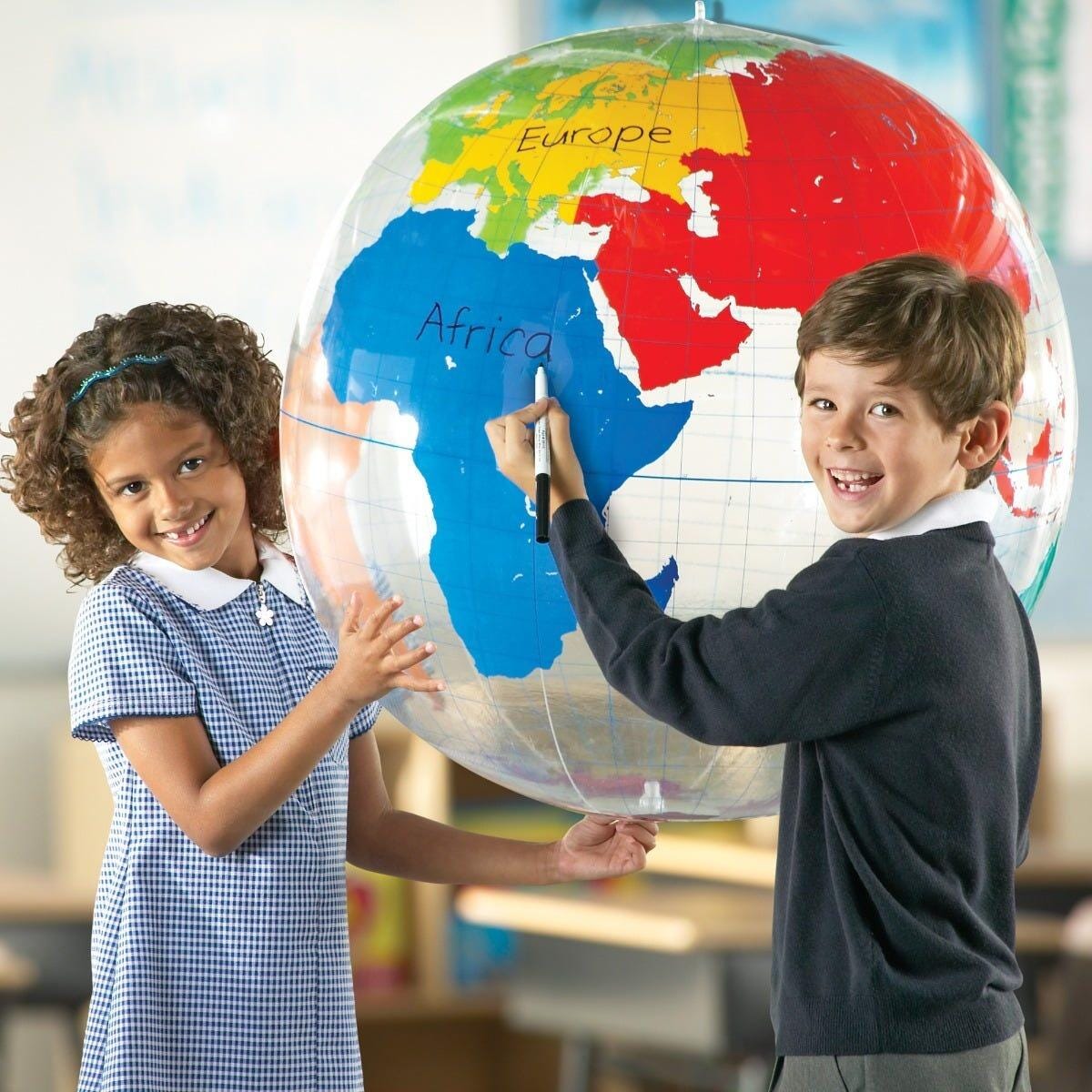 • Colorful and bold inflatable world globe offers hands-on way for kids to study geography, history, trade routes, climate, and more