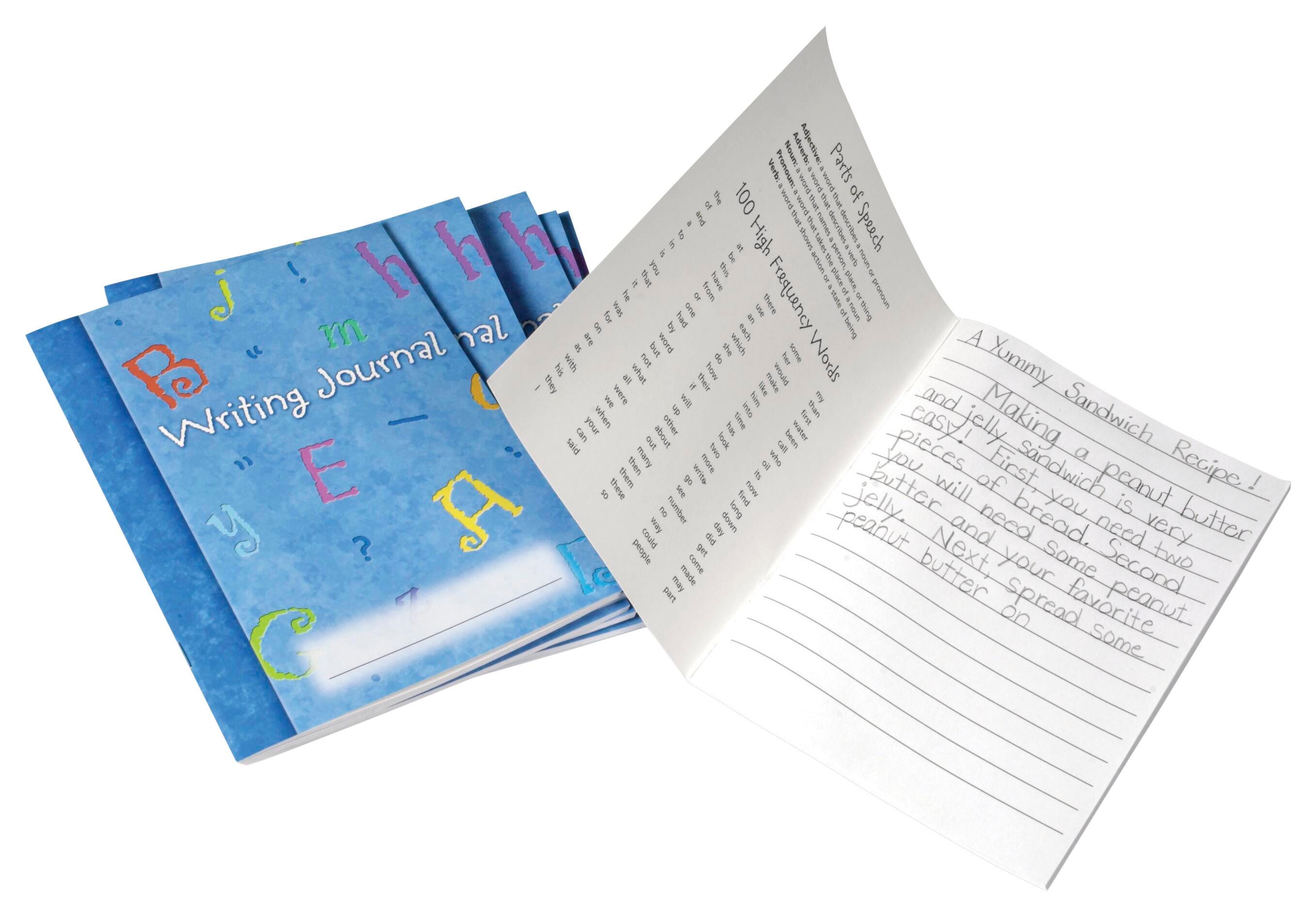 The Learning Resources Writing Journals are an excellent choice for classroom writing exercises and practice. Each journal contains 64 lined pages, perfect for practicing penmanship, building sentences, spelling exercises, creative writing, and so much more. With helpful information printed on the inside of the cover, these journals provide definitions for the parts of speech, a list of commonly misspelled words, and 100 high-frequency words. This pack contains 10 journals. Recommended for ages 6 and up.
