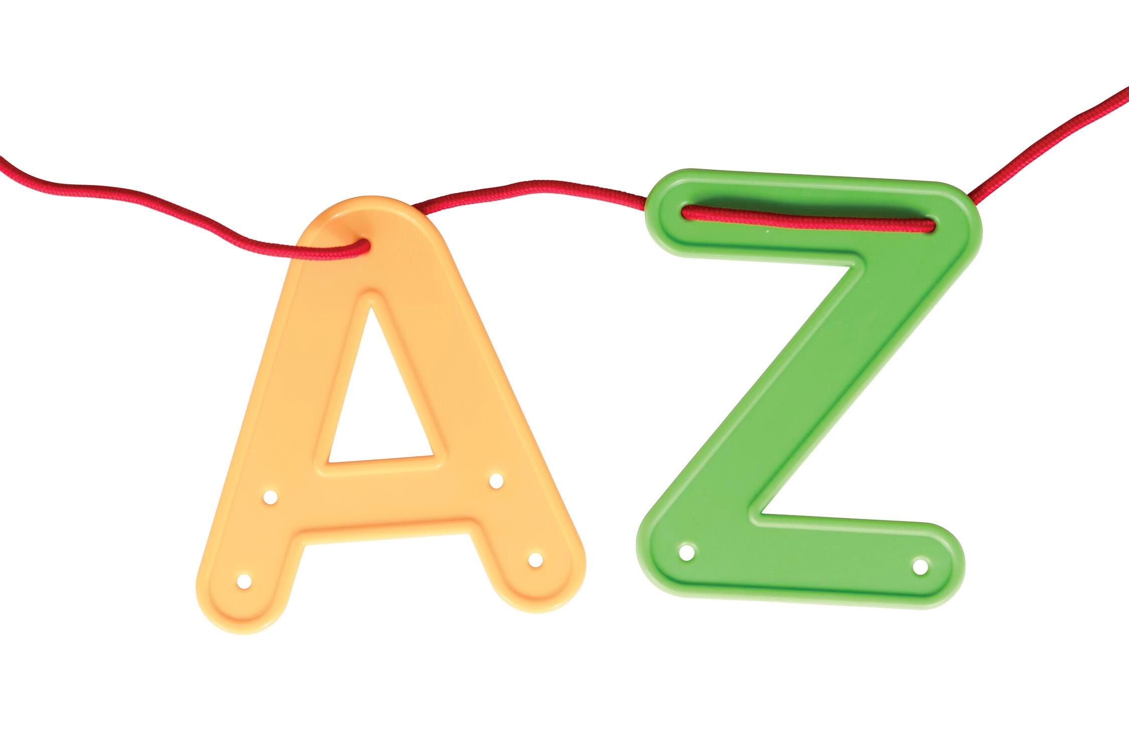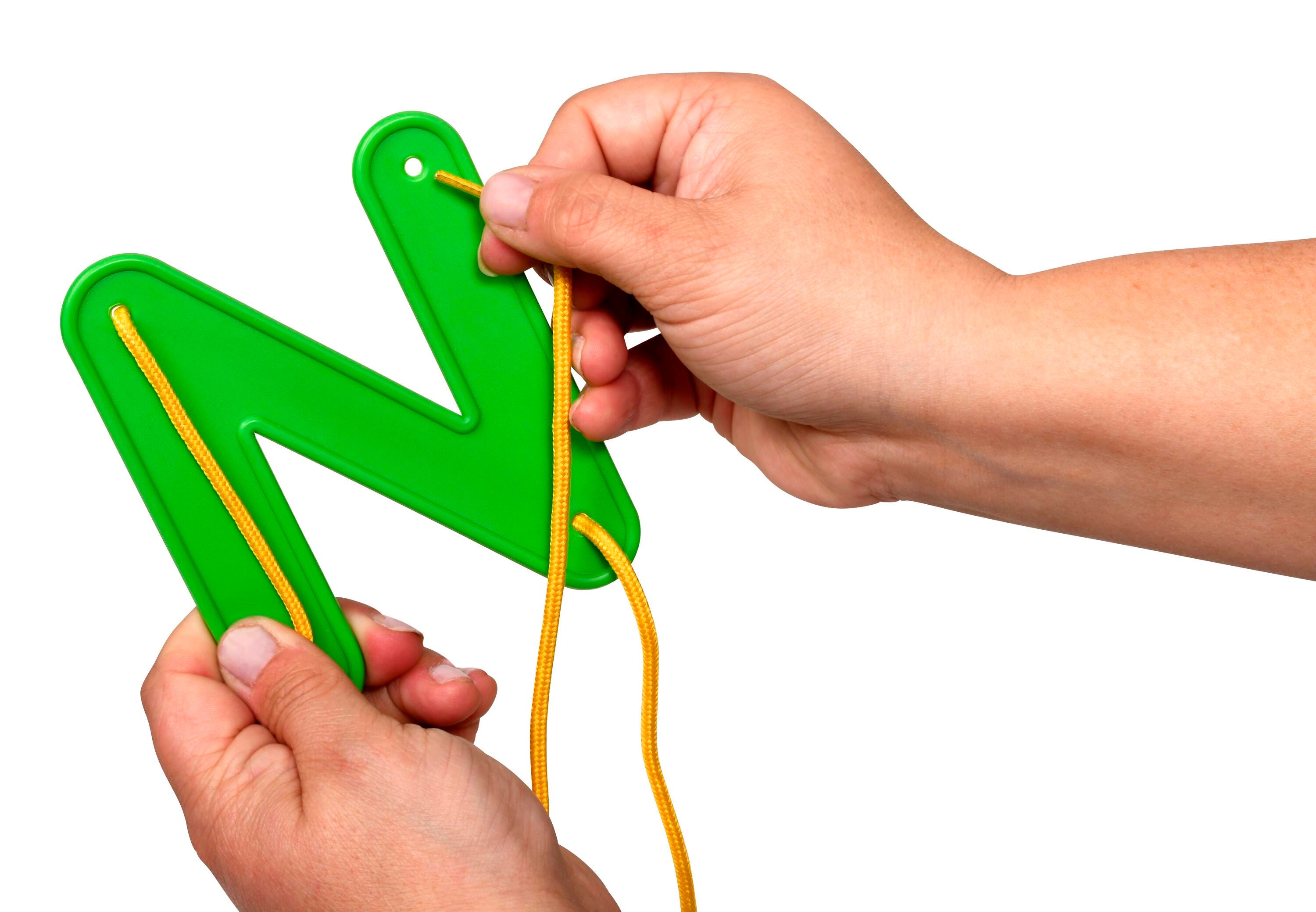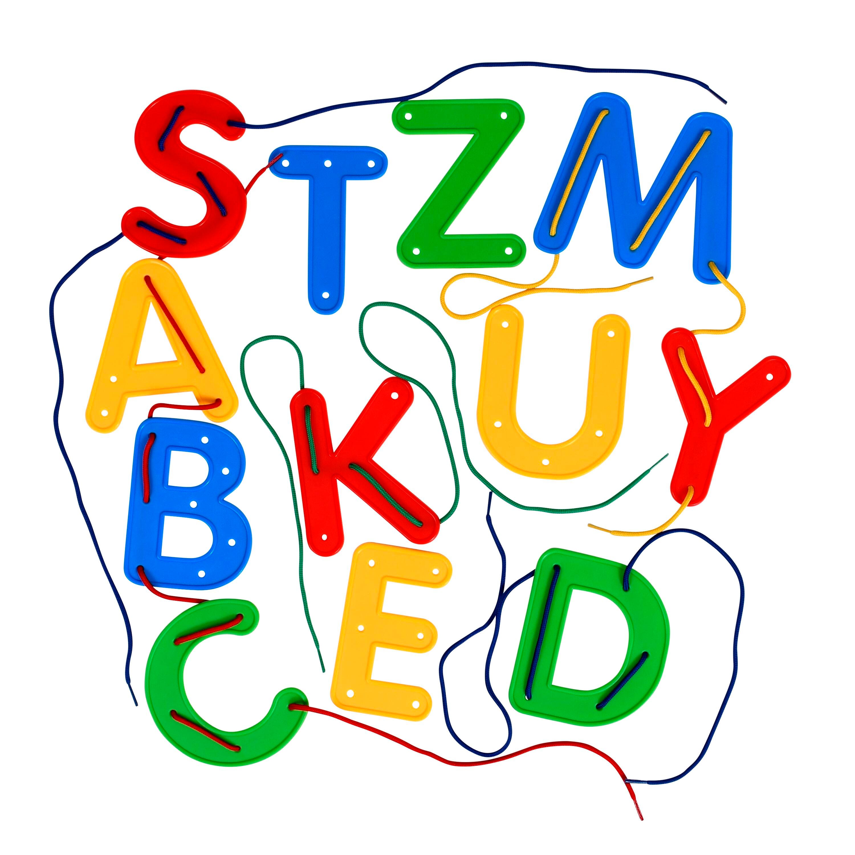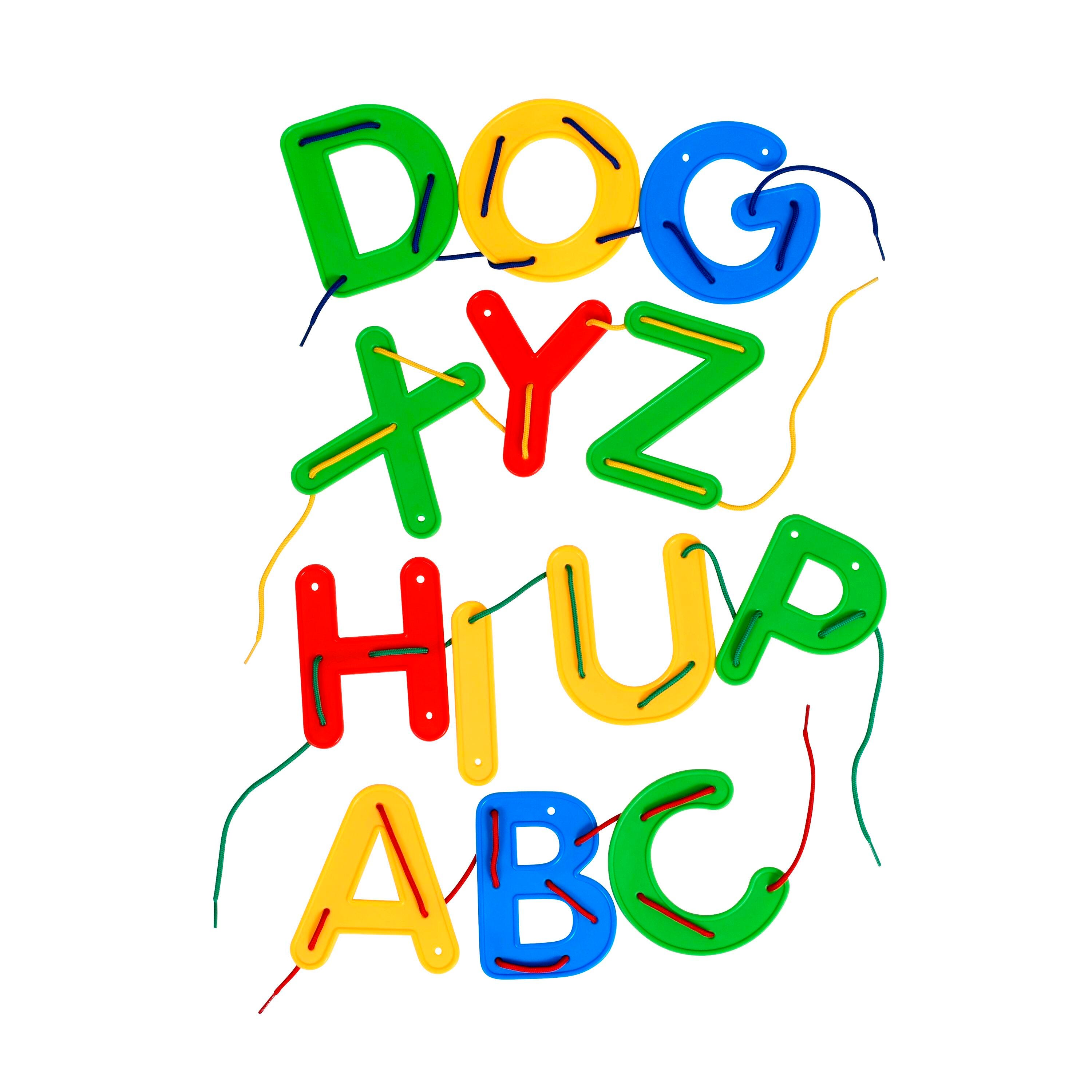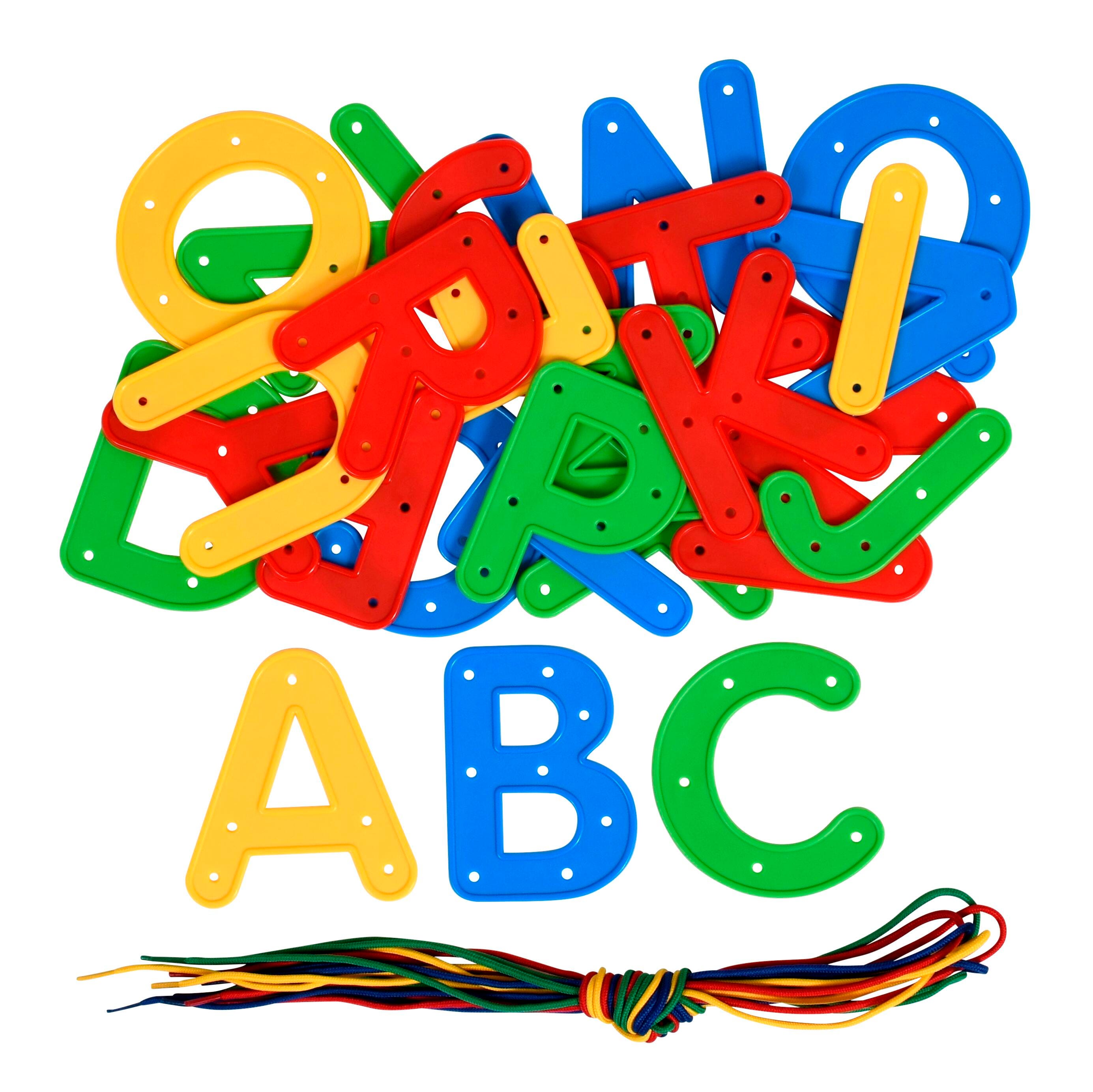 The large letters feature raised edges so they can be easily picked up and held by small hands while lacing