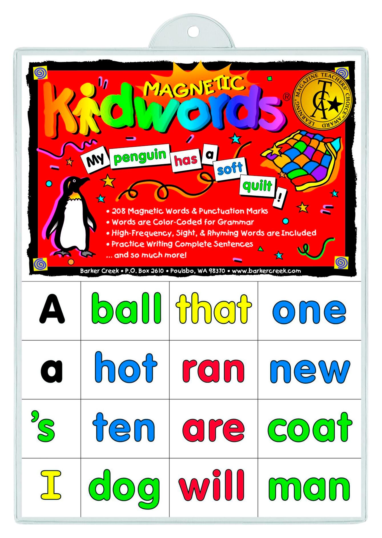 Barker Creek's award-winning set of magnetic words makes it easy to practice writing complete sentences, master difficult grammar concepts, and enhance creative writing skills! The set includes 208 magnetic words, which are color-coded for grammar, and punctuation marks. By simply replacing a green word with another green word, your students can instantly see what a noun's job is in a sentence. Repeat the exercise with verbs, adjectives, pronouns, etc. and watch their reading and writing ability soar! The words included in this set are a well-researched mix of the most commonly used words in the English language (from both the Dolch and the Fry word lists), sight words, rhyming words, and nouns that begin with every letter of the alphabet (great for teaching phonics and letter recognition).
