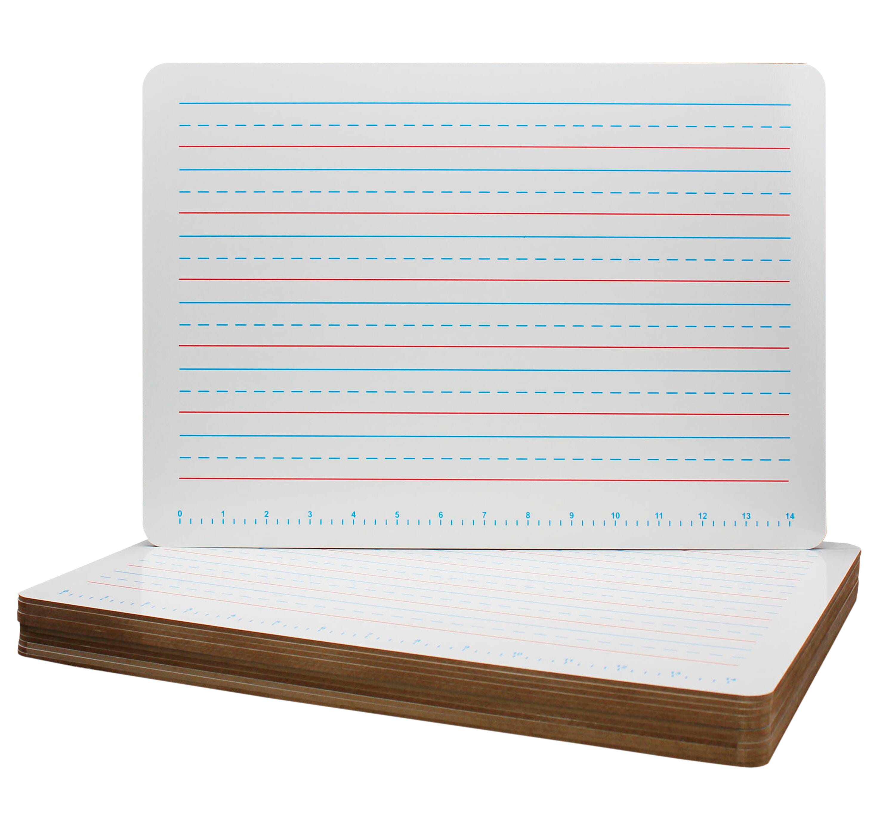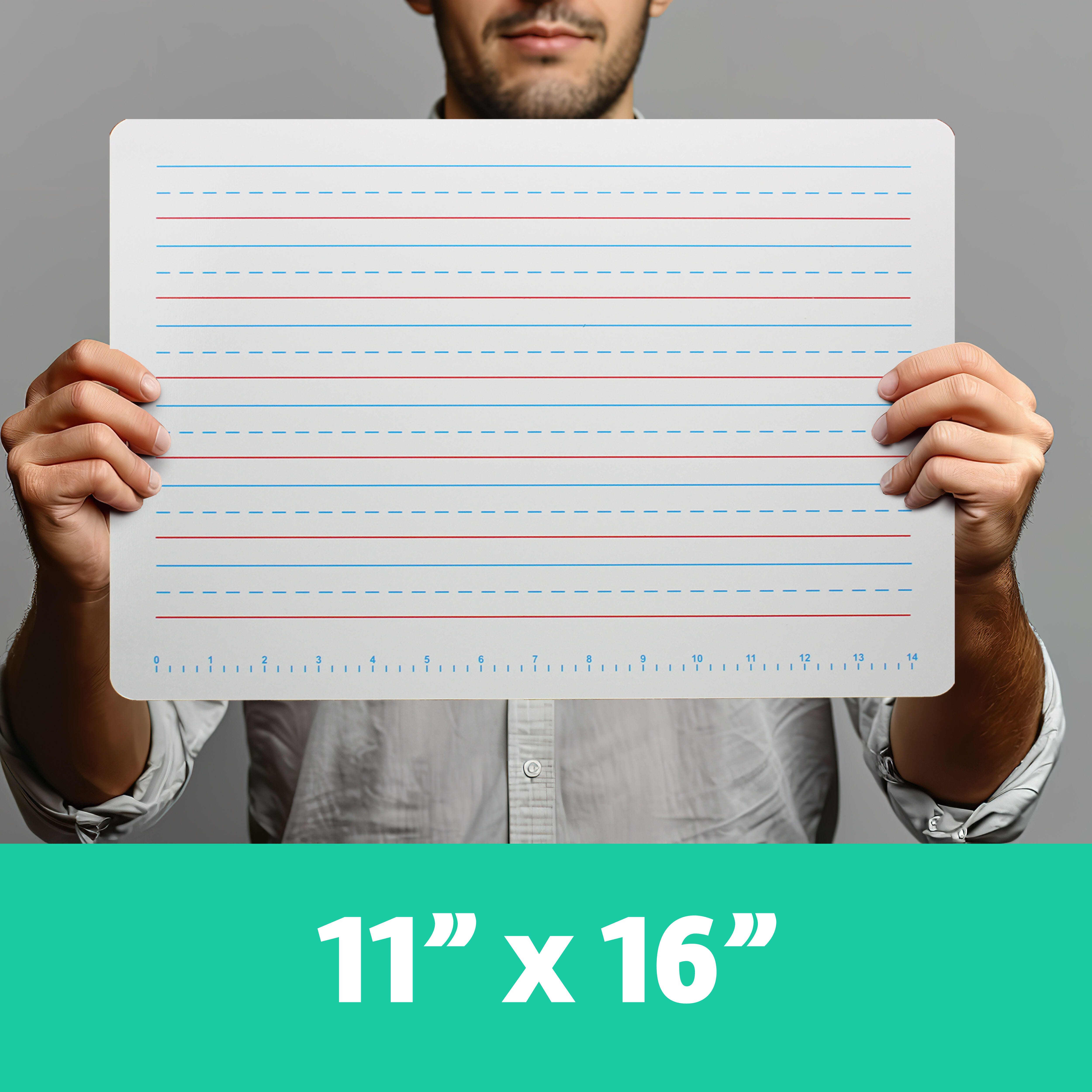These 11 x 16-inch Primary Handwriting Dry-Erase Boards make learning engaging for early learners. These bright white boards feature six sets of blue headlines, broken mid-line, and red baseline lines, each measuring 1 with 1/4 inches of blank descender space in between. A handy 14-inch ruler is included below the lines for added convenience. The non-ghosting dry-erase surface, along with smooth, rounded edges and corners, ensures comfort and safety. The warp and chip-resistant hardboard backing adds durability. Pack of 12.Features