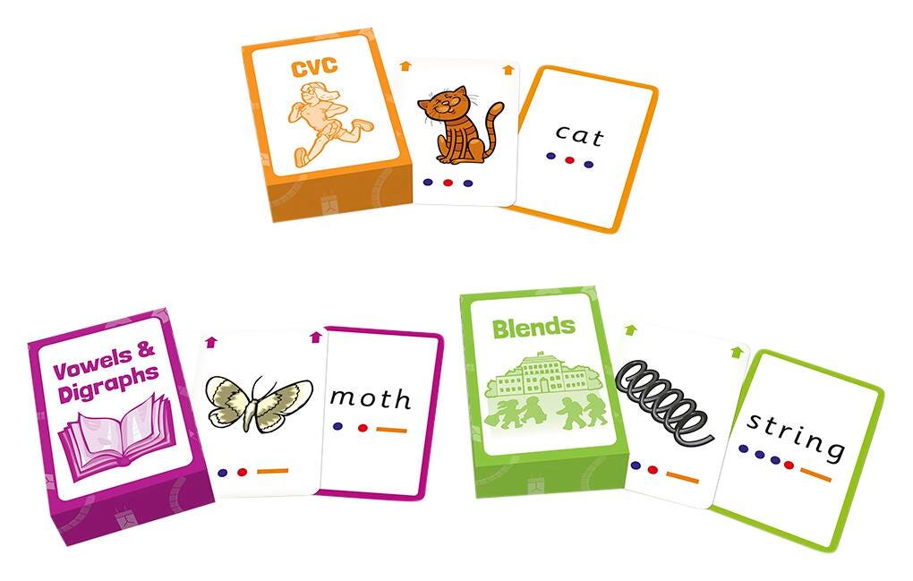 Description This set of flashcards includes 3 decks of 54 cards for teaching decoding (162 cards total). Includes common nouns to support language acquisition and each word has sound buttons to help decode it. Appropriate for ages 5 to 7 years old.Features Perfect activity for independent or guided learning Teaches fast, automatic recall Topics include CVC (consonant-vowel-consonant), vowels and digraphs and blends